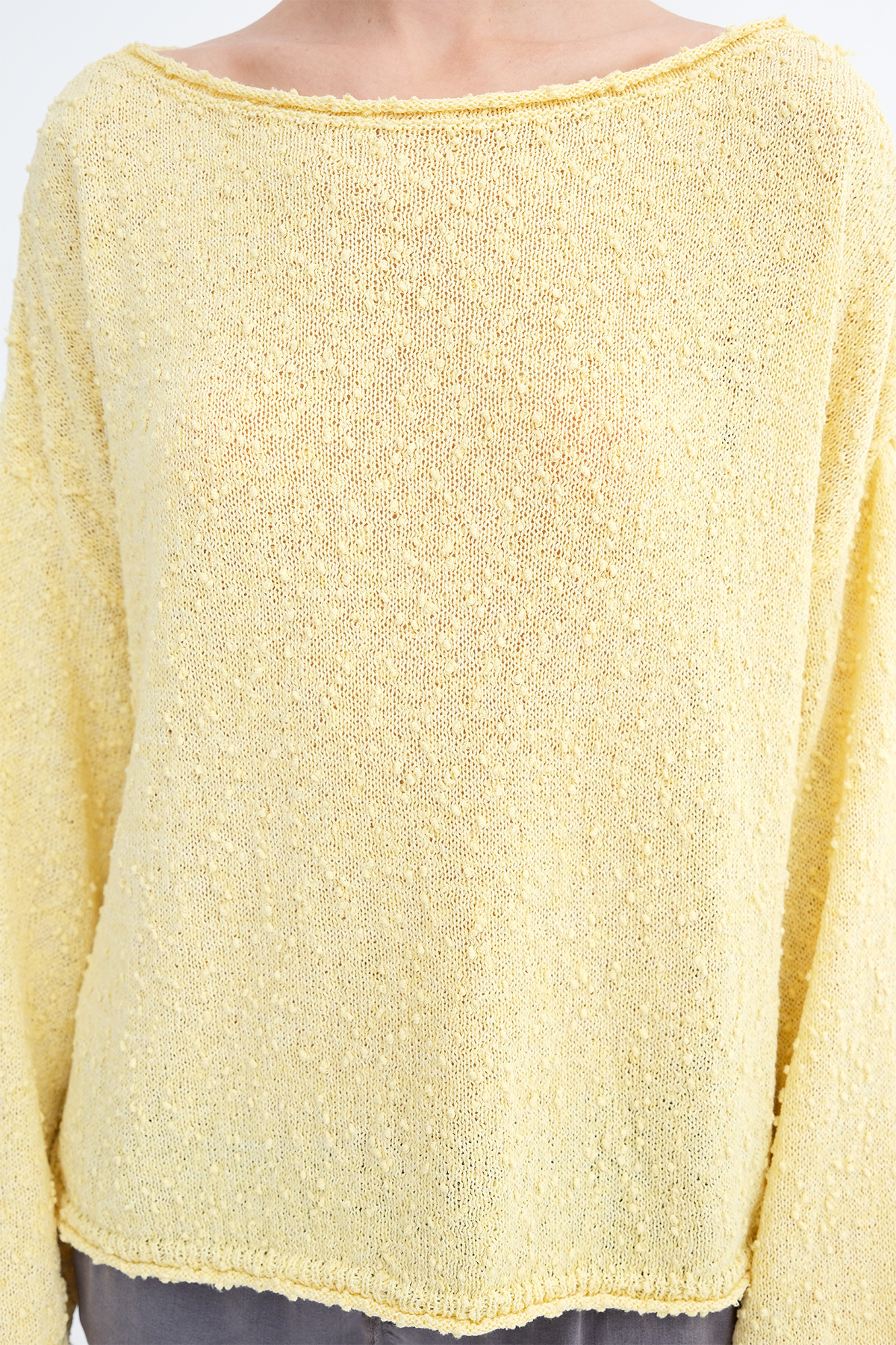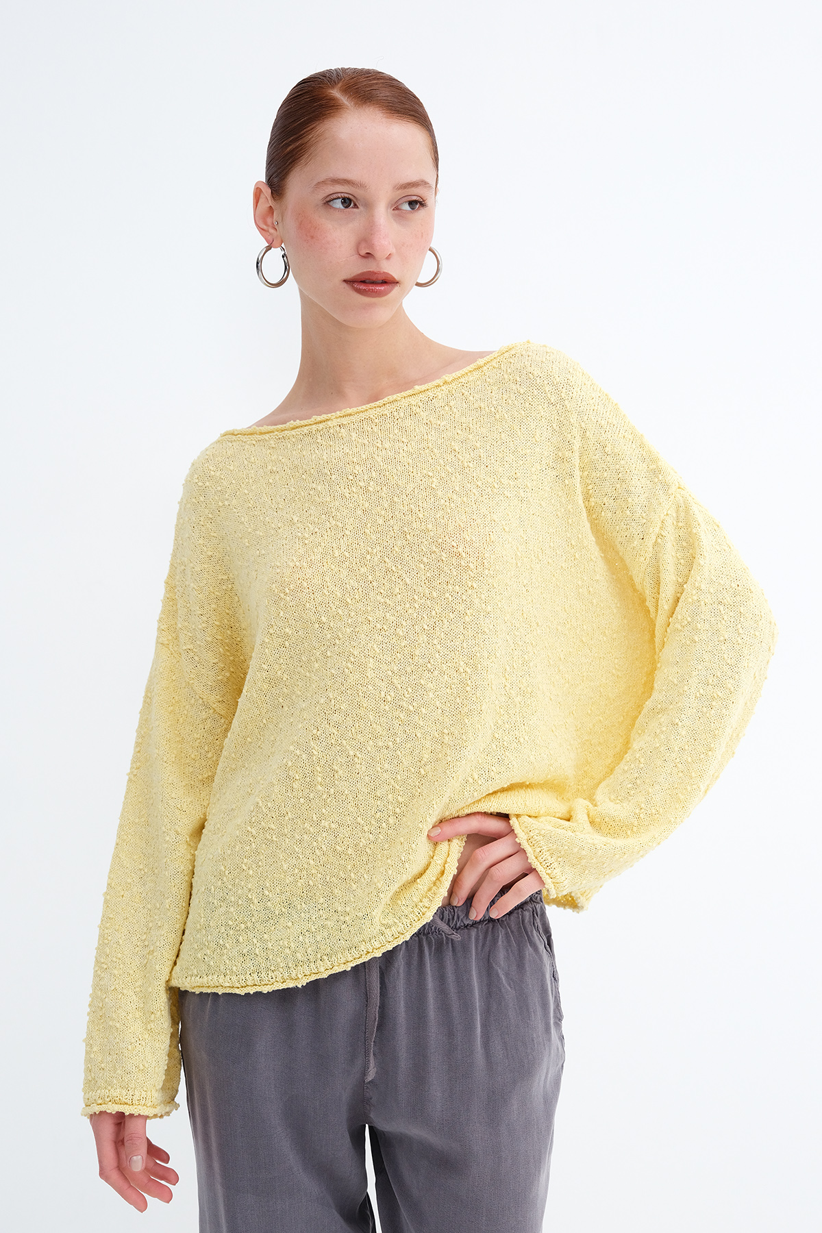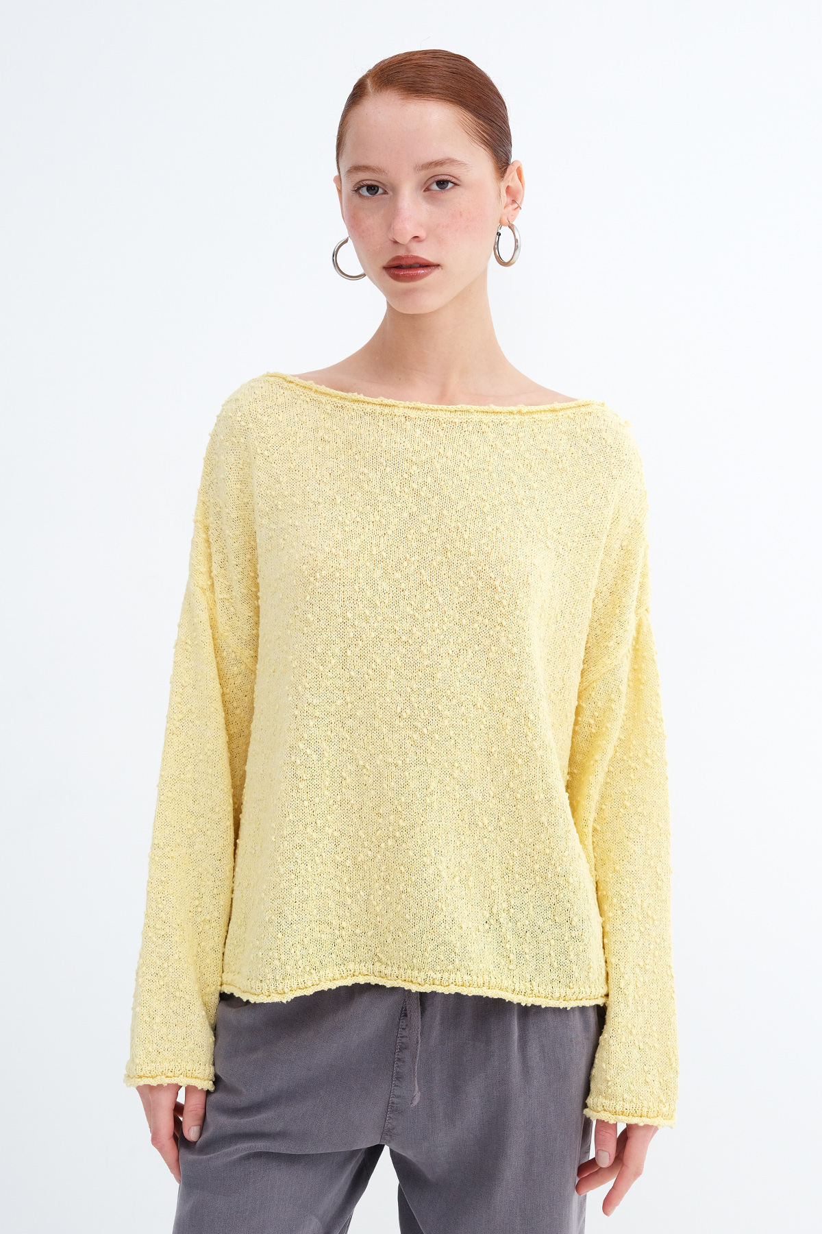 * Kayık yaka, uzun kollu,
