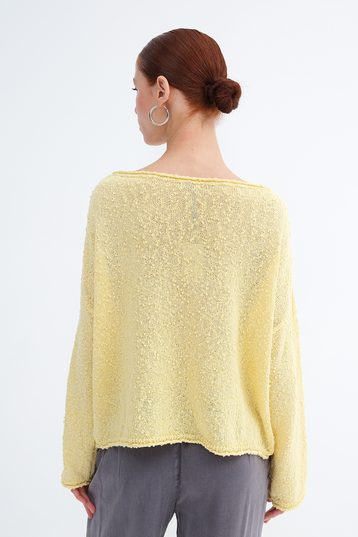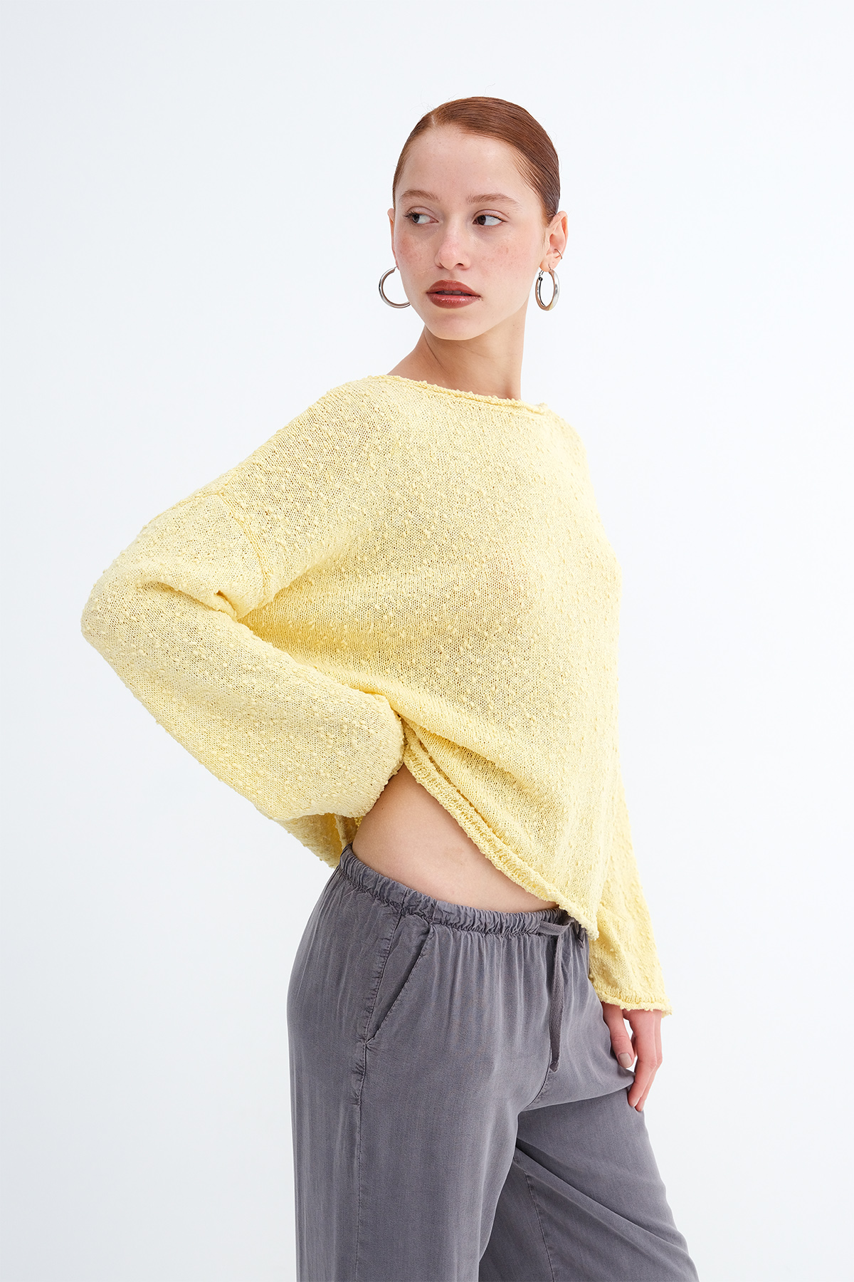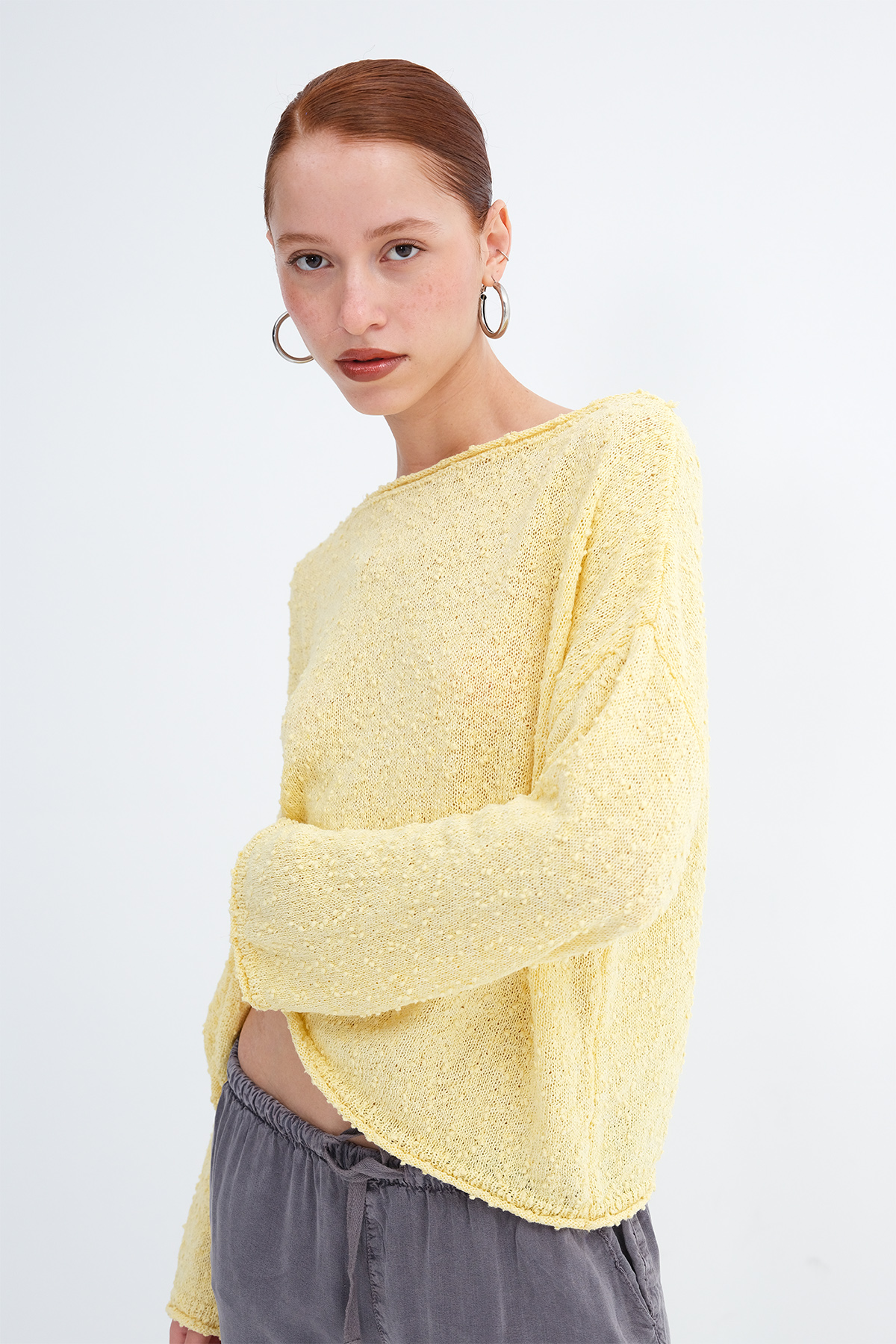 * Kayık yaka, uzun kollu,