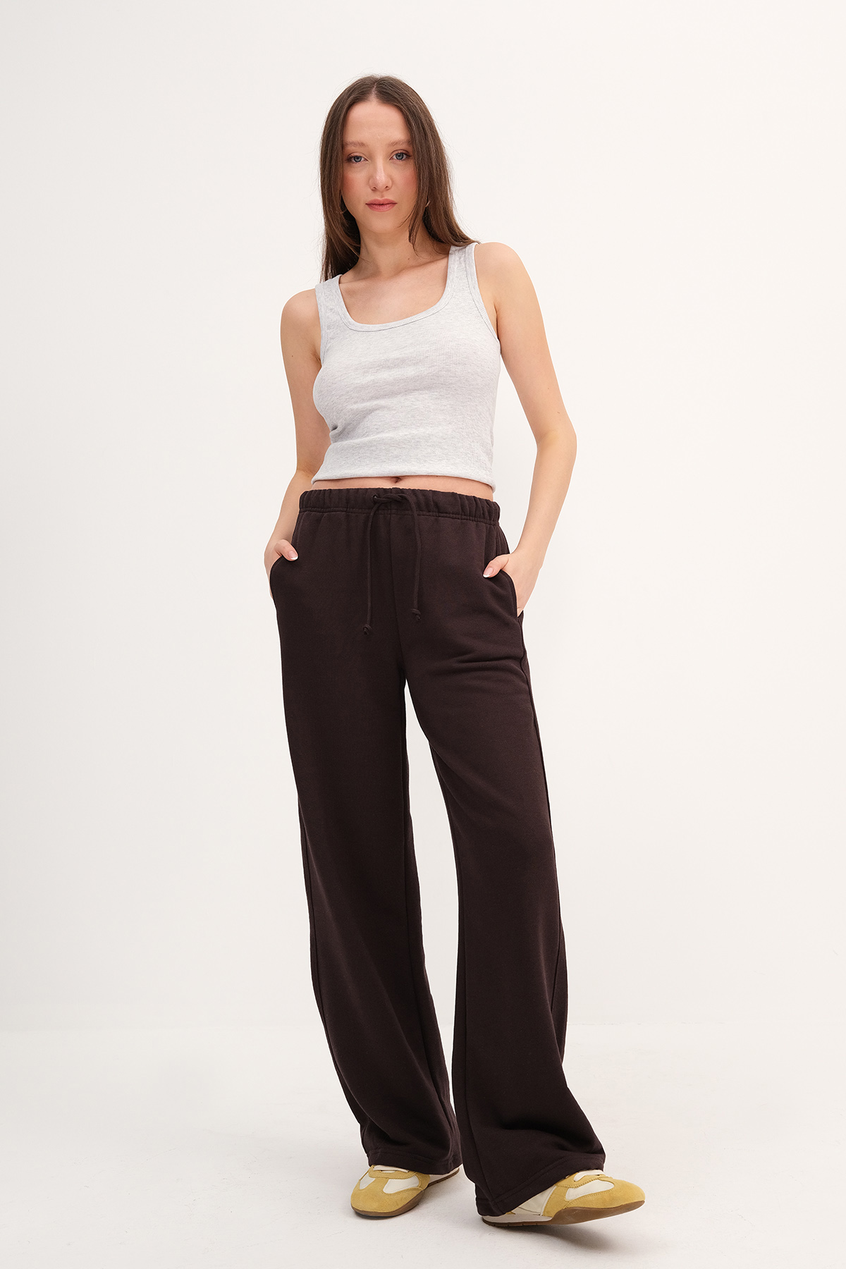 * Normal bel, beli lastikli, belden ip bağlamalı,* Yandan cepli, düz renk,* Rahat kalıp, wide leg eşofman,* Ürün içeriği: %50 Pamuk % 50 Polyester* Manken üzerindeki ürün 36/S bedendir.* Numune beden ölçüleri: Boy: 105 cm Bel: 66 cm* Basen:110 cm İç bacak boyu: 77 cm (1-3 cm değişiklik gösterebilir)* Ürün çekimlerinde renkler, ışık farklılığından dolayı değişkenlik gösterebilir.