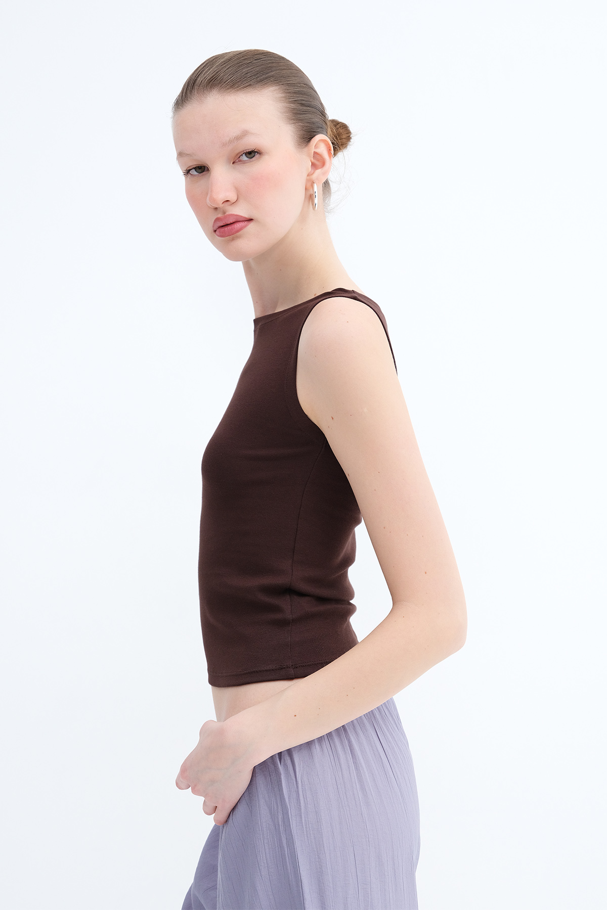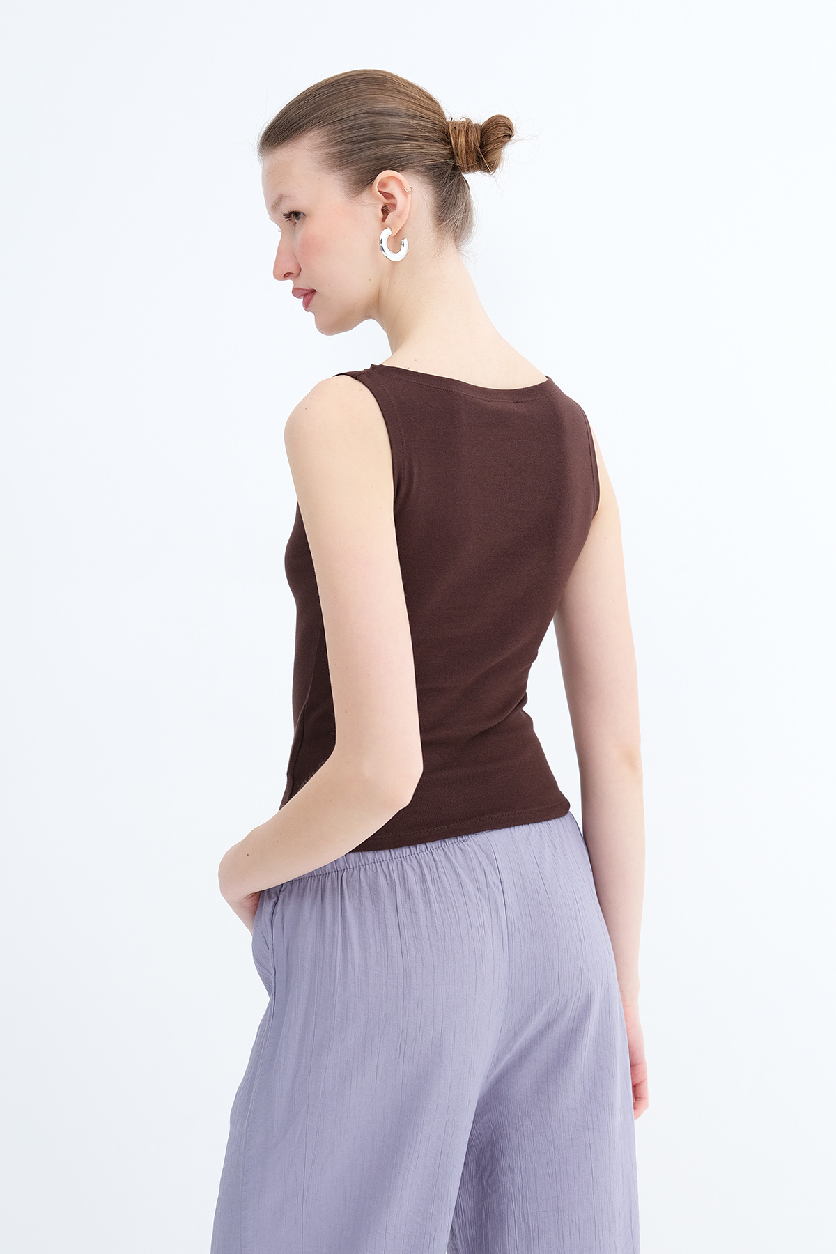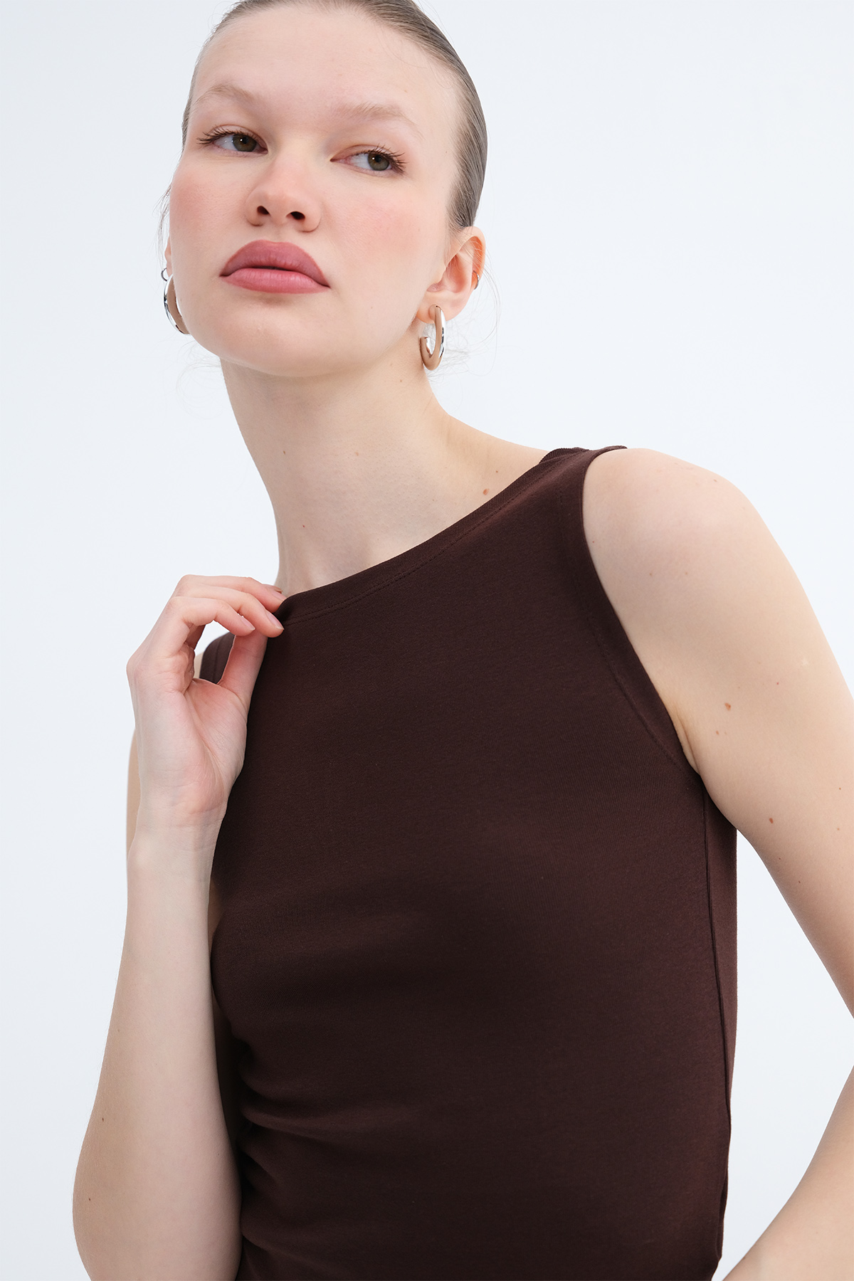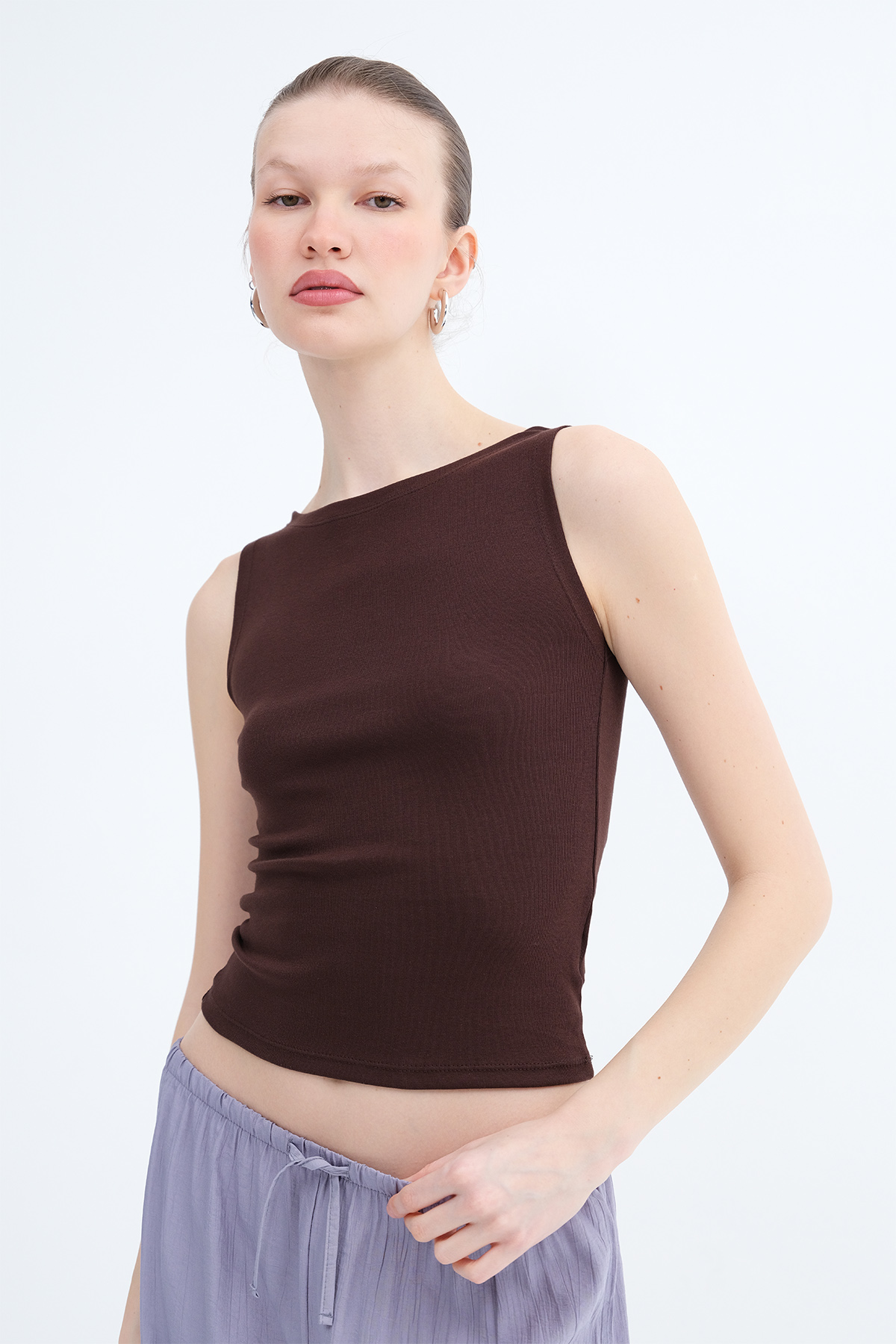 * Kayık yaka, kolsuz, düz renk, vücudu saran,