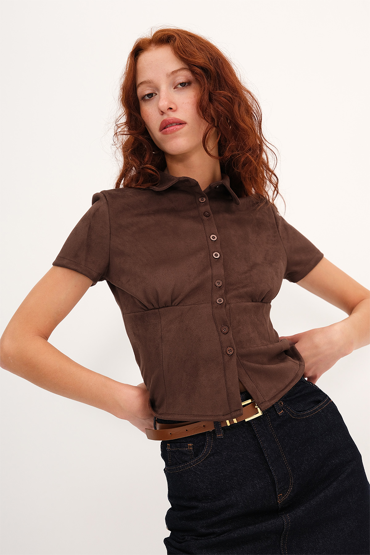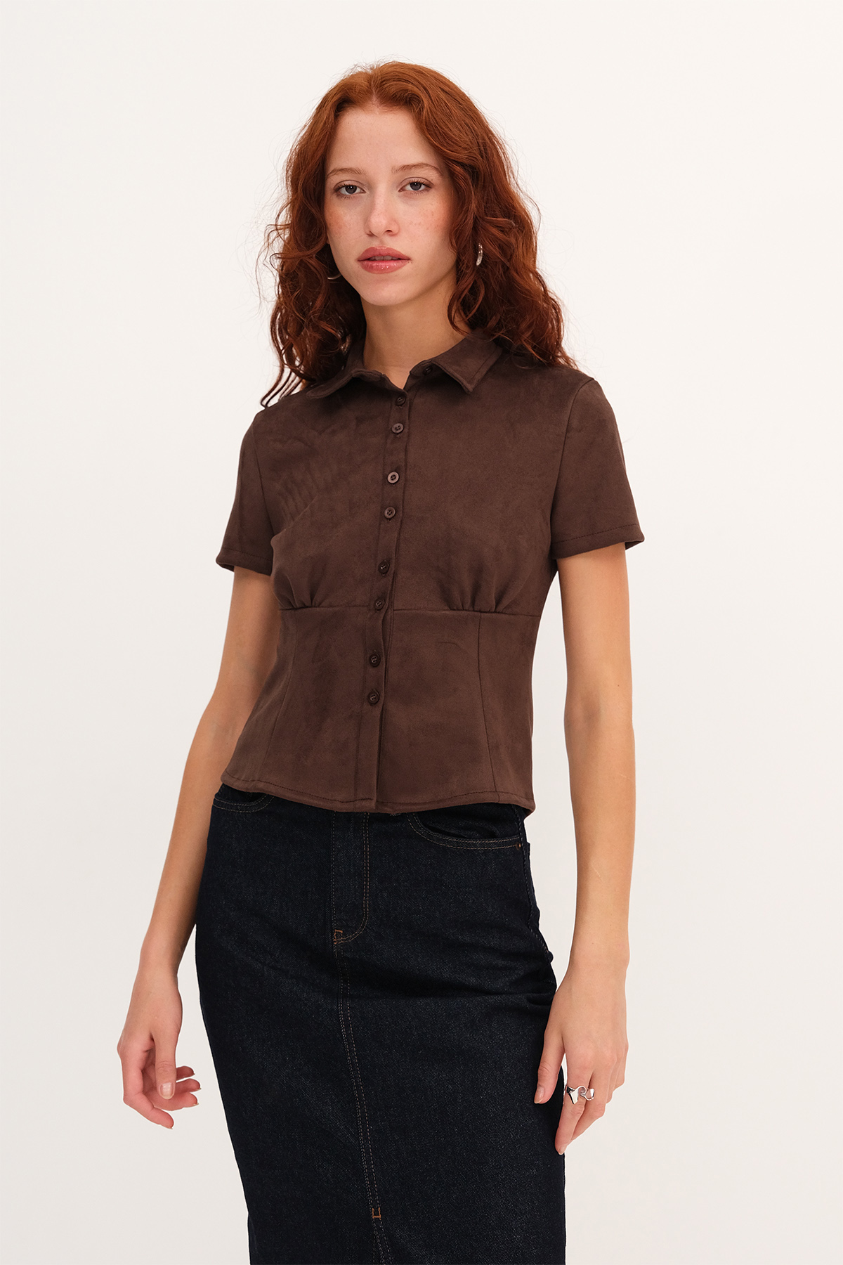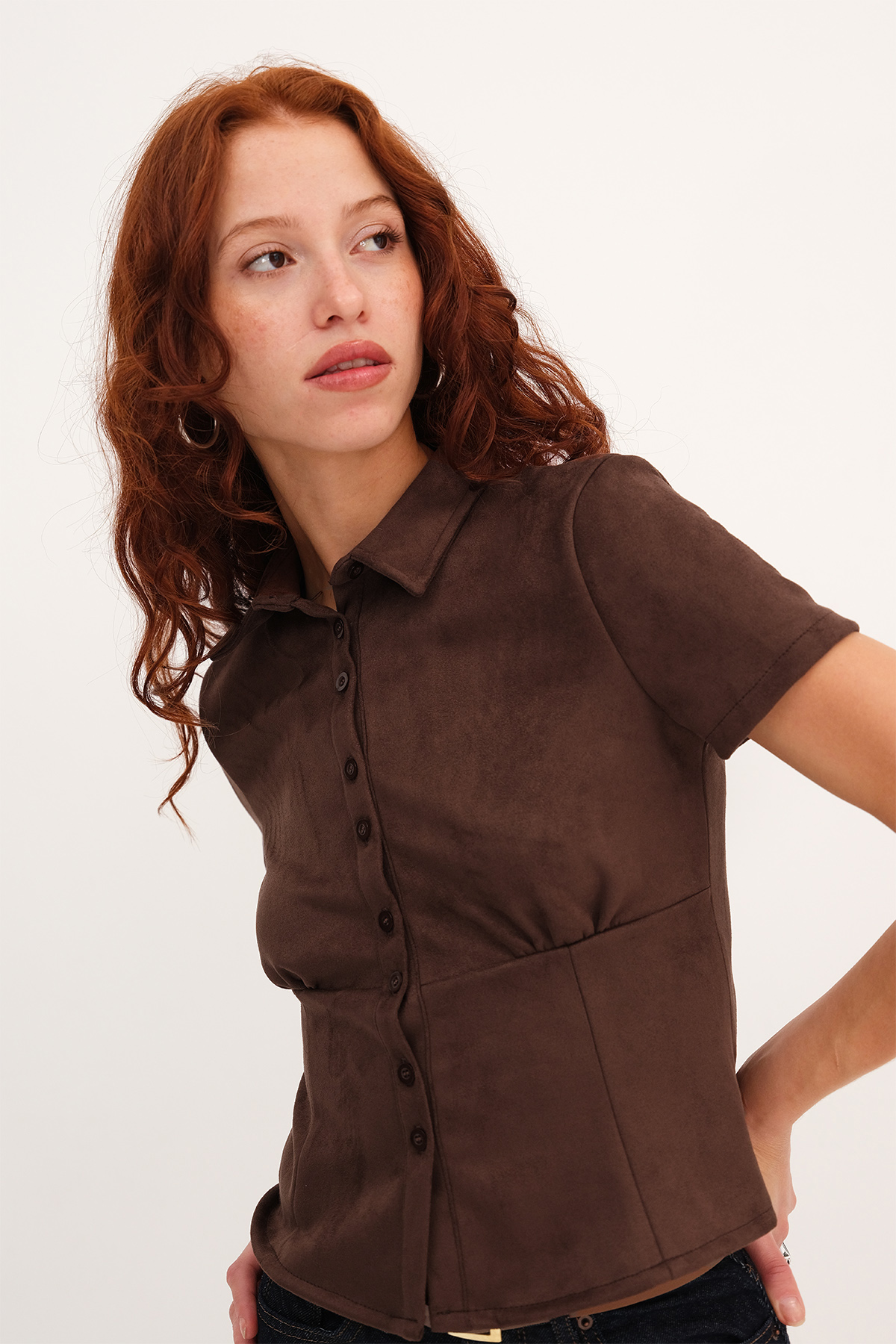 * Gömlek yaka, kısa kollu,* Düğmeli, düz renk,* Vücuda oturan, süet gömlek,* Ürün içeriği: %100 Polyester,* Manken üzerindeki ürün 36/S bedendir.* Numune Beden Ölçüleri: Boy: 50 cm Göğüs: 60 cm Kol Boyu: 15 cm (1-3 cm arasında değişiklik gösterebilir)* Ürün çekimlerinde renkler, ışık farklılığından dolayı değişkenlik gösterebilir.