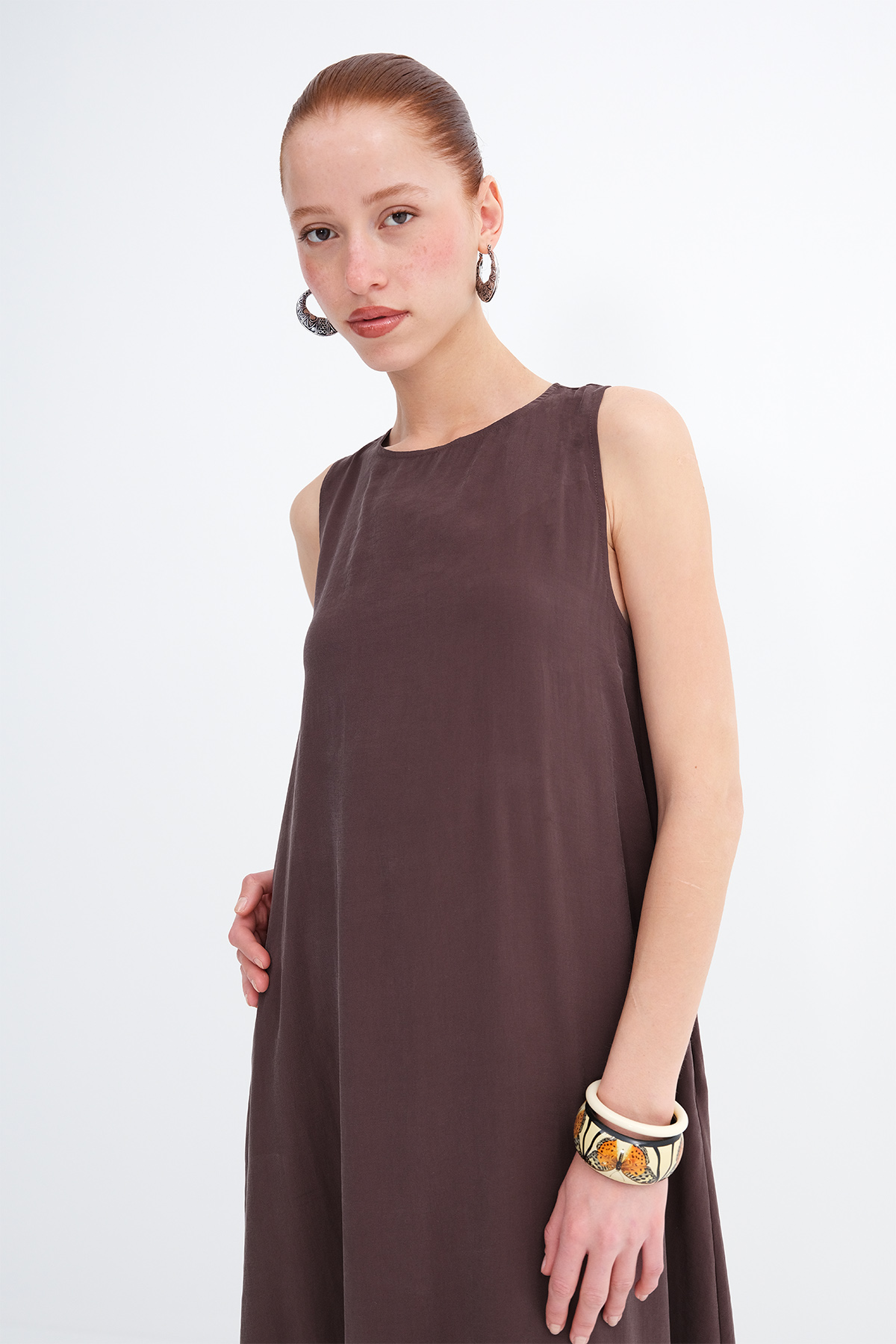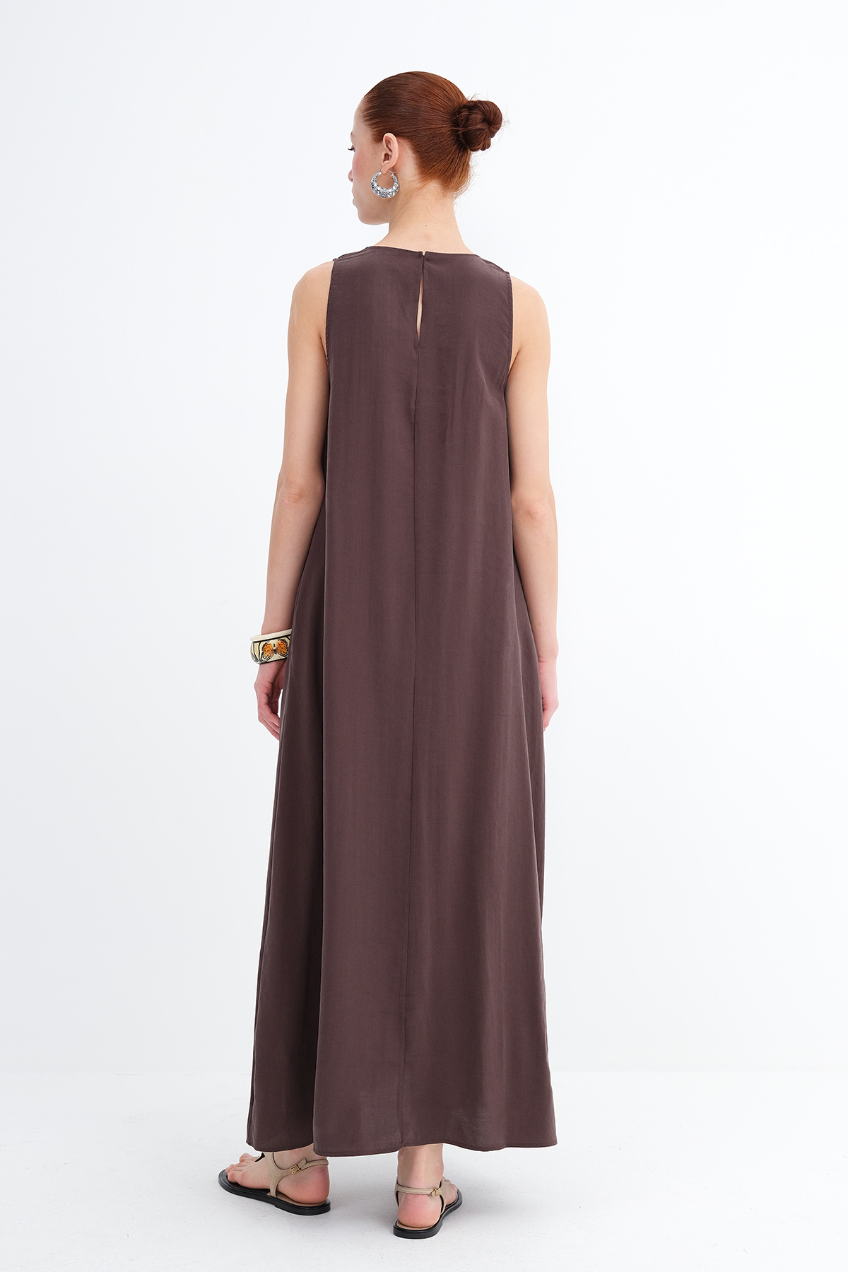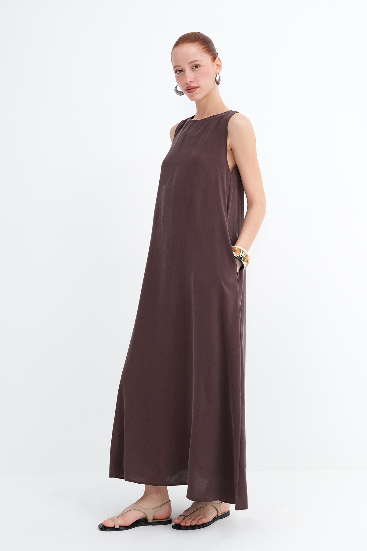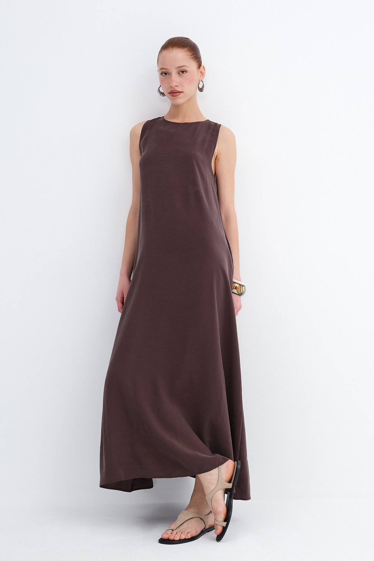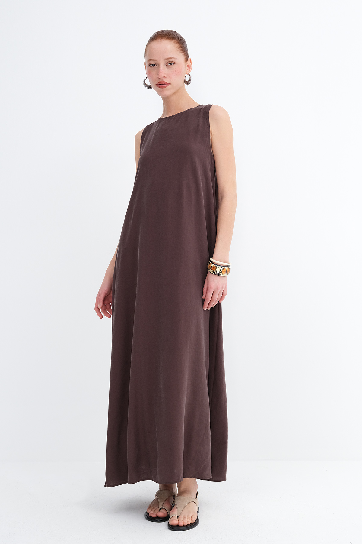 * Düz renk, astarsız uzun elbise,