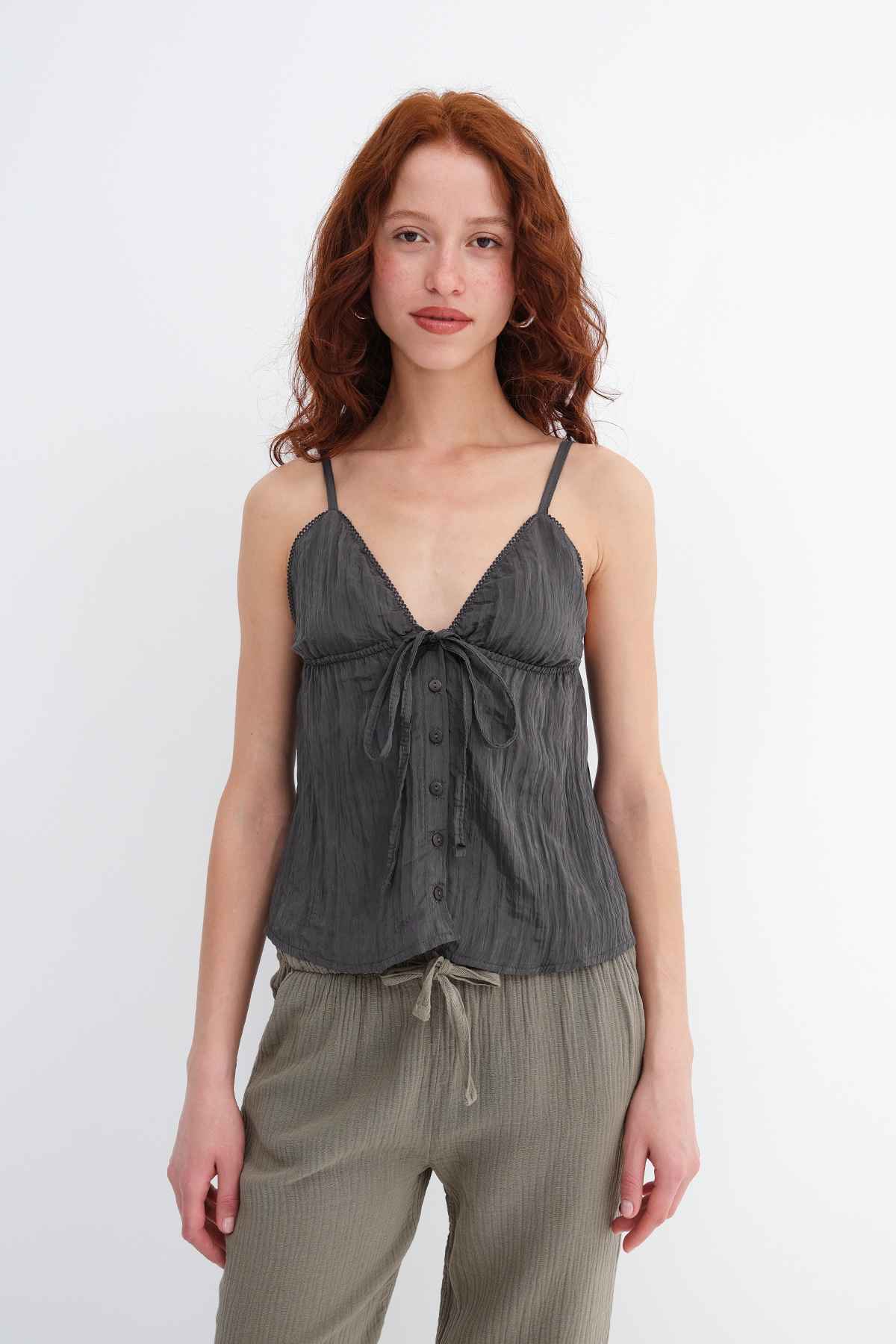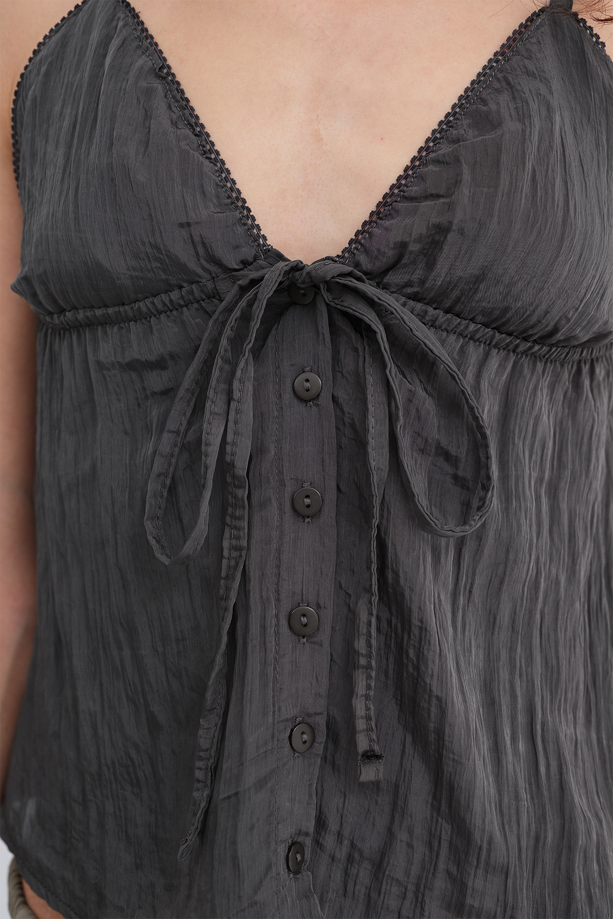 * Göğüs kısmı lastikli, bağlamalı, düğmeli bluz,