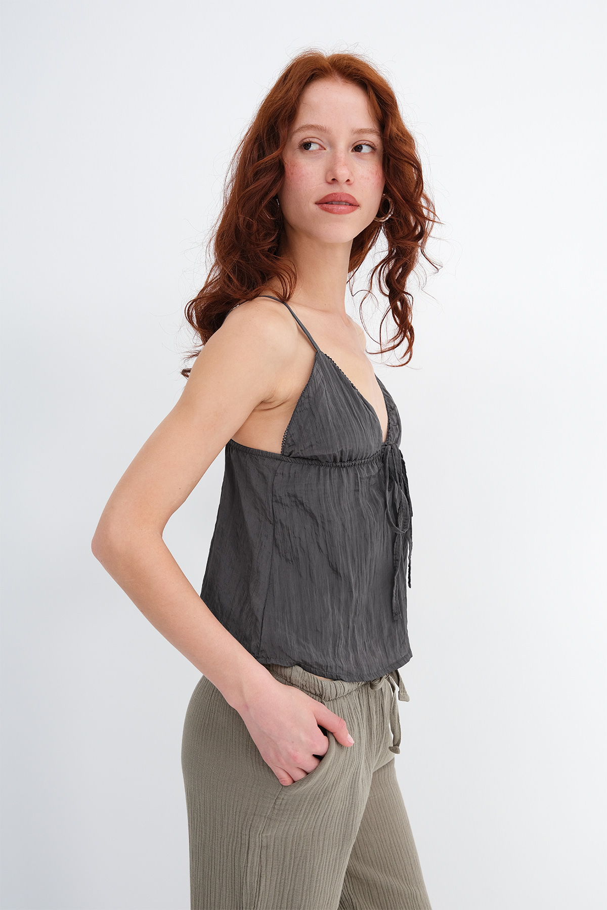 * V yaka, ayarlanabilir askılı, düz renk,