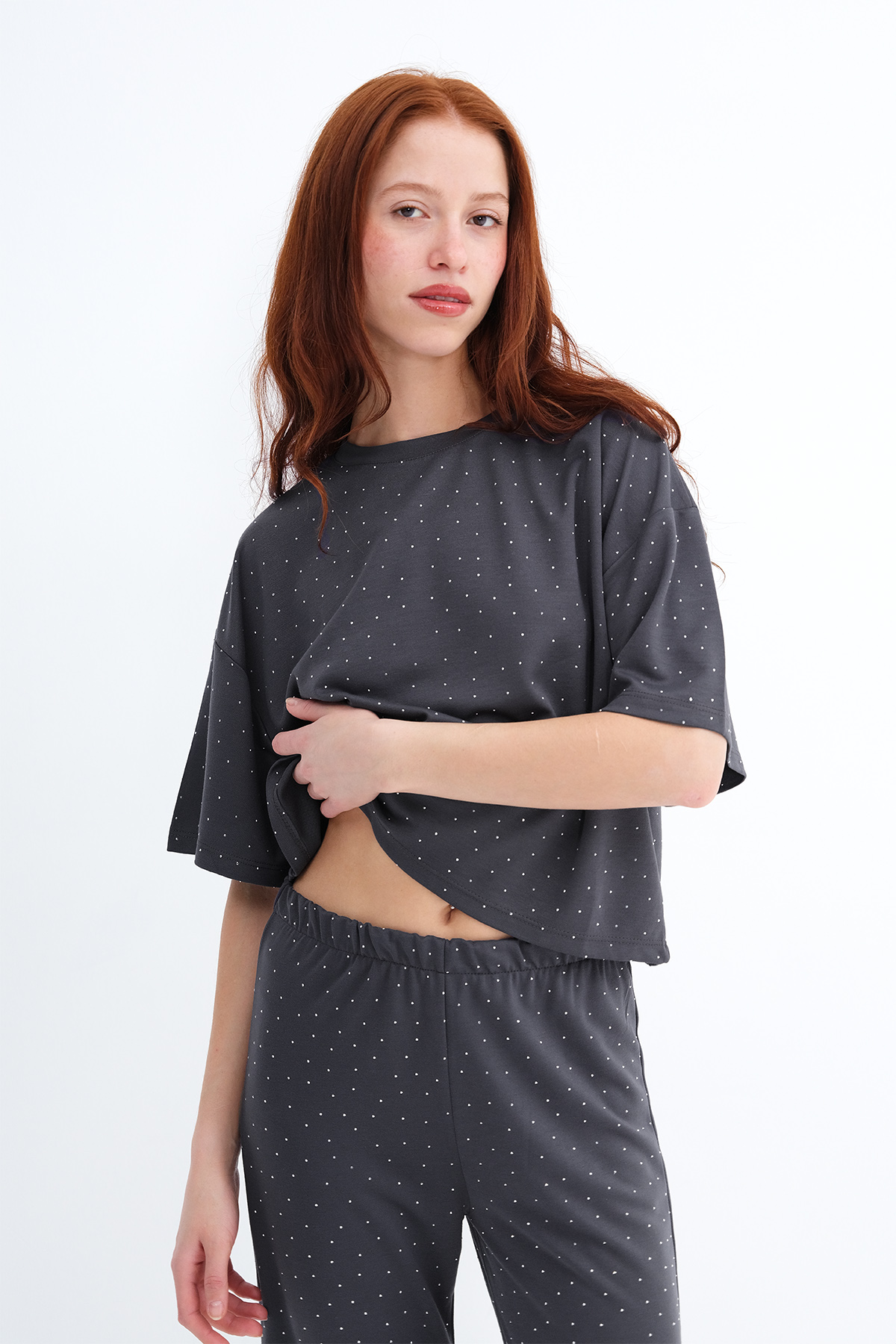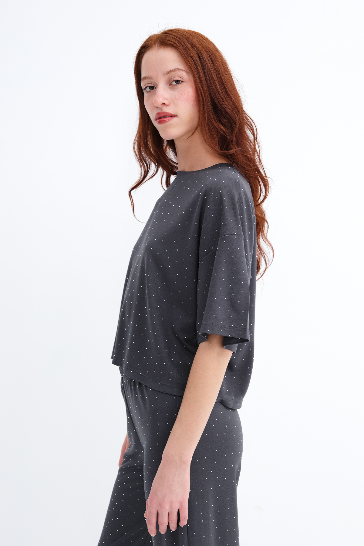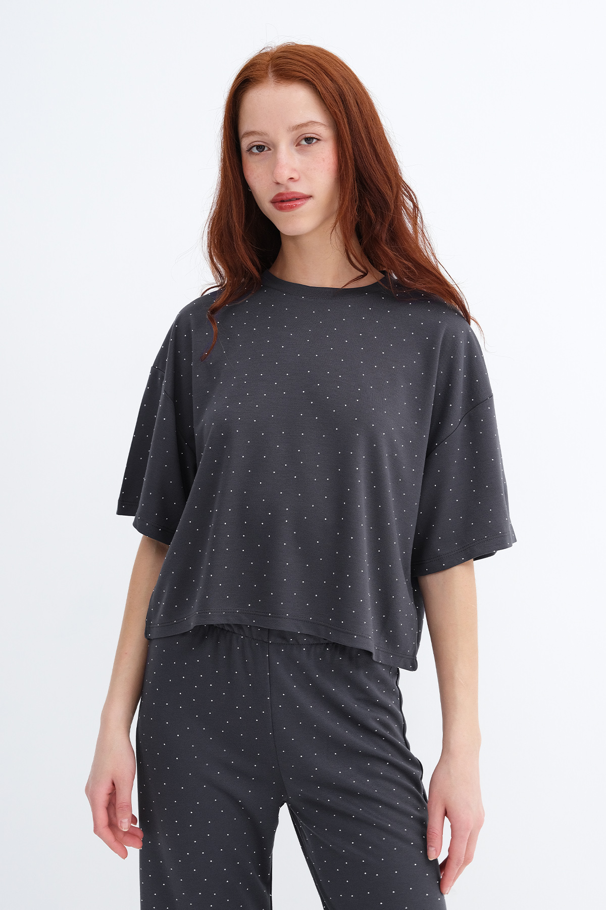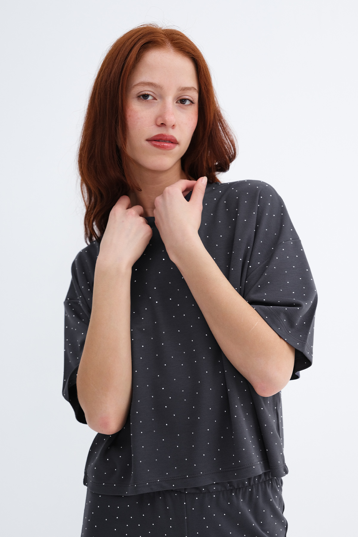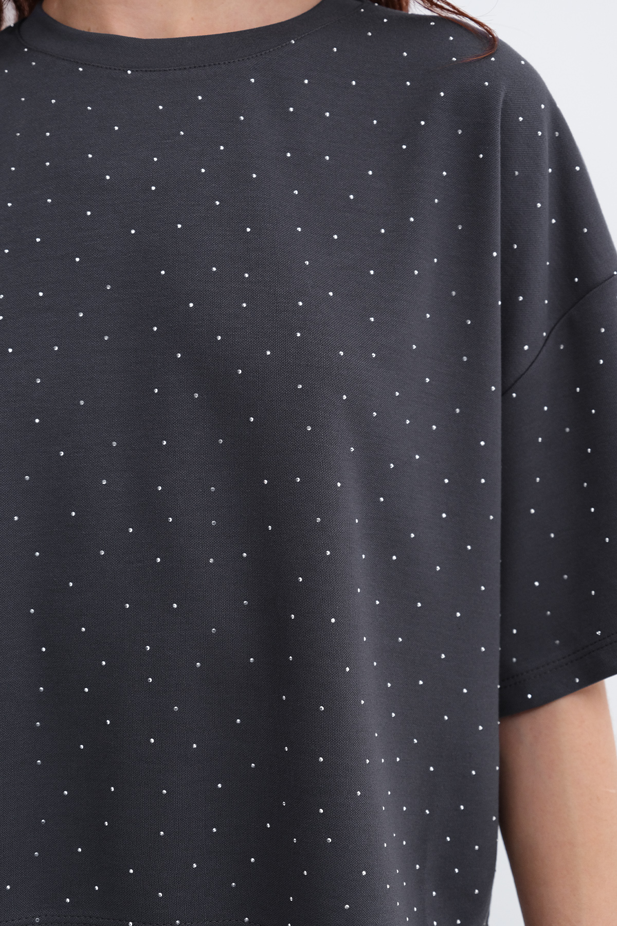 * Taşlı, düz renk, rahat kalıp t-shirt,
