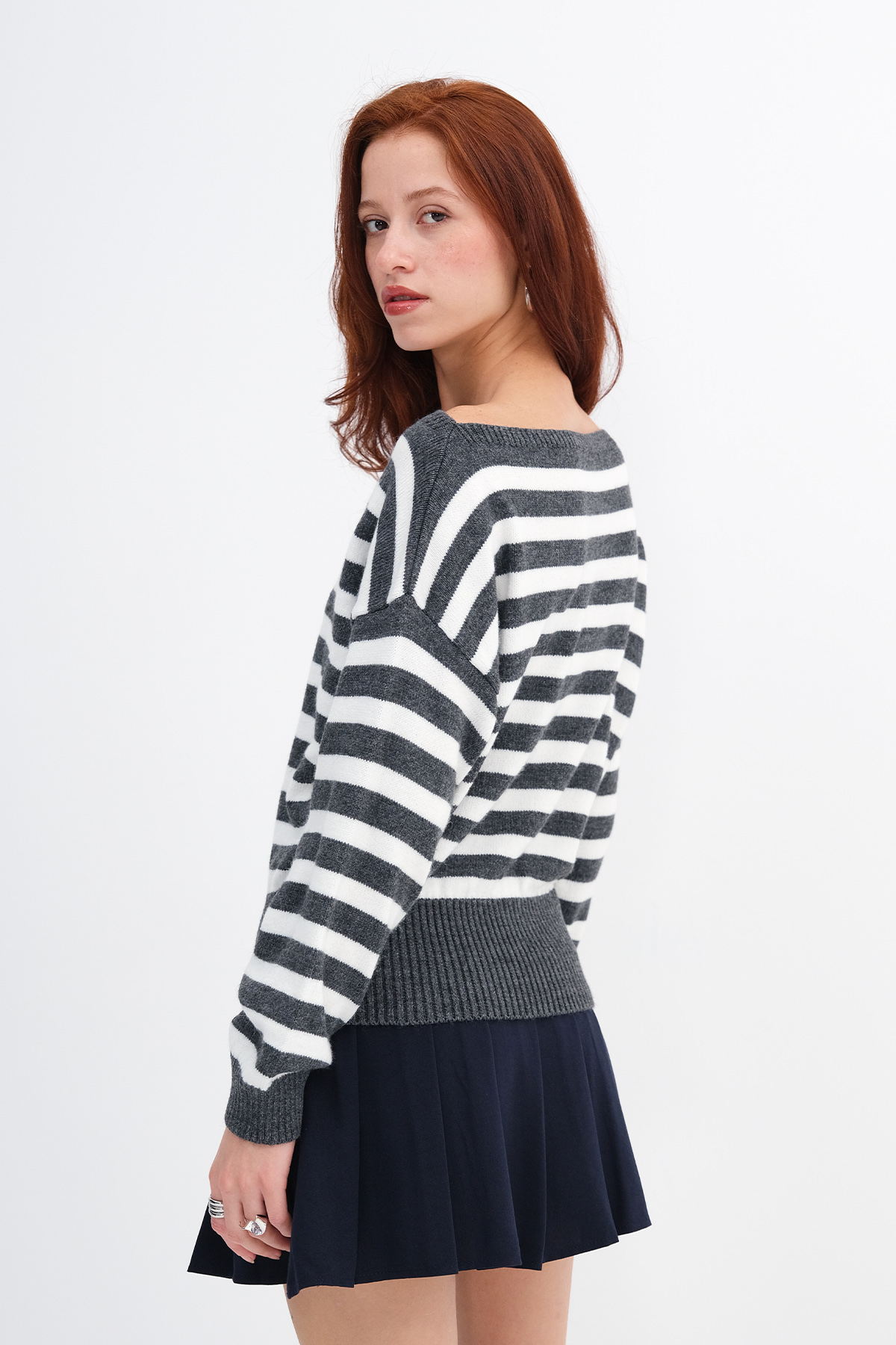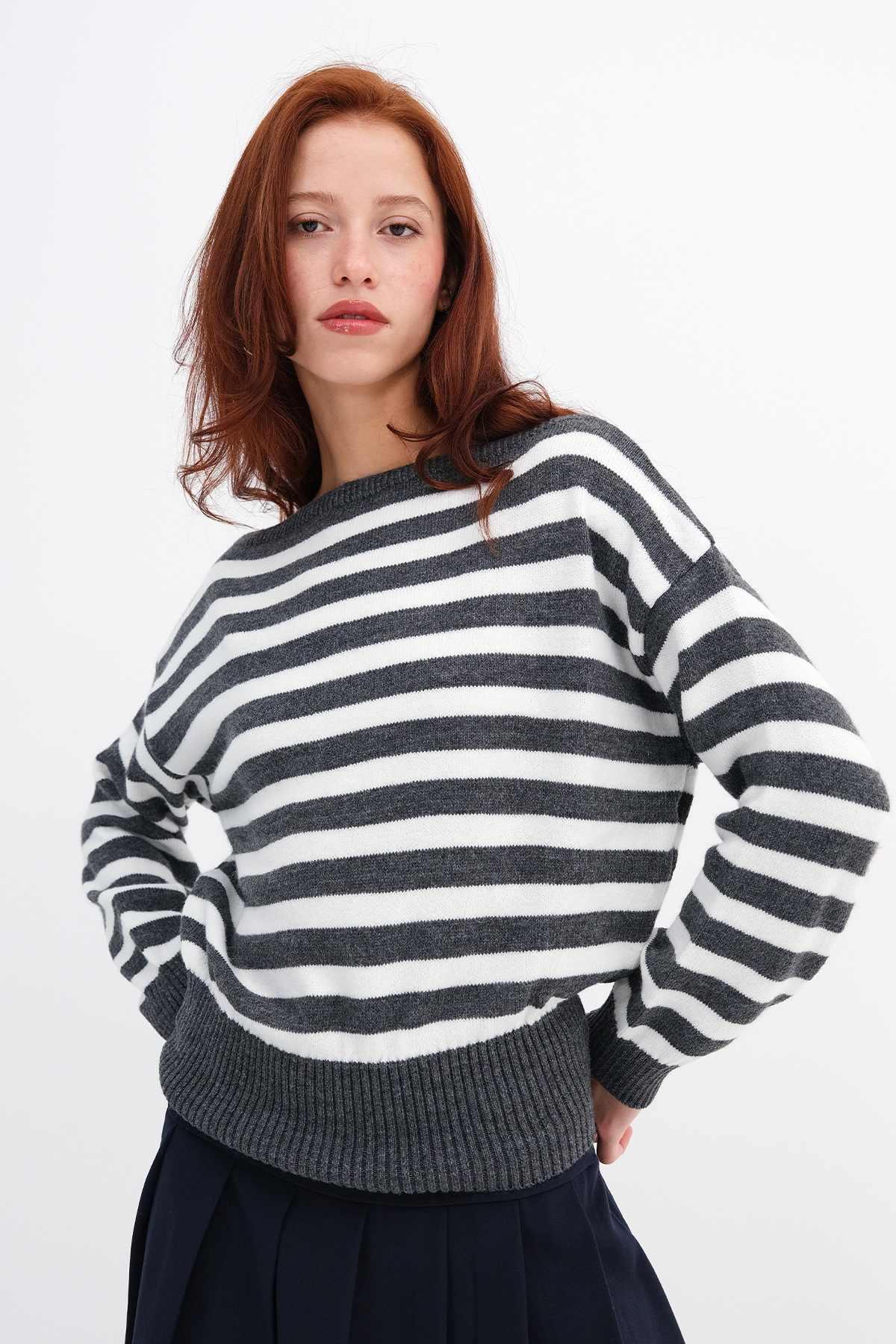 * Çizgili, bel kısmı lastikli, triko kazak,