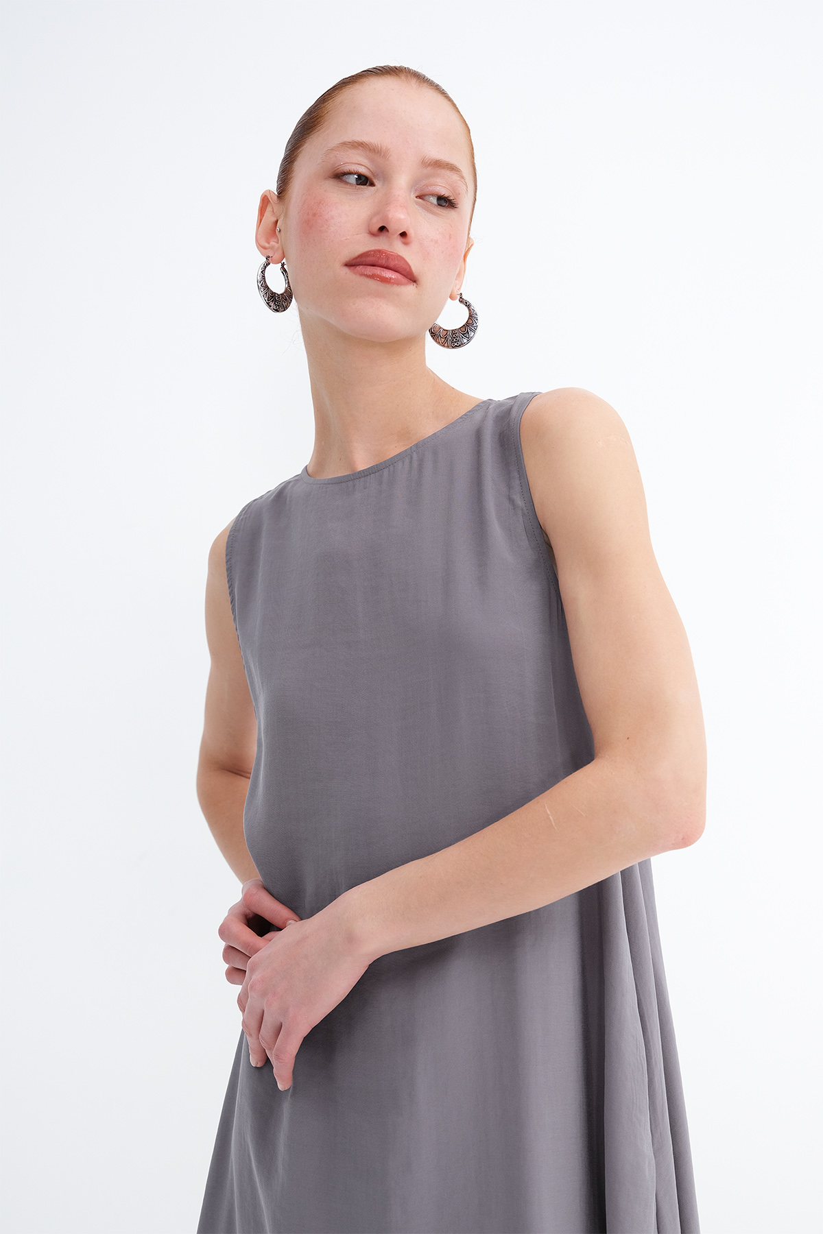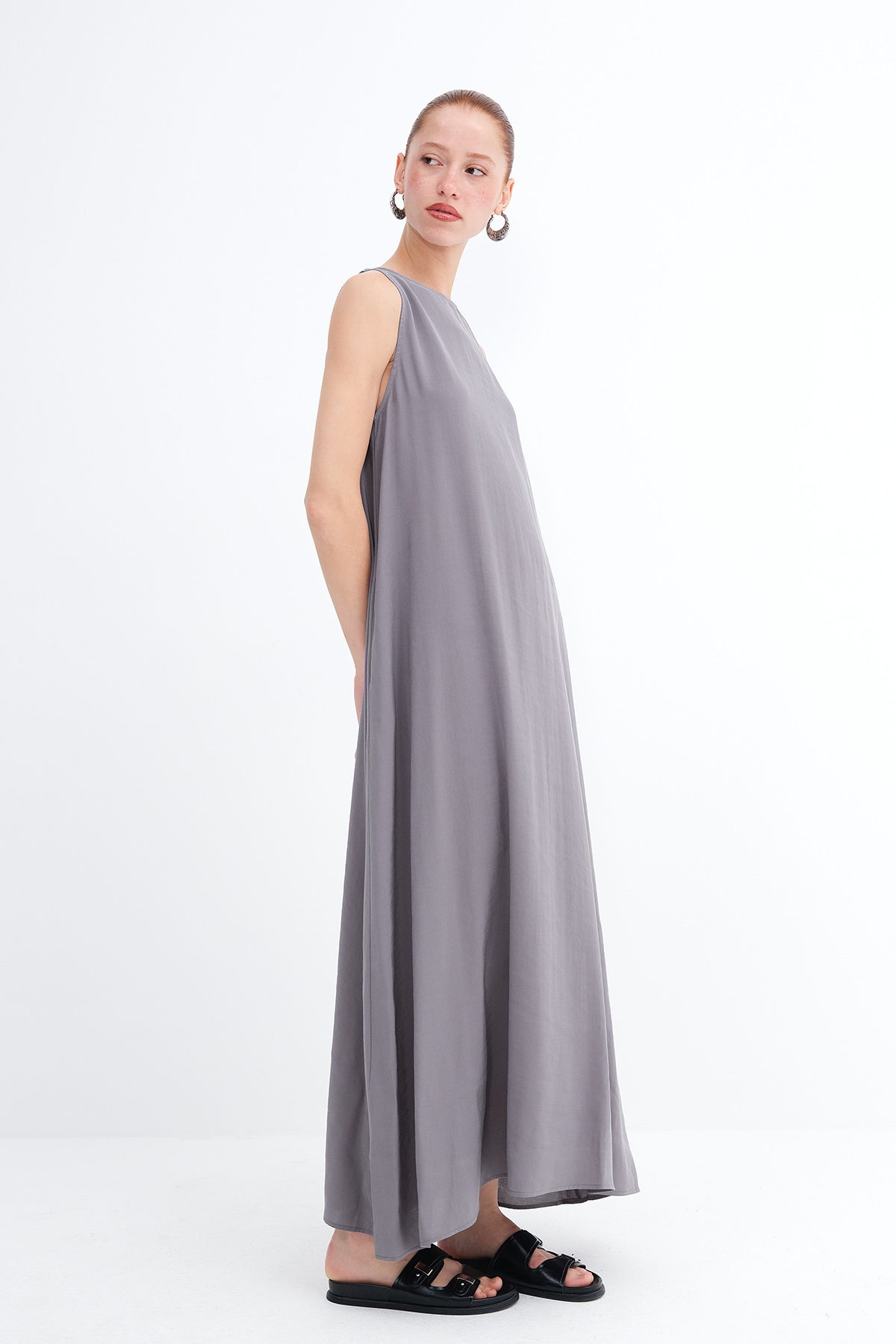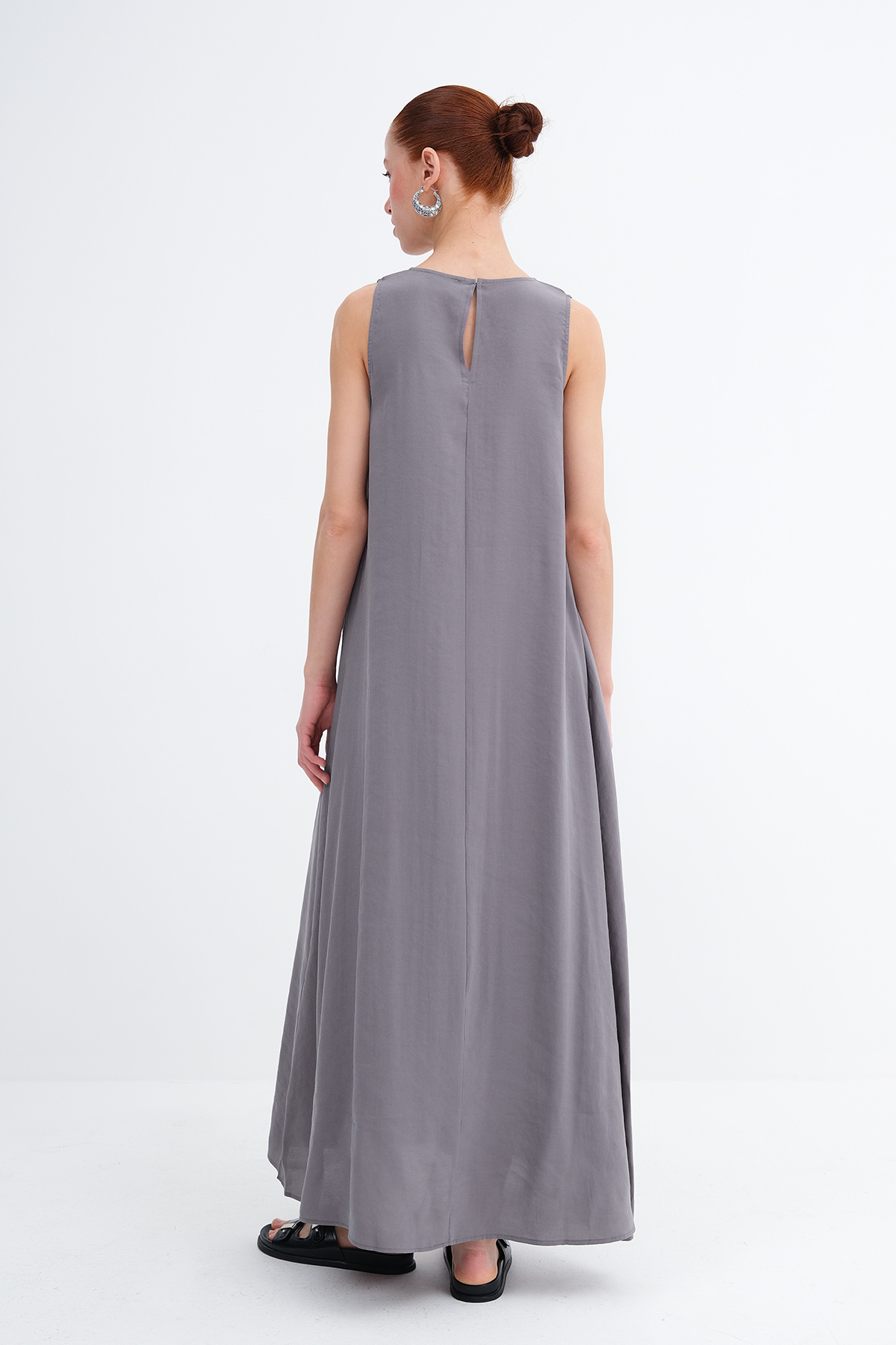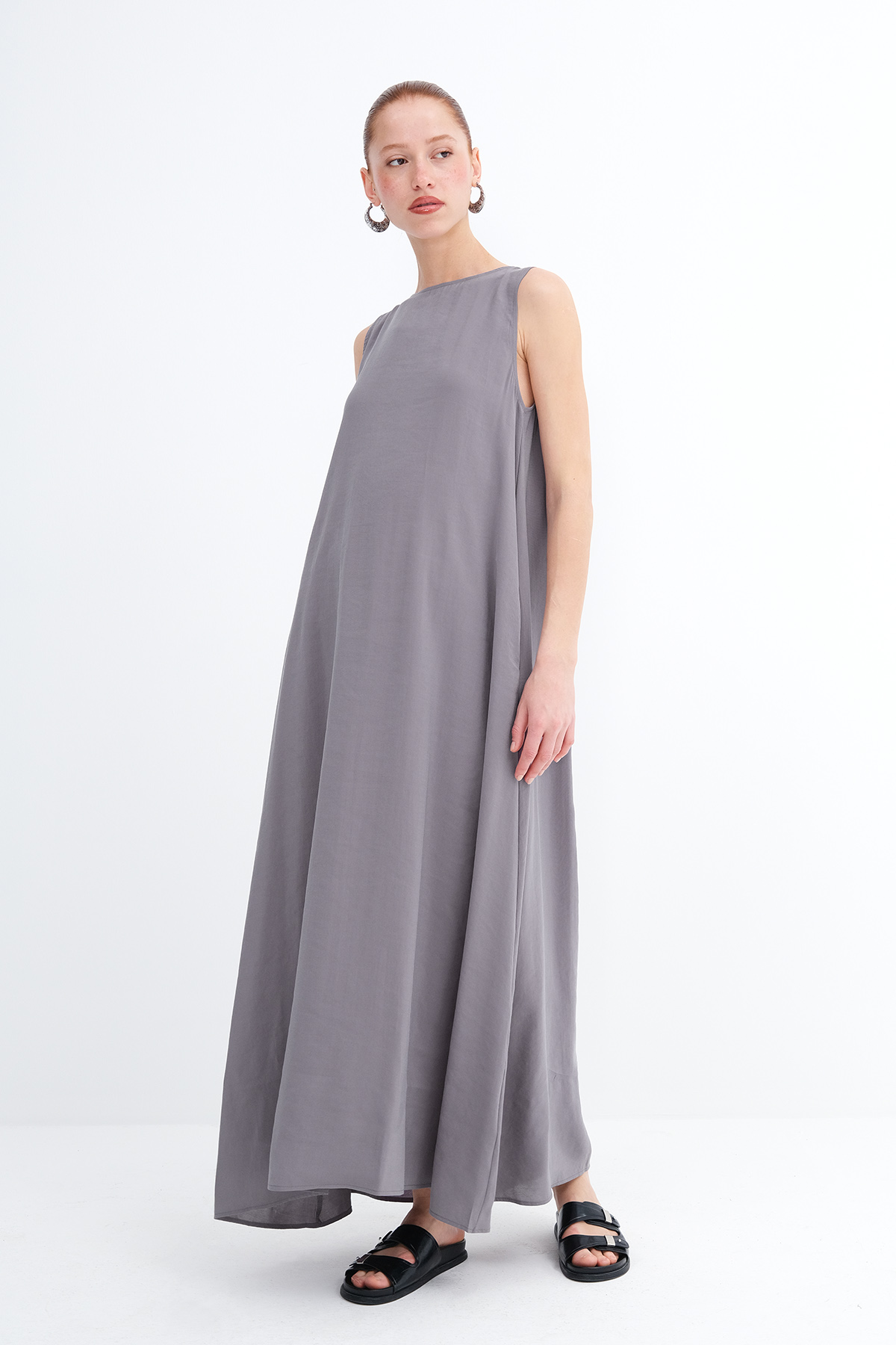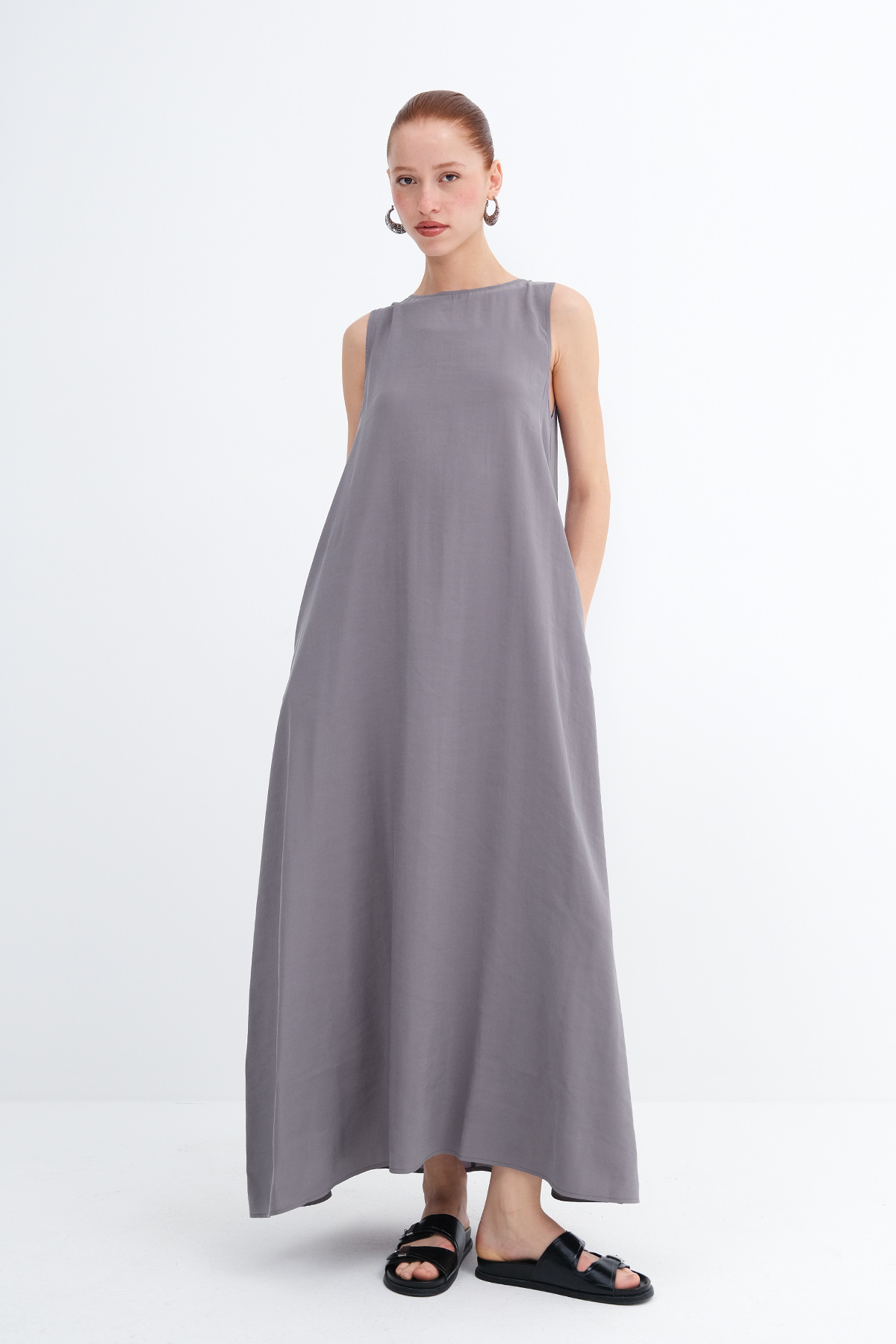 * Düz renk, astarsız uzun elbise,