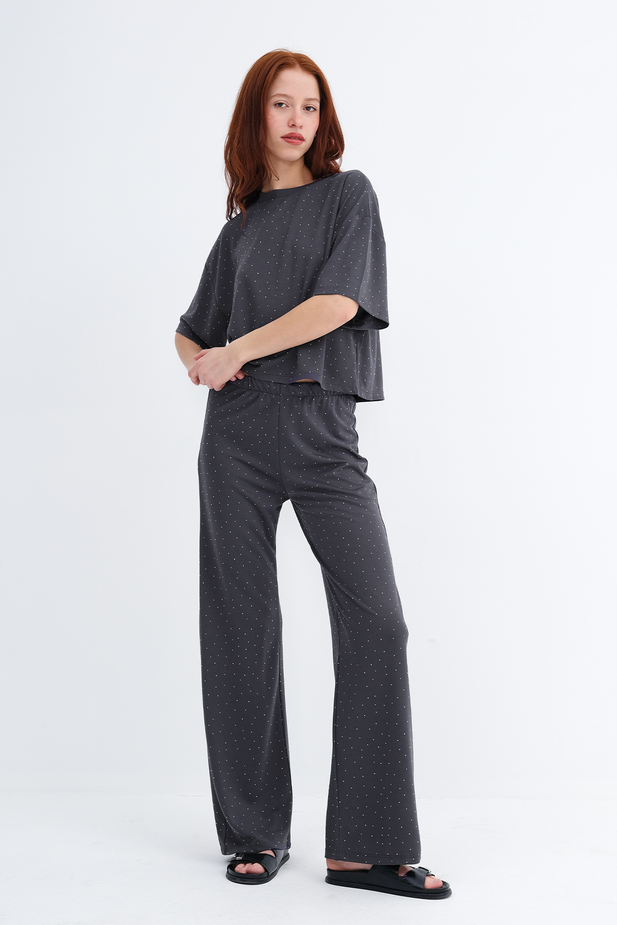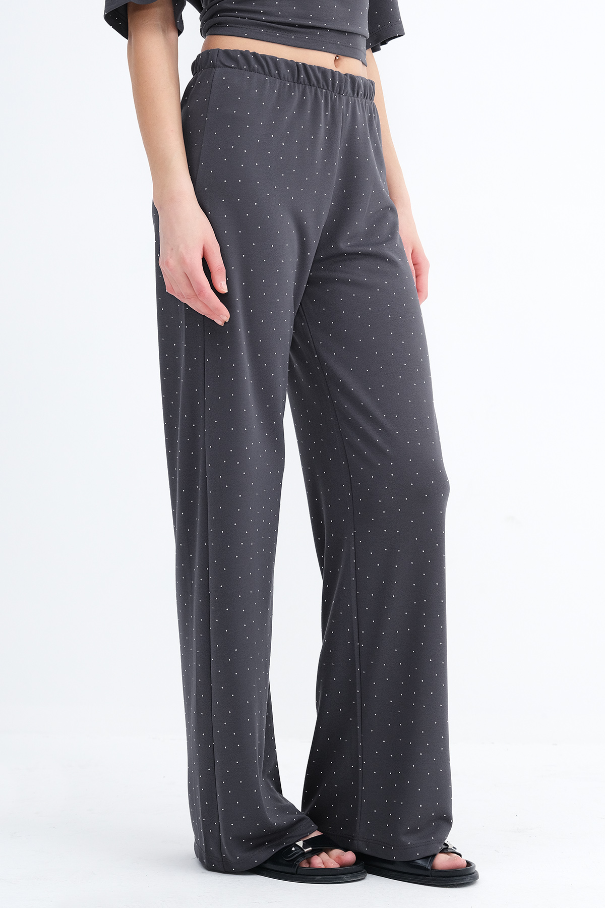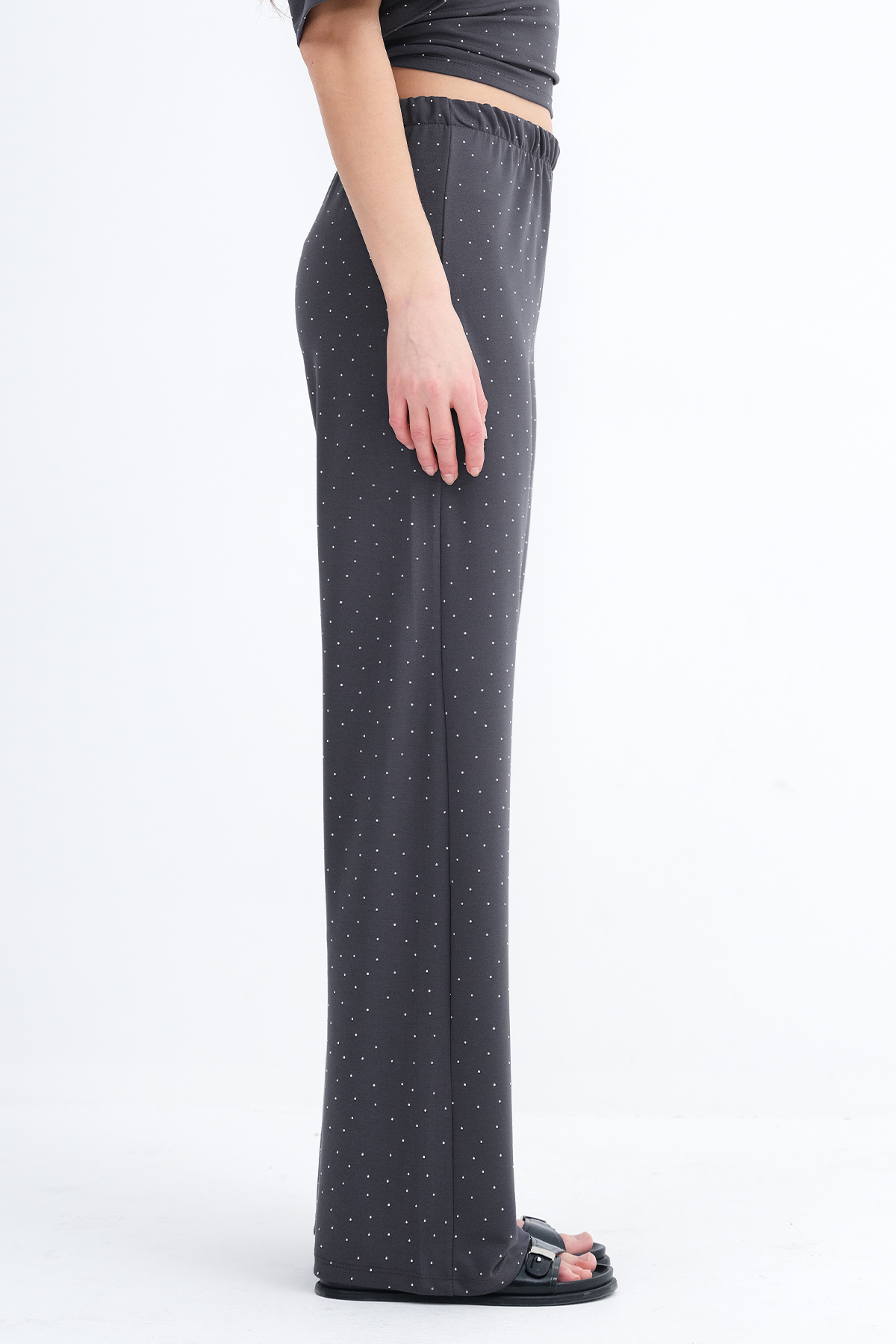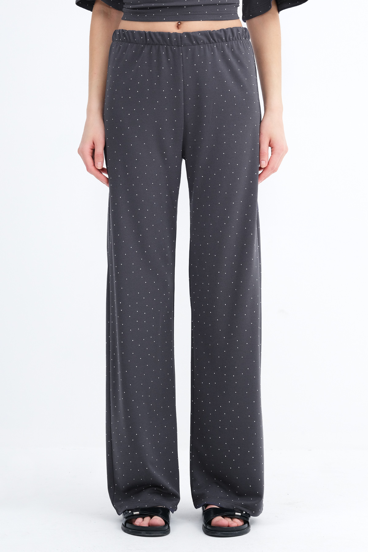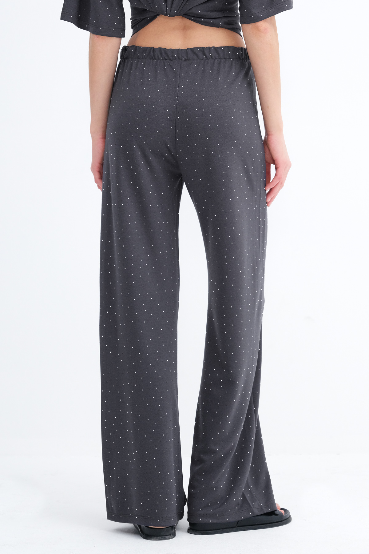 * Taşlı, wide leg pantolon,