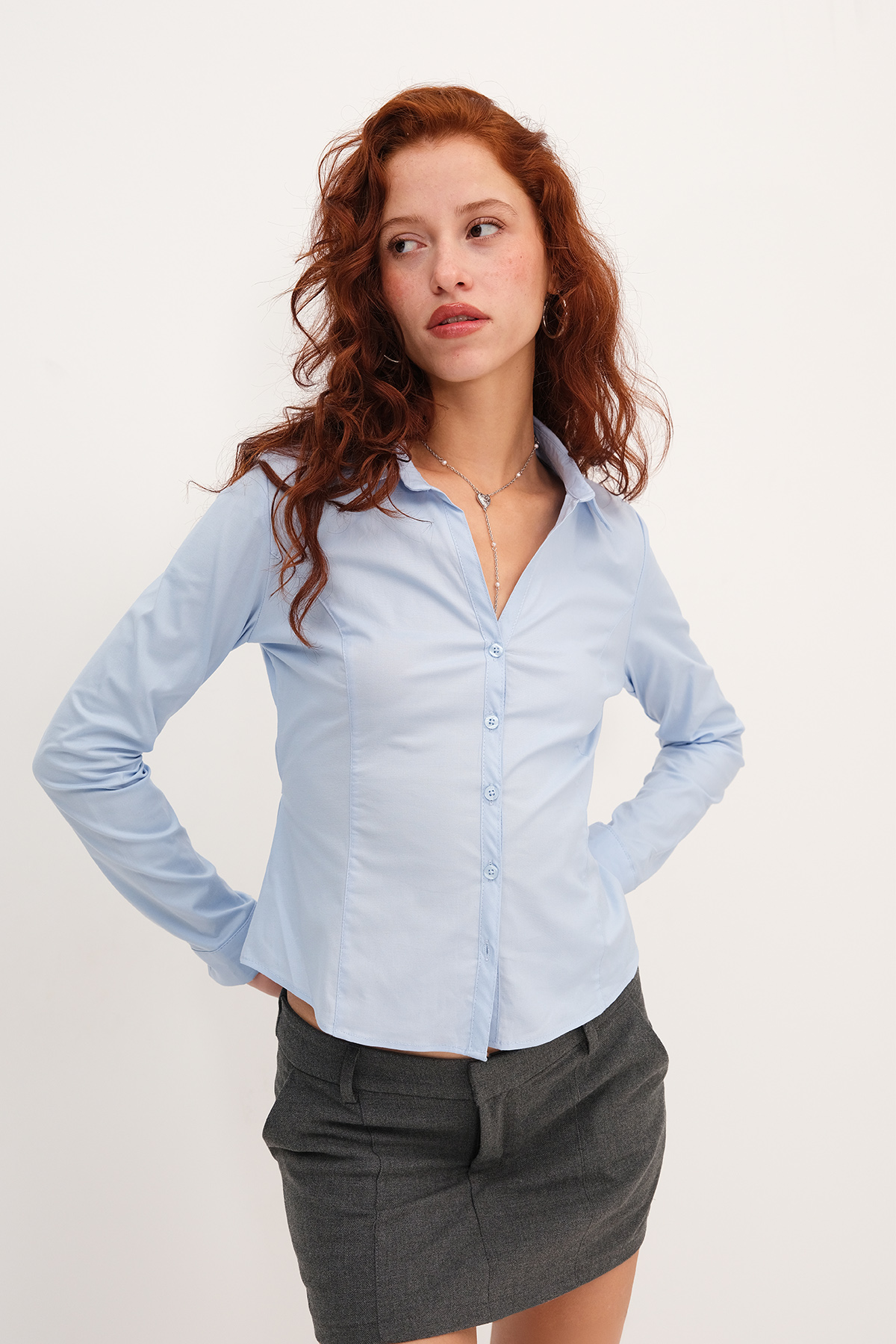 * Gömlek yaka, uzun kollu,* Düğmeli, bağlamalı,* Vücuda oturan, düz renk gömlek,* Ürün içeirği:%95 Pamuk %5 Elastan,* Manken üzerindeki ürün 36/S bedendir.* Numune Beden Ölçüleri: Boy: 50 cm Göğüs: 80 cm Kol Boyu: 60 cm (1-3 cm arasında değişiklik gösterebilir)* Ürün çekimlerinde renkler, ışık farklılığından dolayı değişkenlik gösterebilir.
