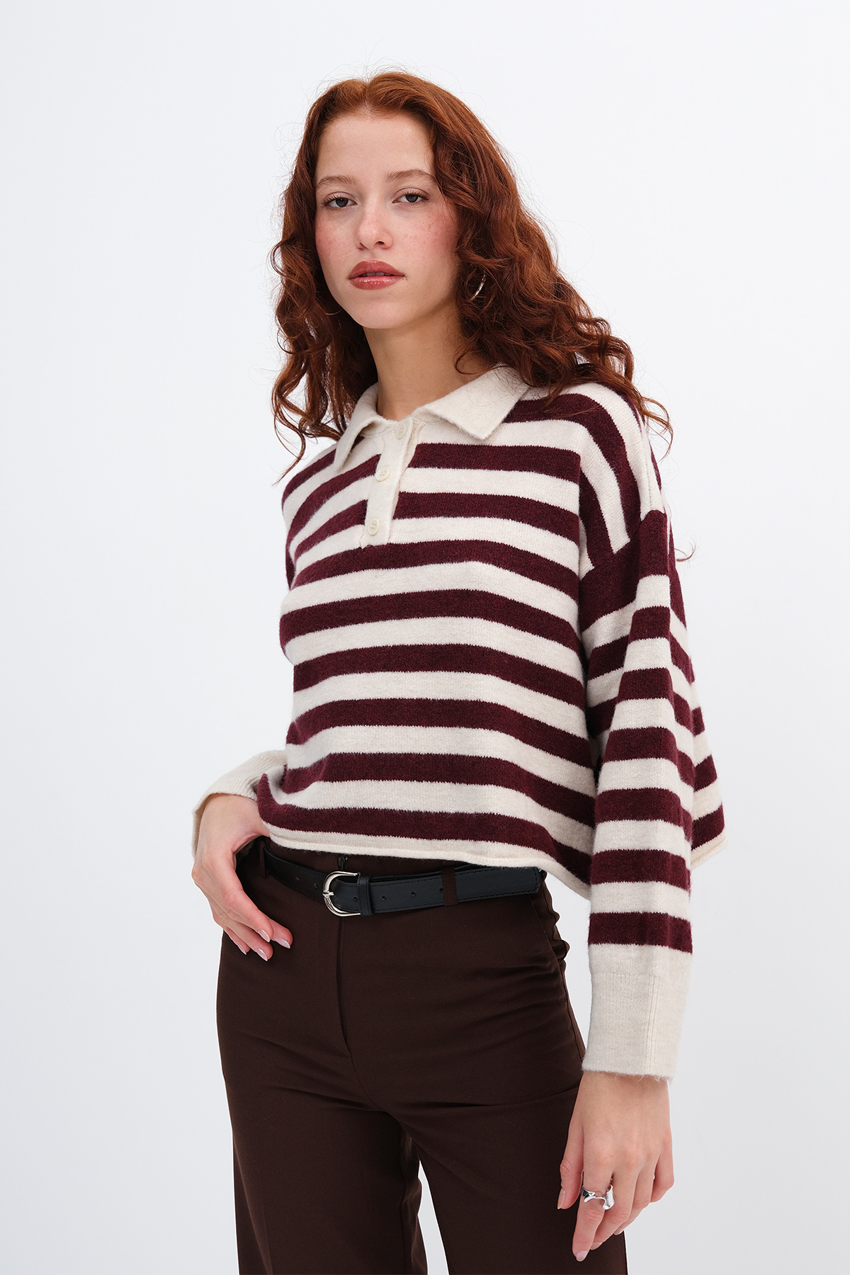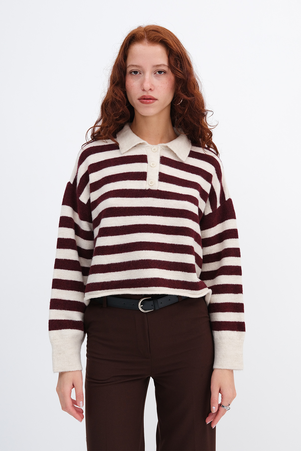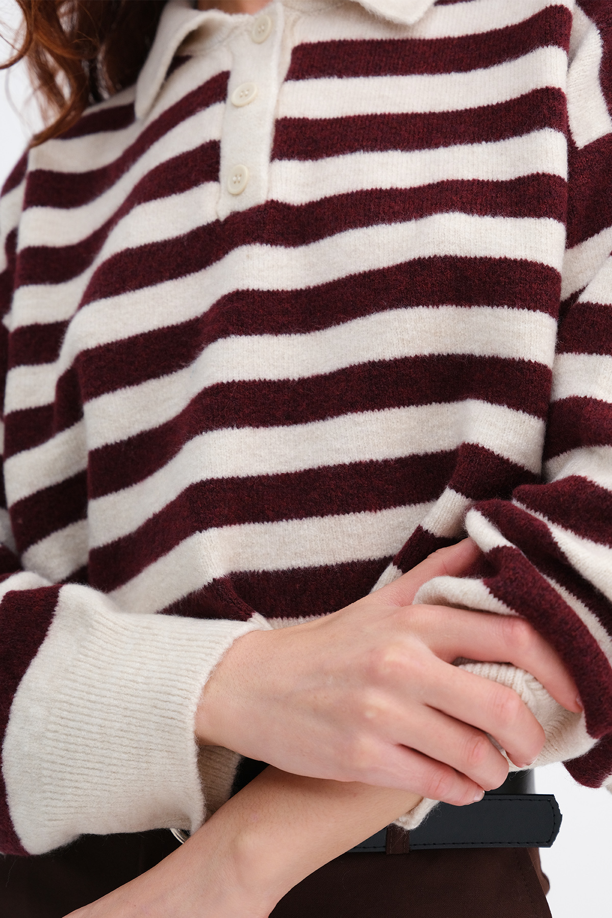 * Düğmeli, çizgili, rahat kalıp, triko kazak,