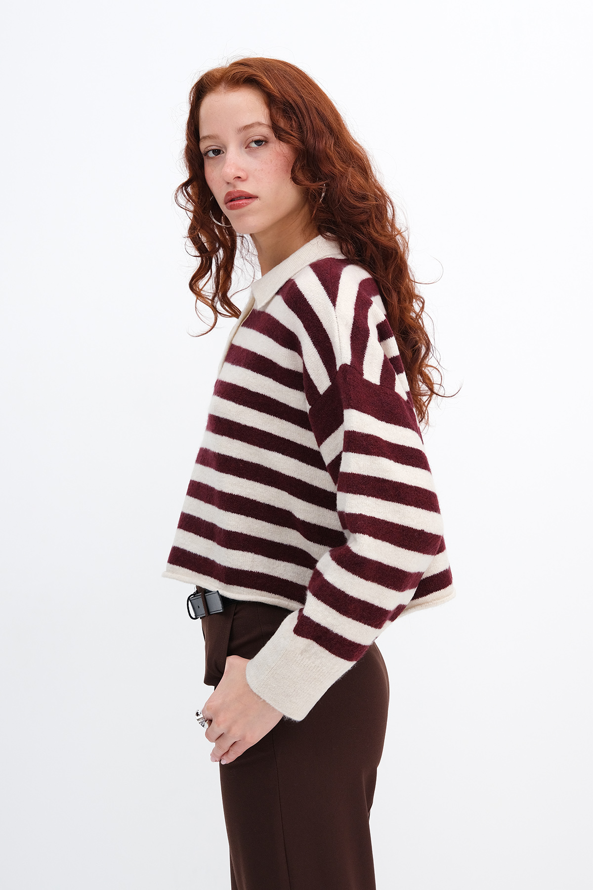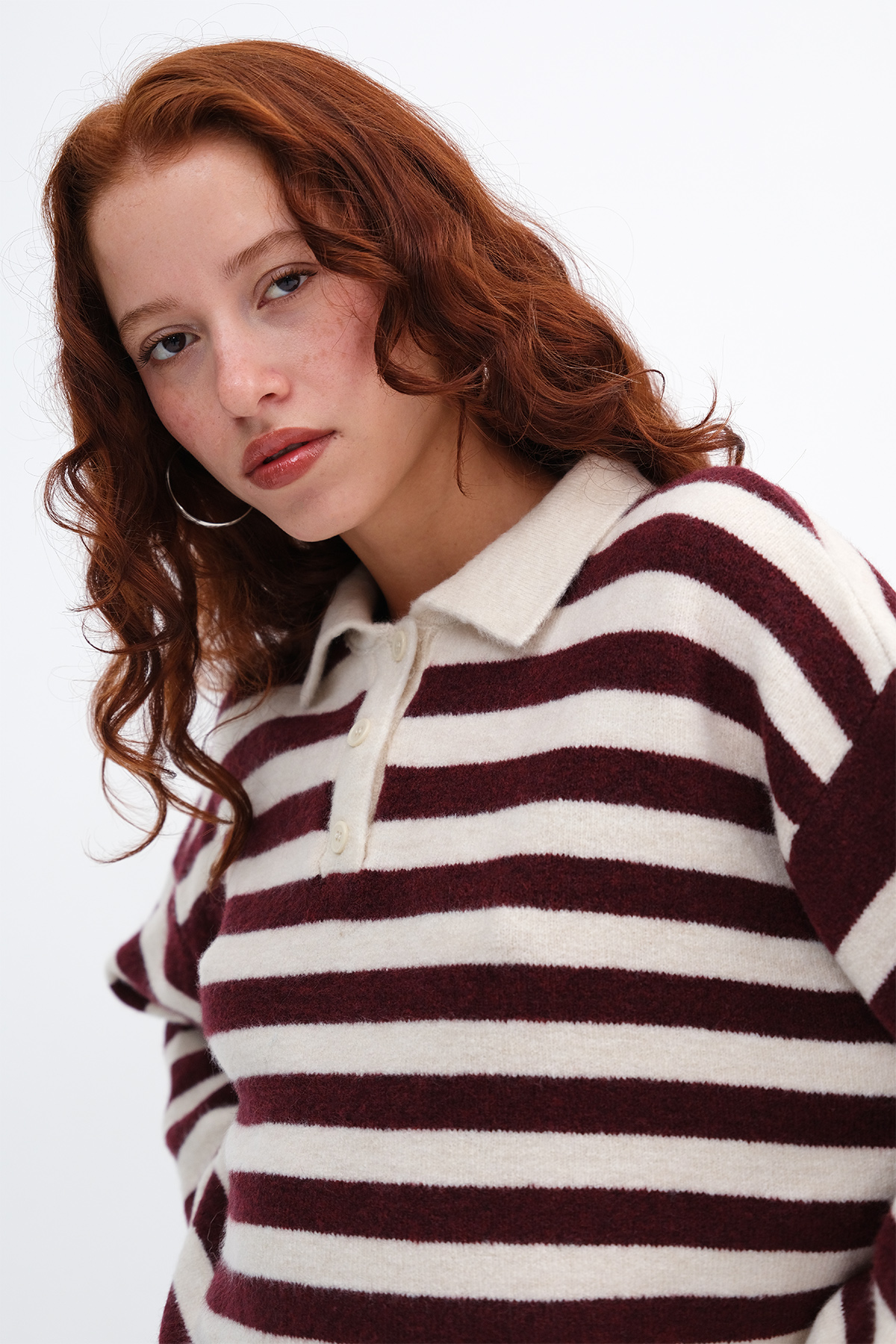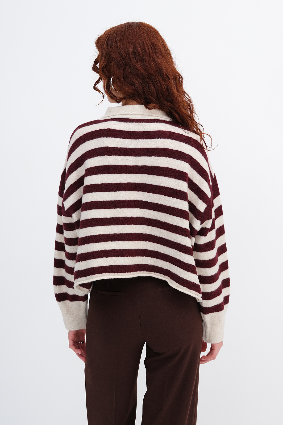 * Düğmeli, çizgili, rahat kalıp, triko kazak,