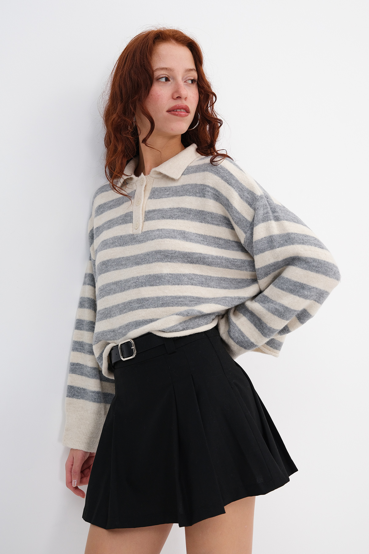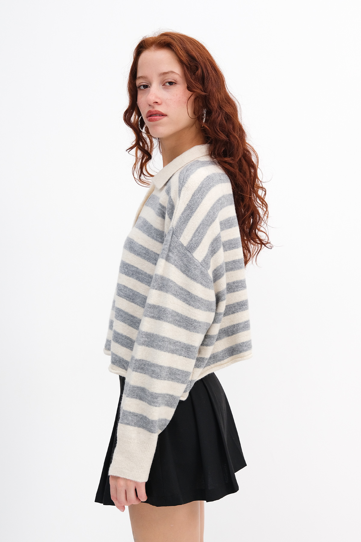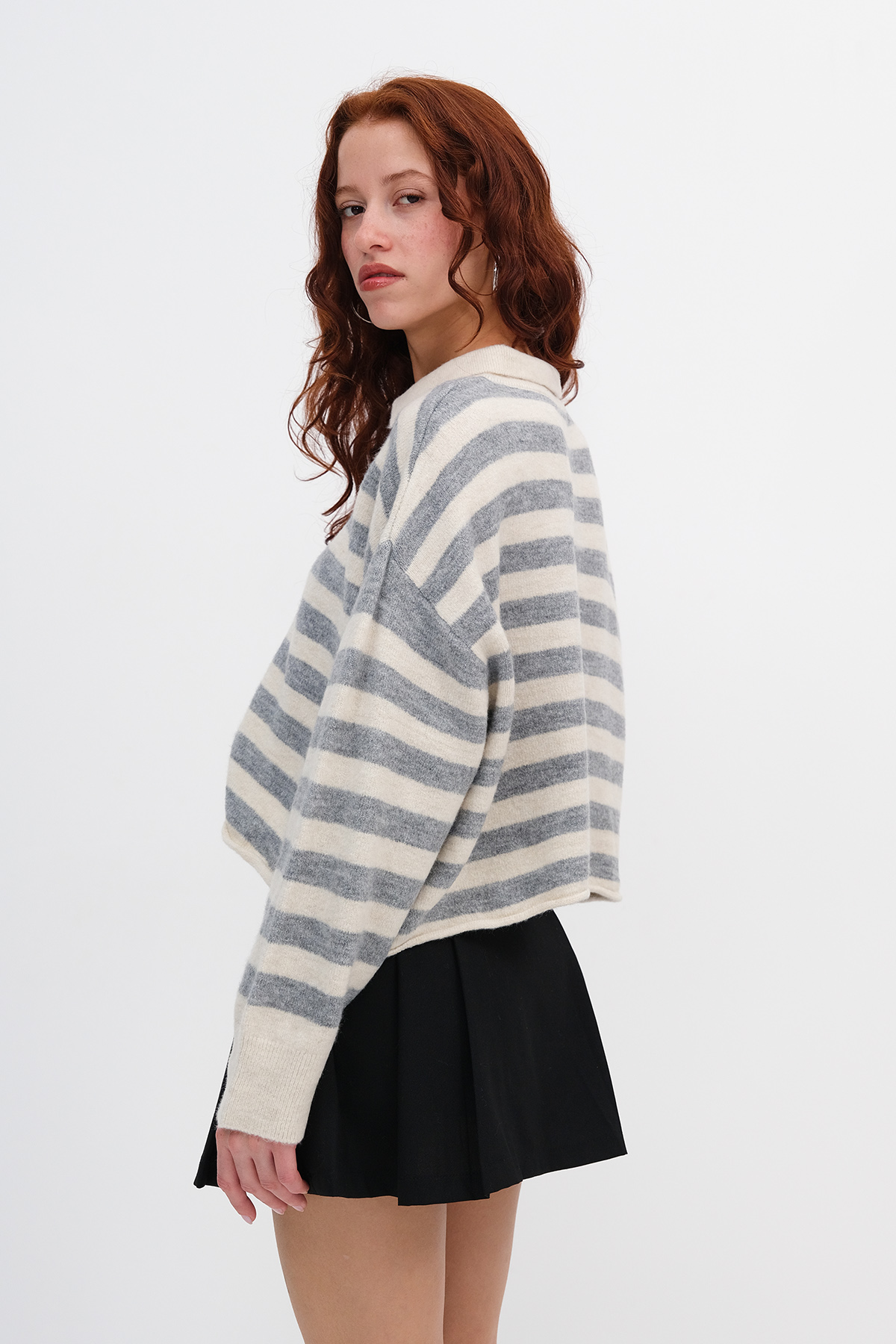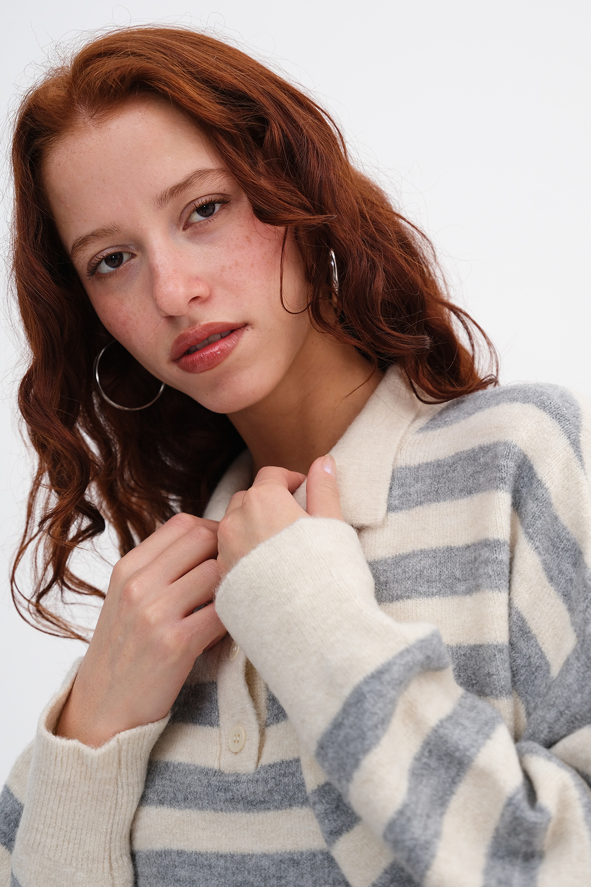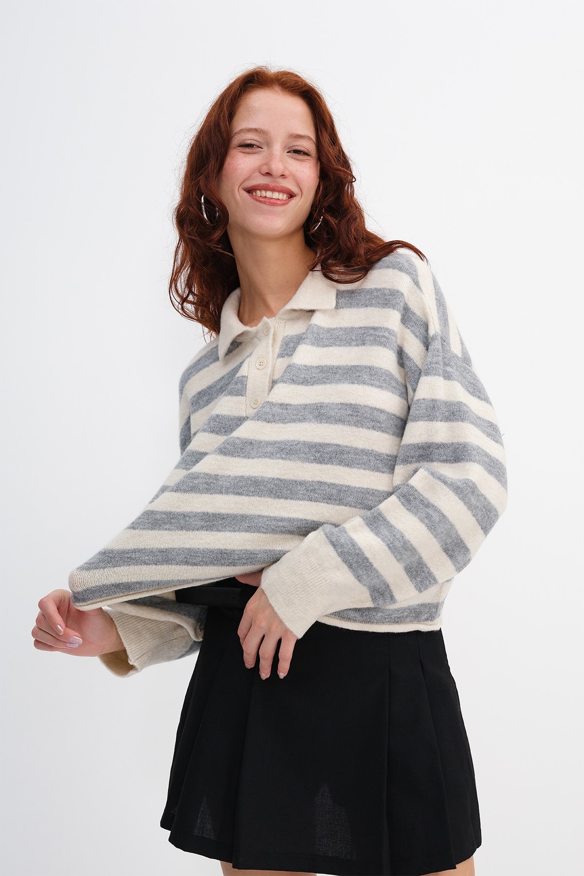 * Düğmeli, çizgili, rahat kalıp, triko kazak,