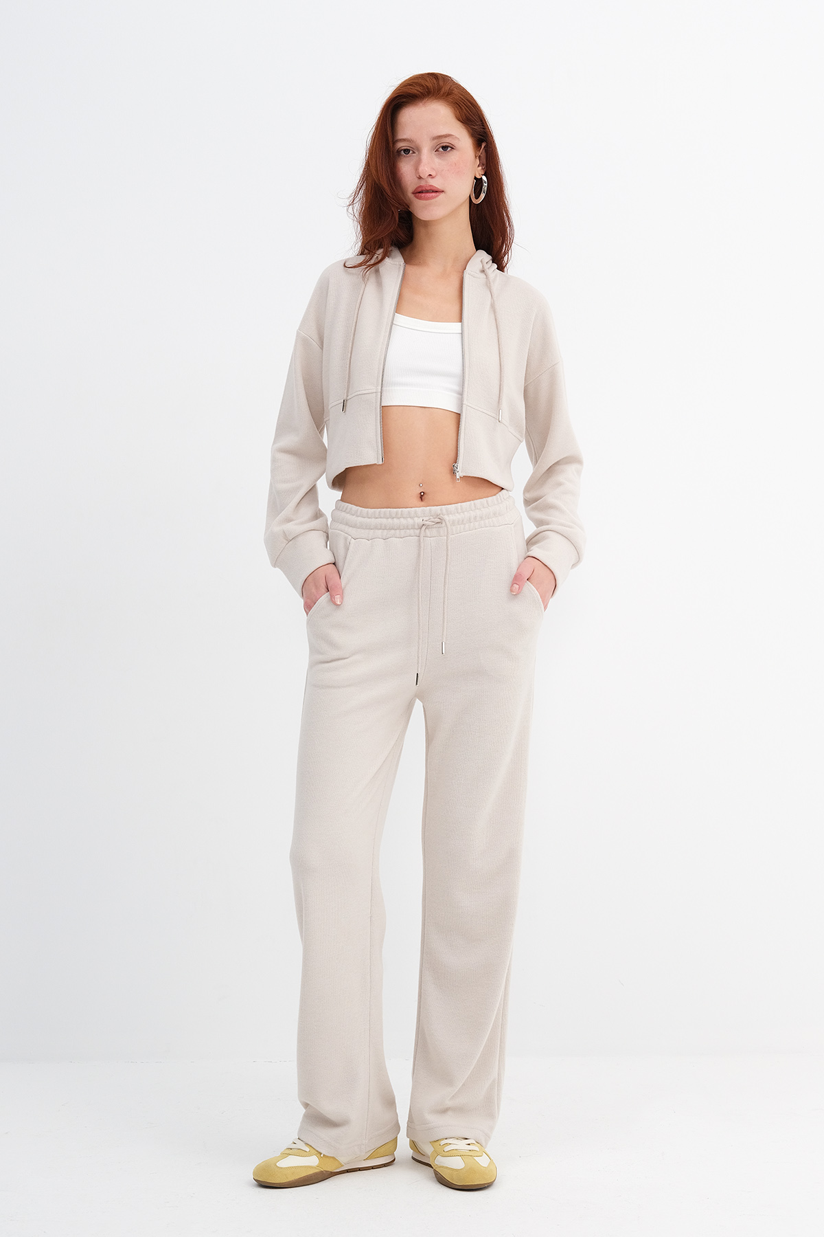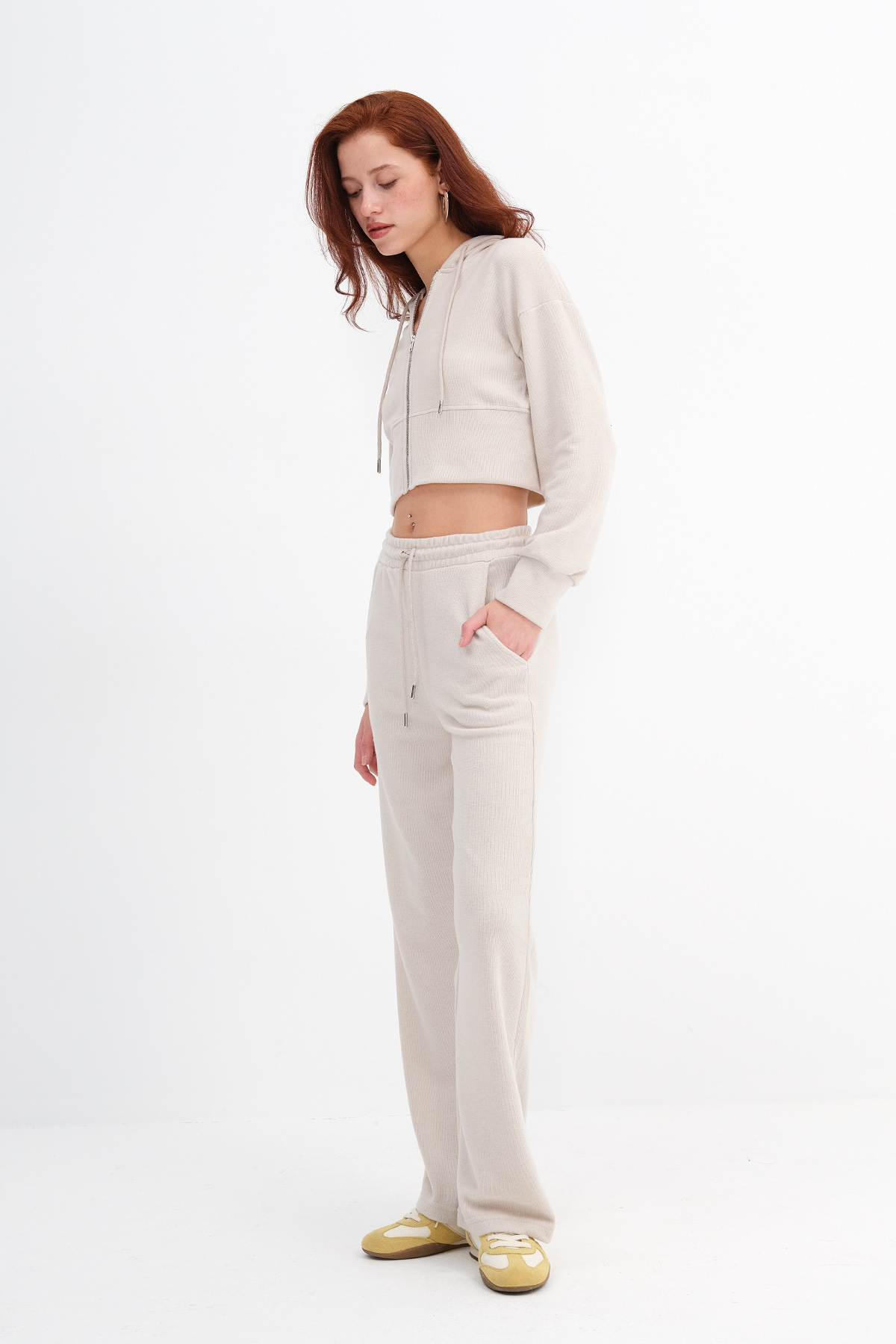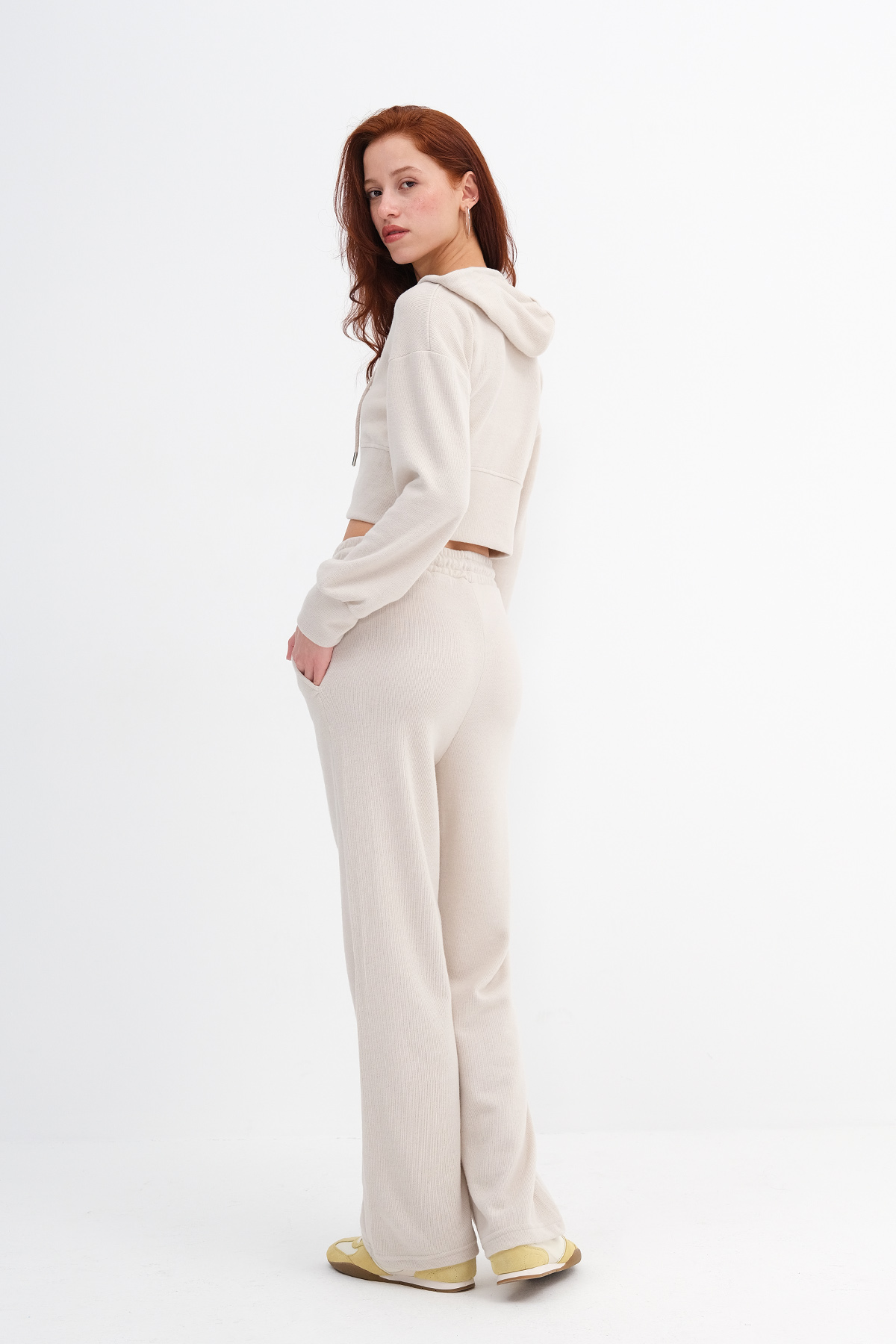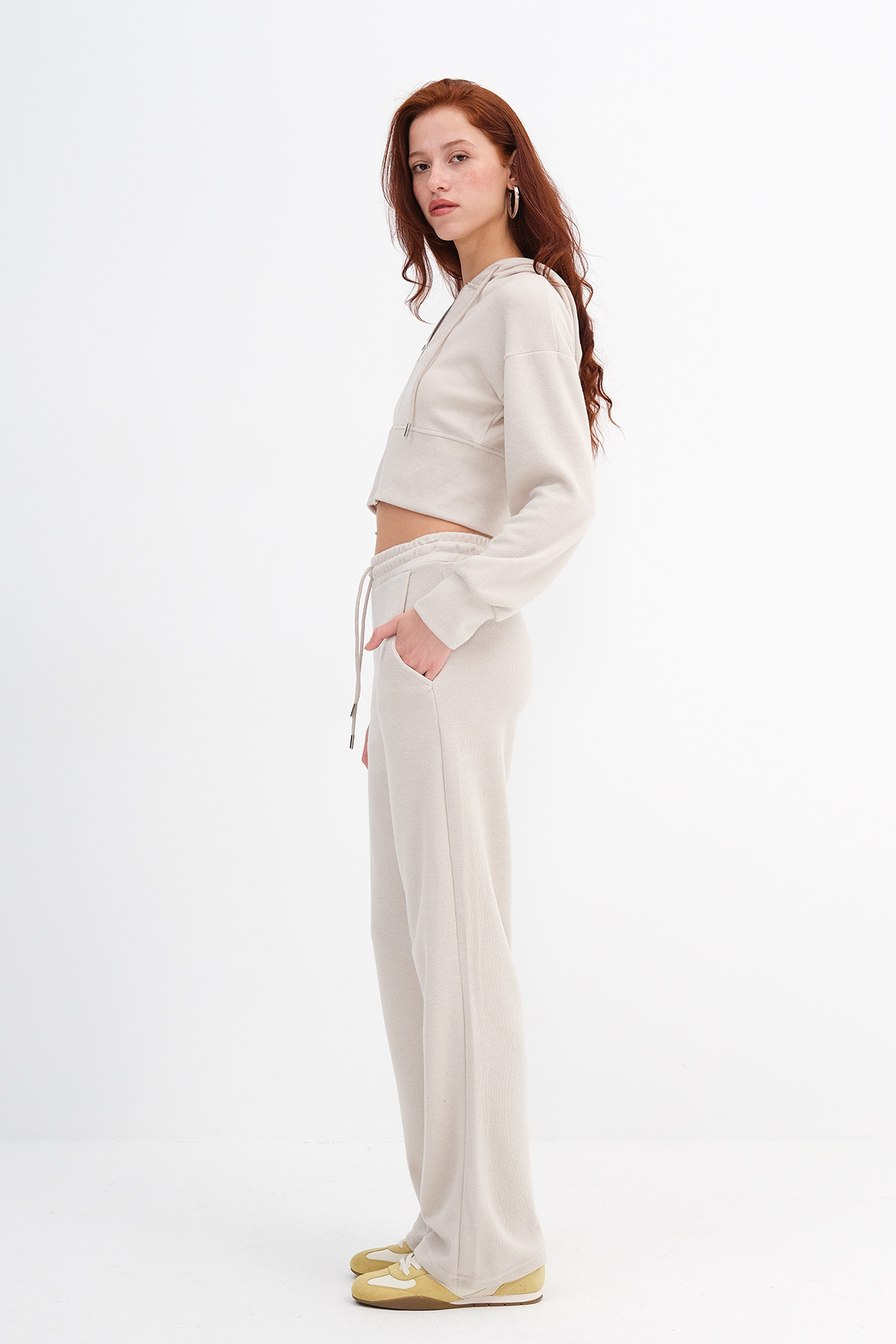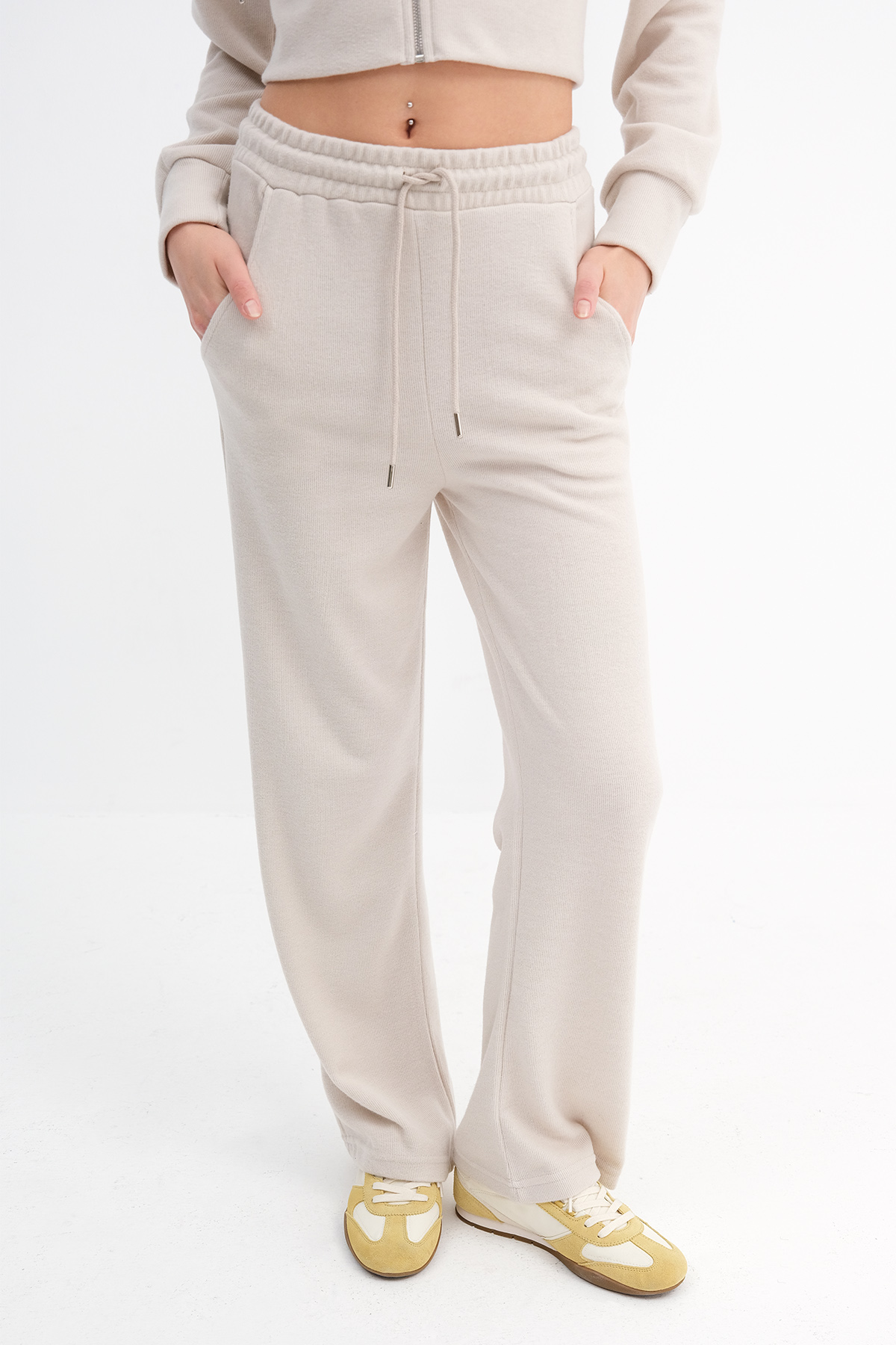 * Normal bel, beli lastikli, yandan cepli, wide leg,