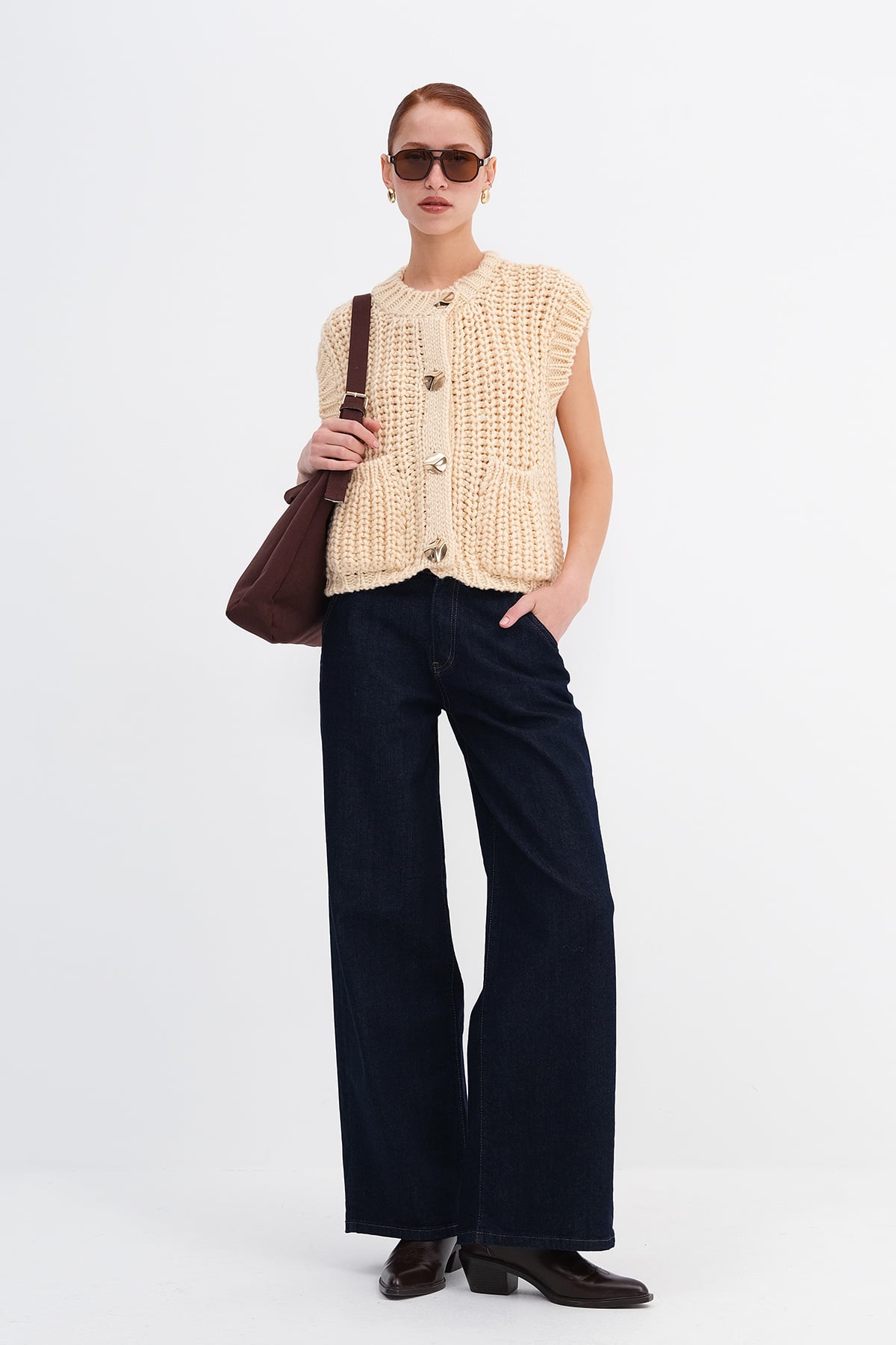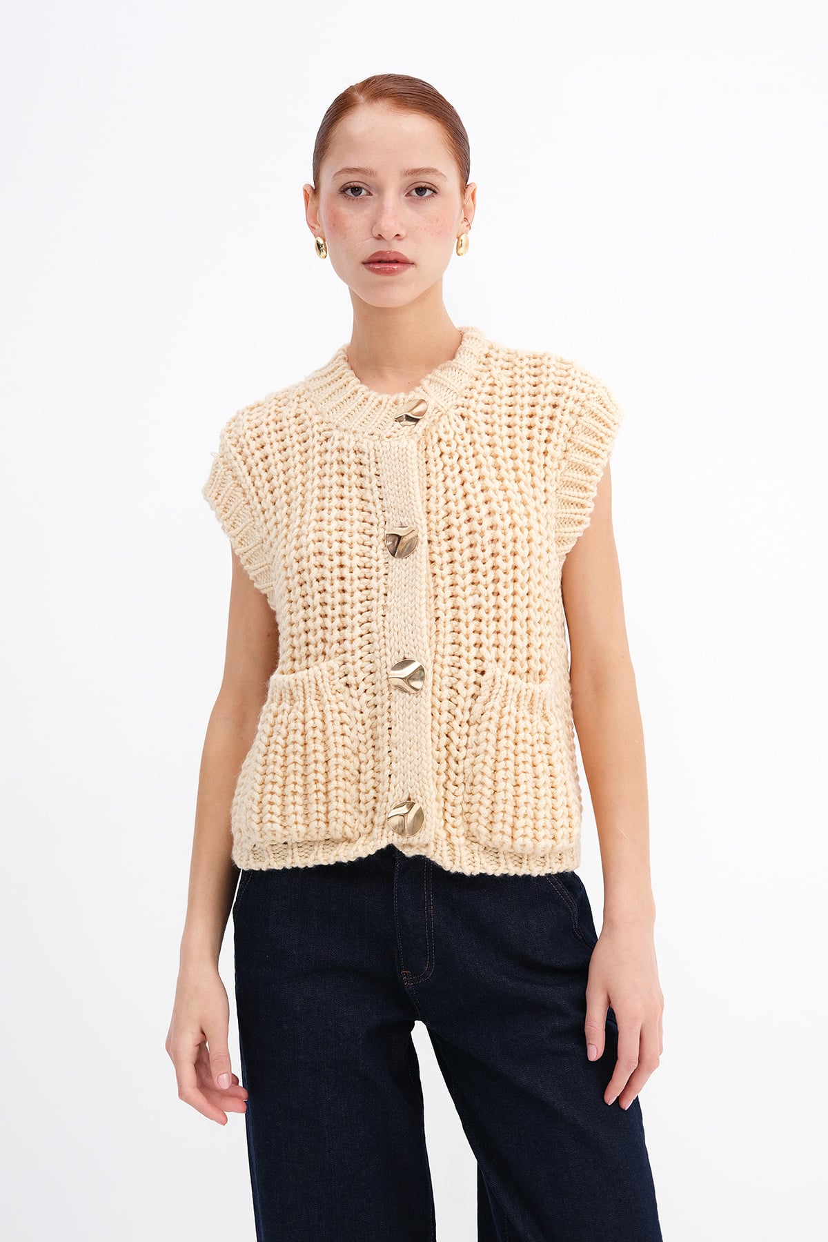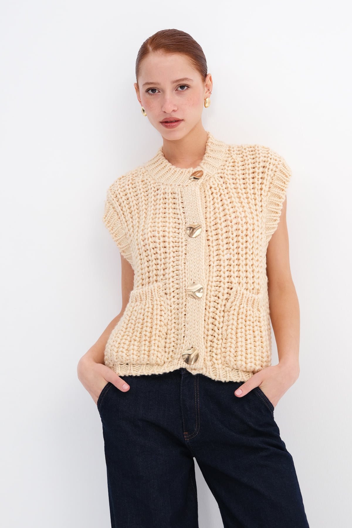* Gold düğmeli, kalın örgü, cepli yelek,