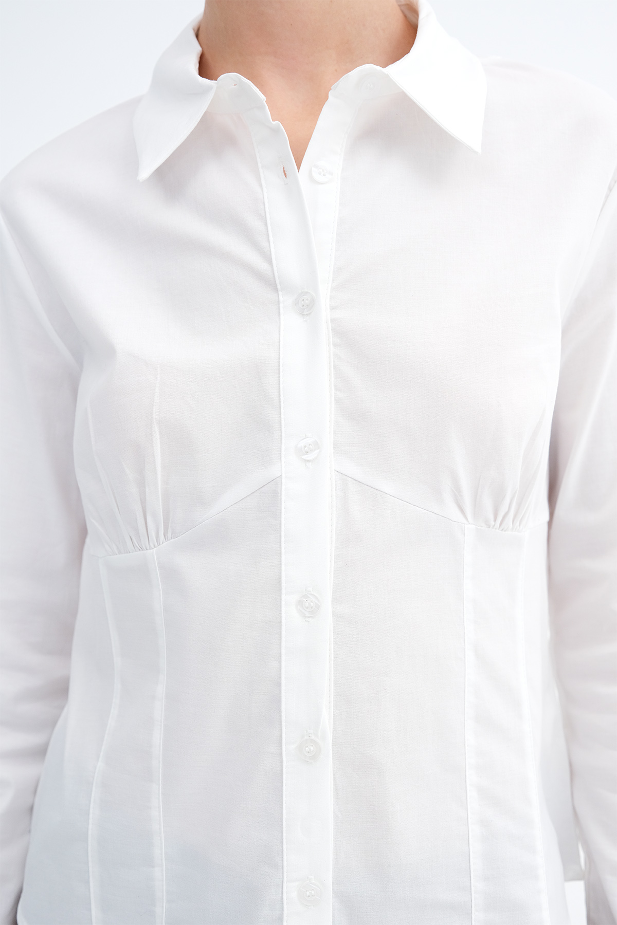 * Düz renk, düğmeli, vücudu saran gömlek,