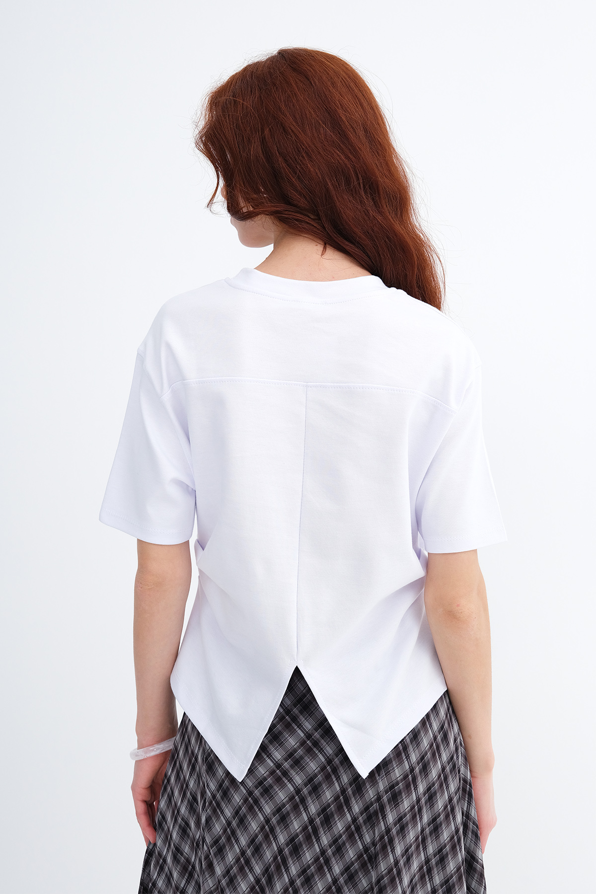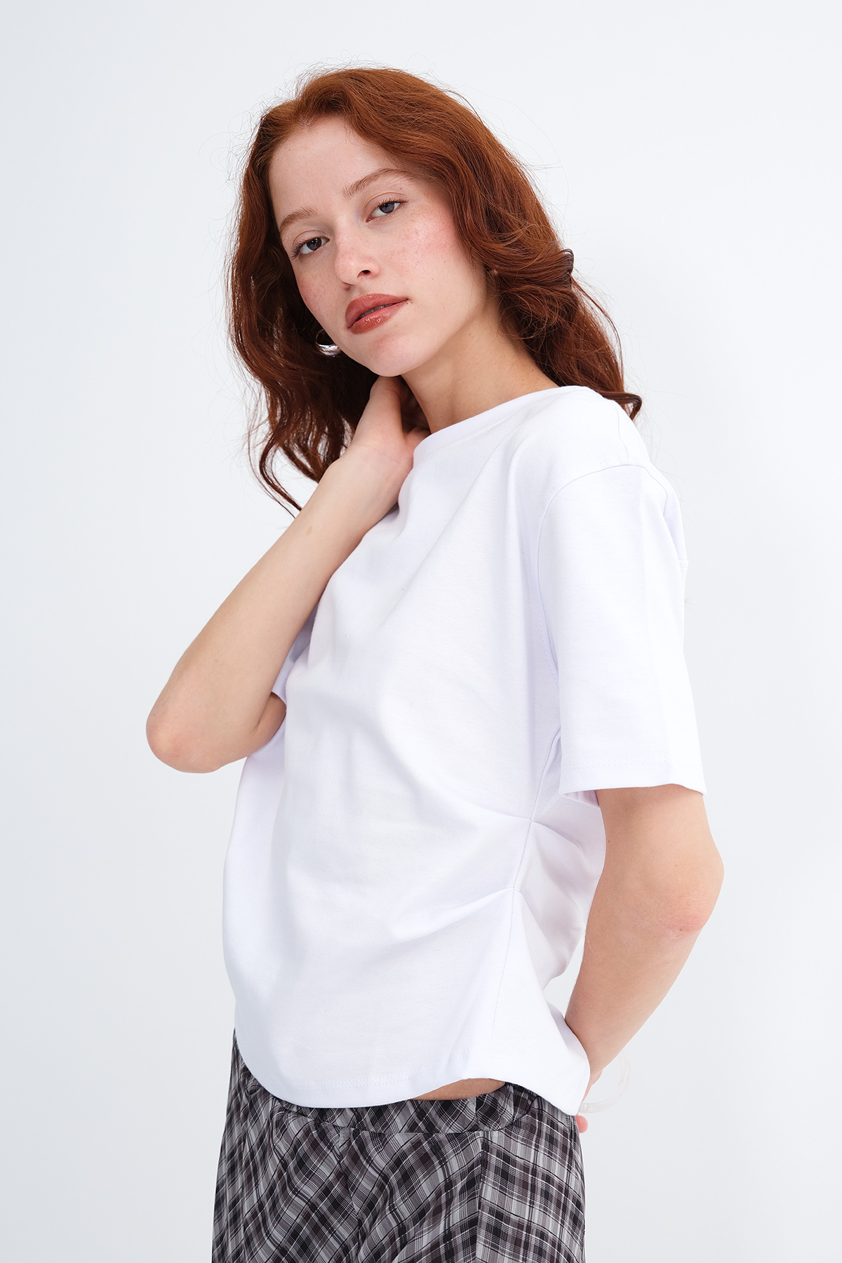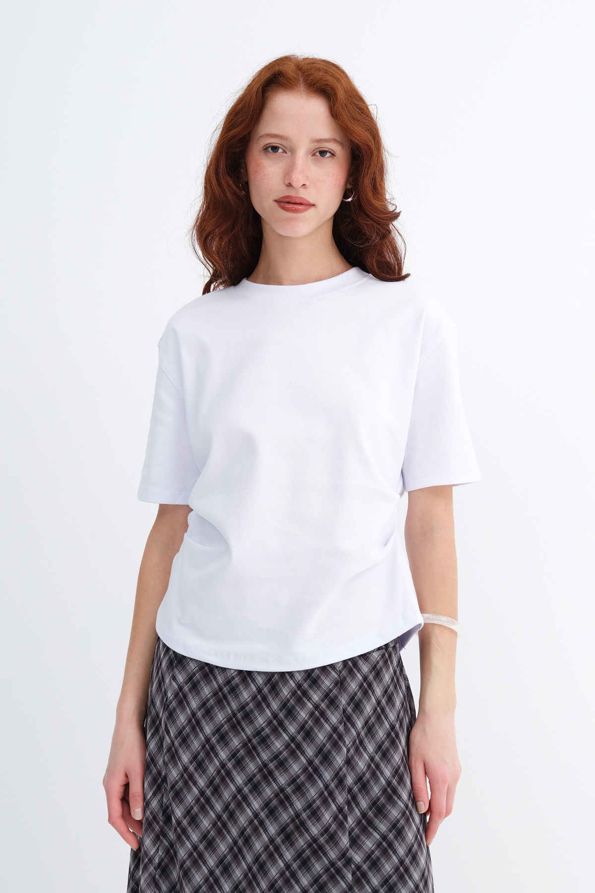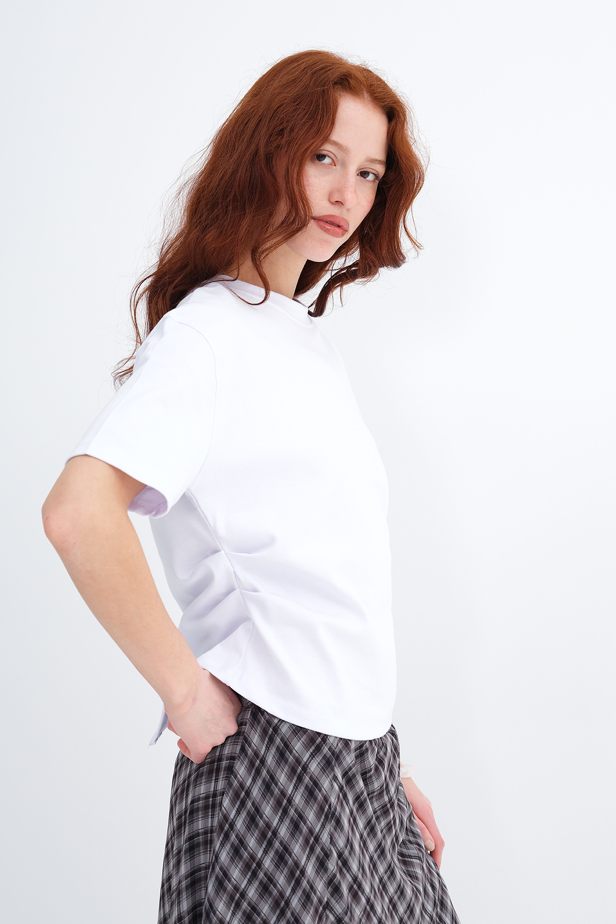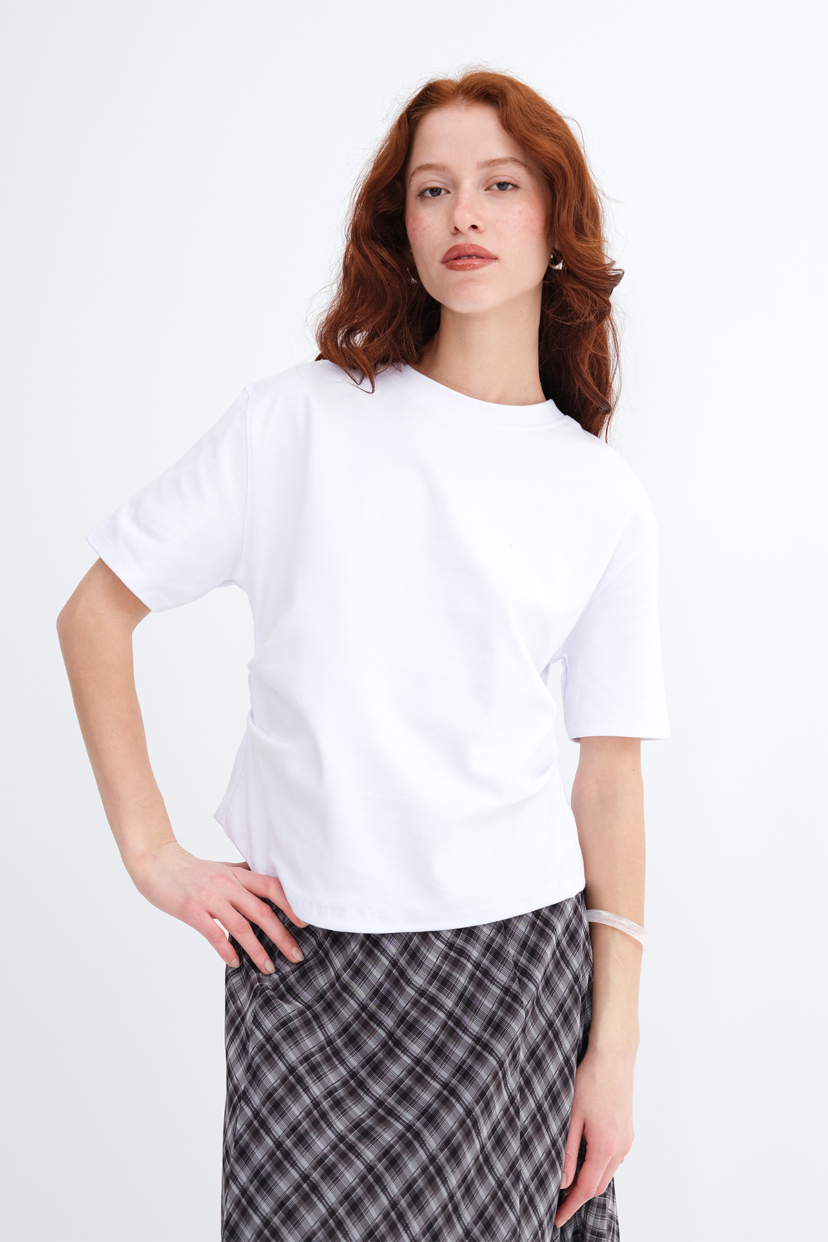 * Yanı büzgülü, düz renk t-shirt,