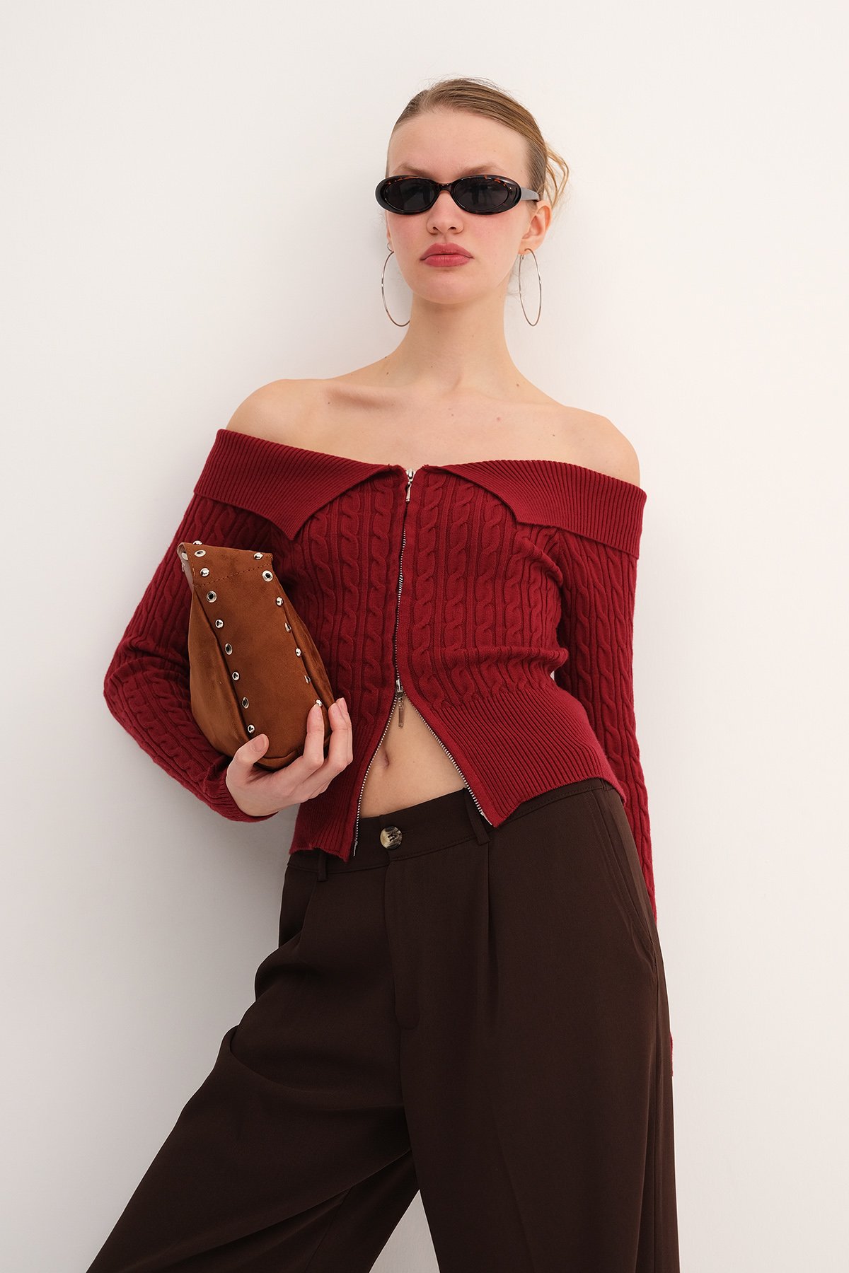 * Kayık yaka, uzun kollu,* Saç örgülü, çift fermuarlı,* Vücudu saran, triko hırka,* Ürün içeriği:%50 Viskon %28 Elite %22 Naylon,* Manken üzerindeki ürün standart bedendir.* Numune Beden Ölçüleri: Boy: 45 cm Göğüs: 60 cm Kol Boyu: 57 cm (1-3 cm arasında değişiklik gösterebilir)* Ürün çekimlerinde renkler, ışık farklılığından dolayı değişkenlik gösterebilir.