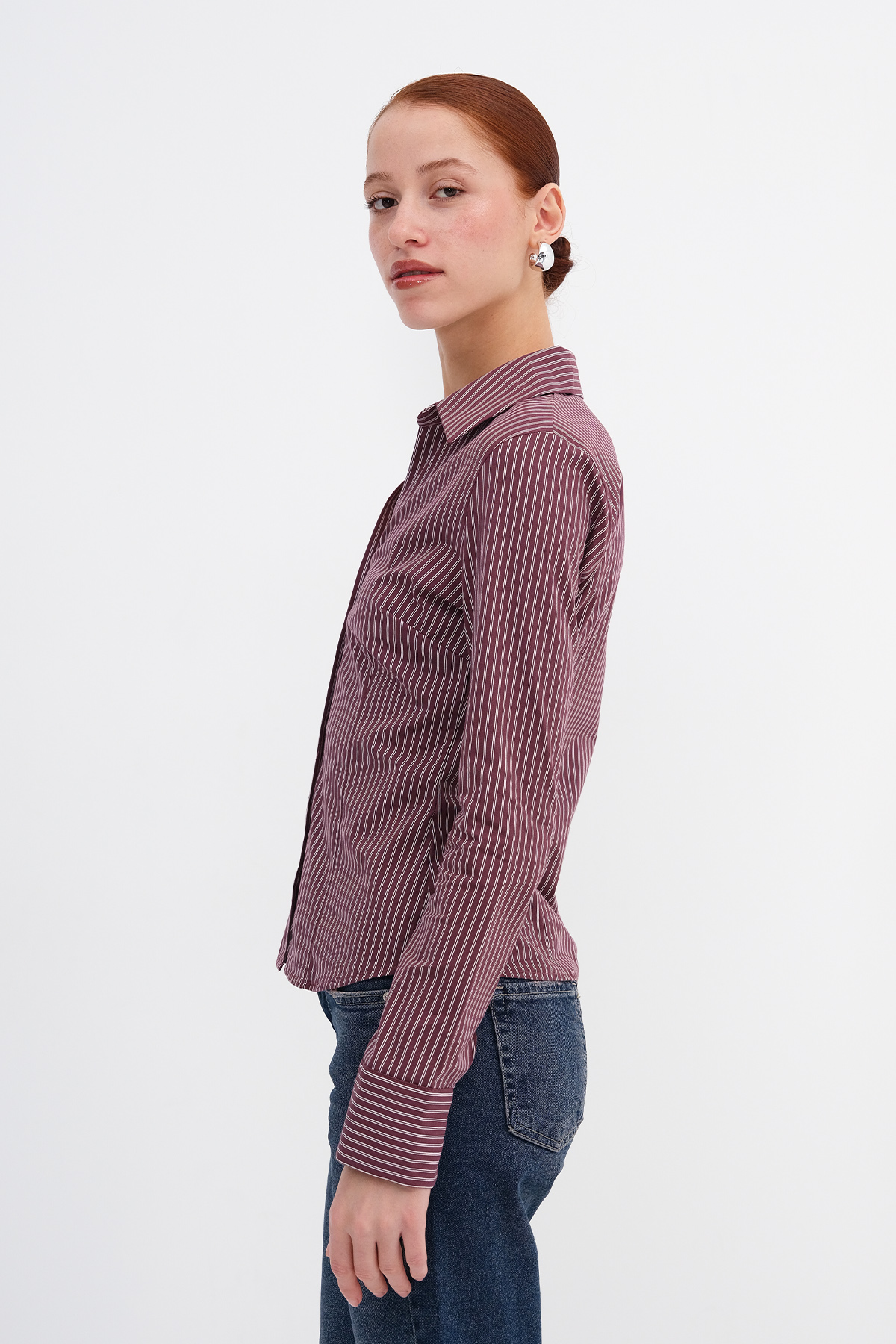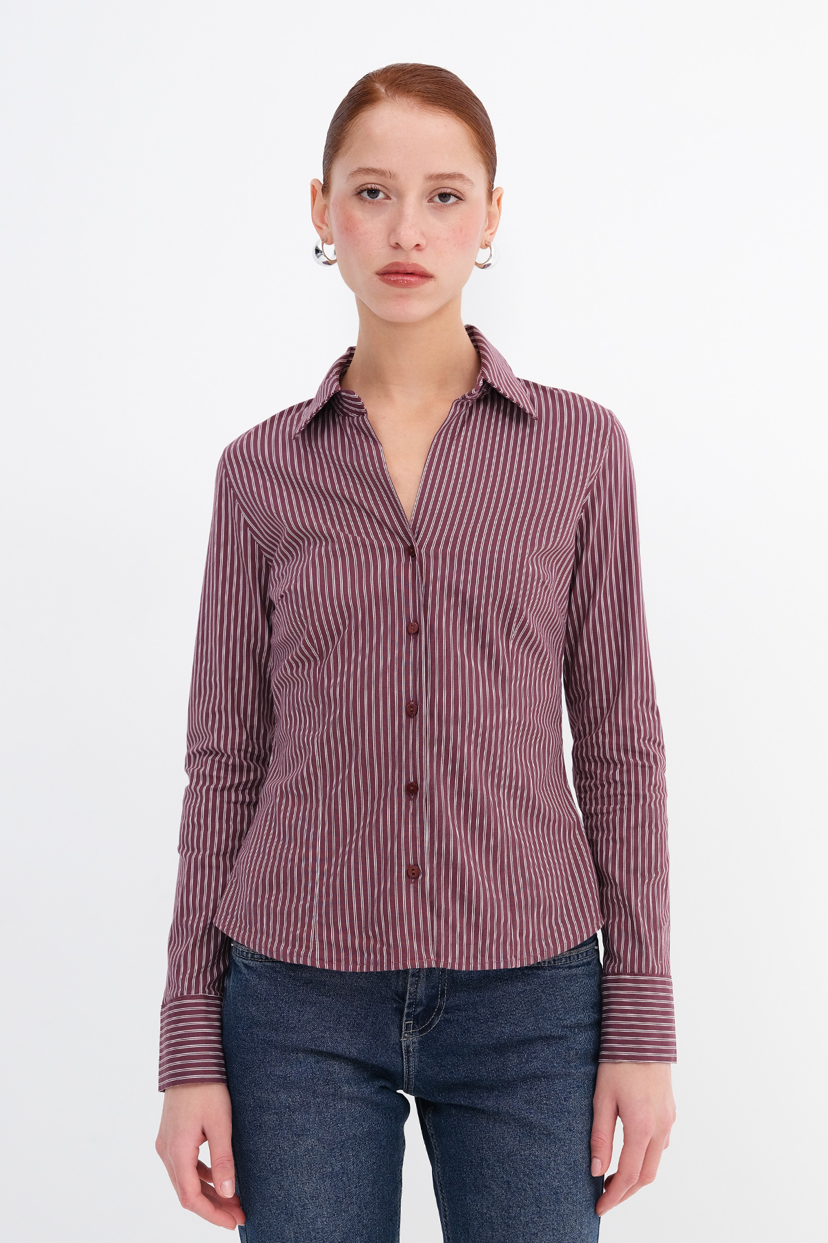 * Düğmeli, çizgili, vücudu saran gömlek,