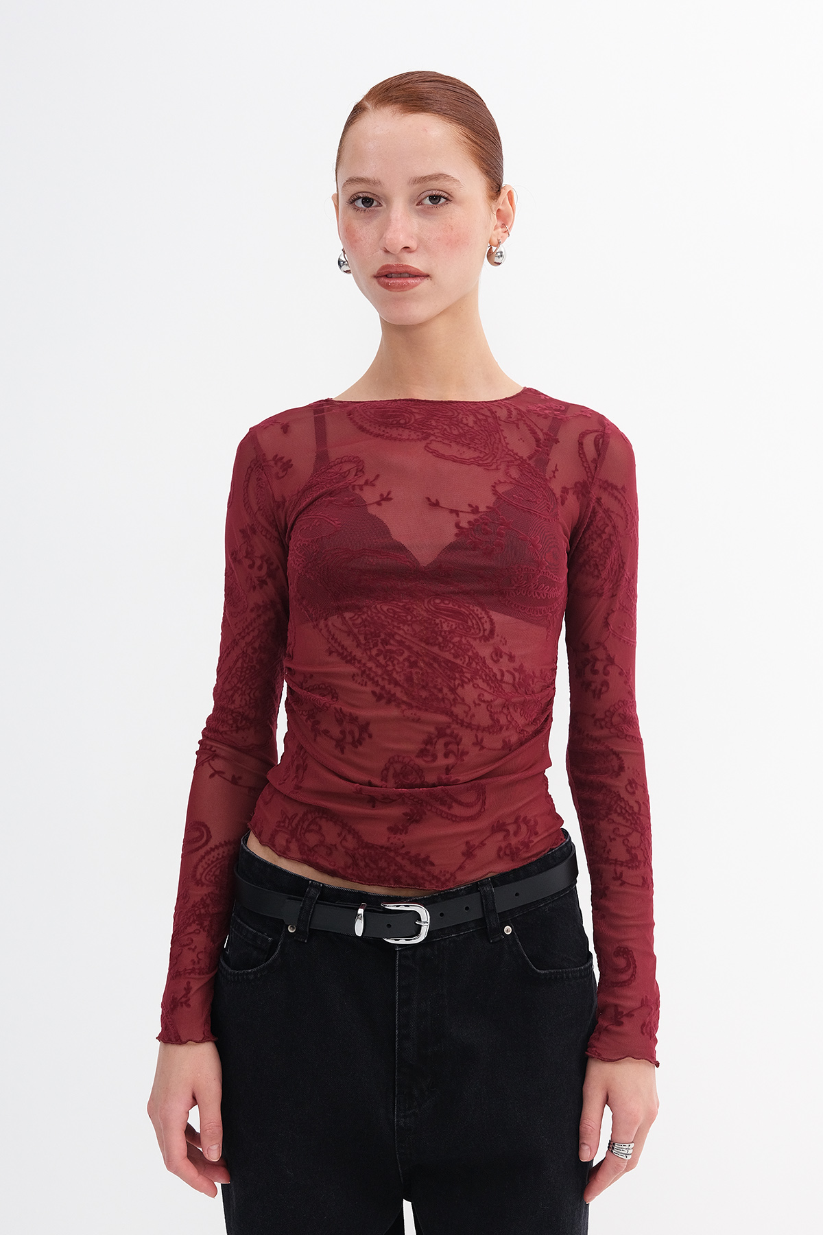 * Desenli, transparan, yanı büzgülü, tül bluz,