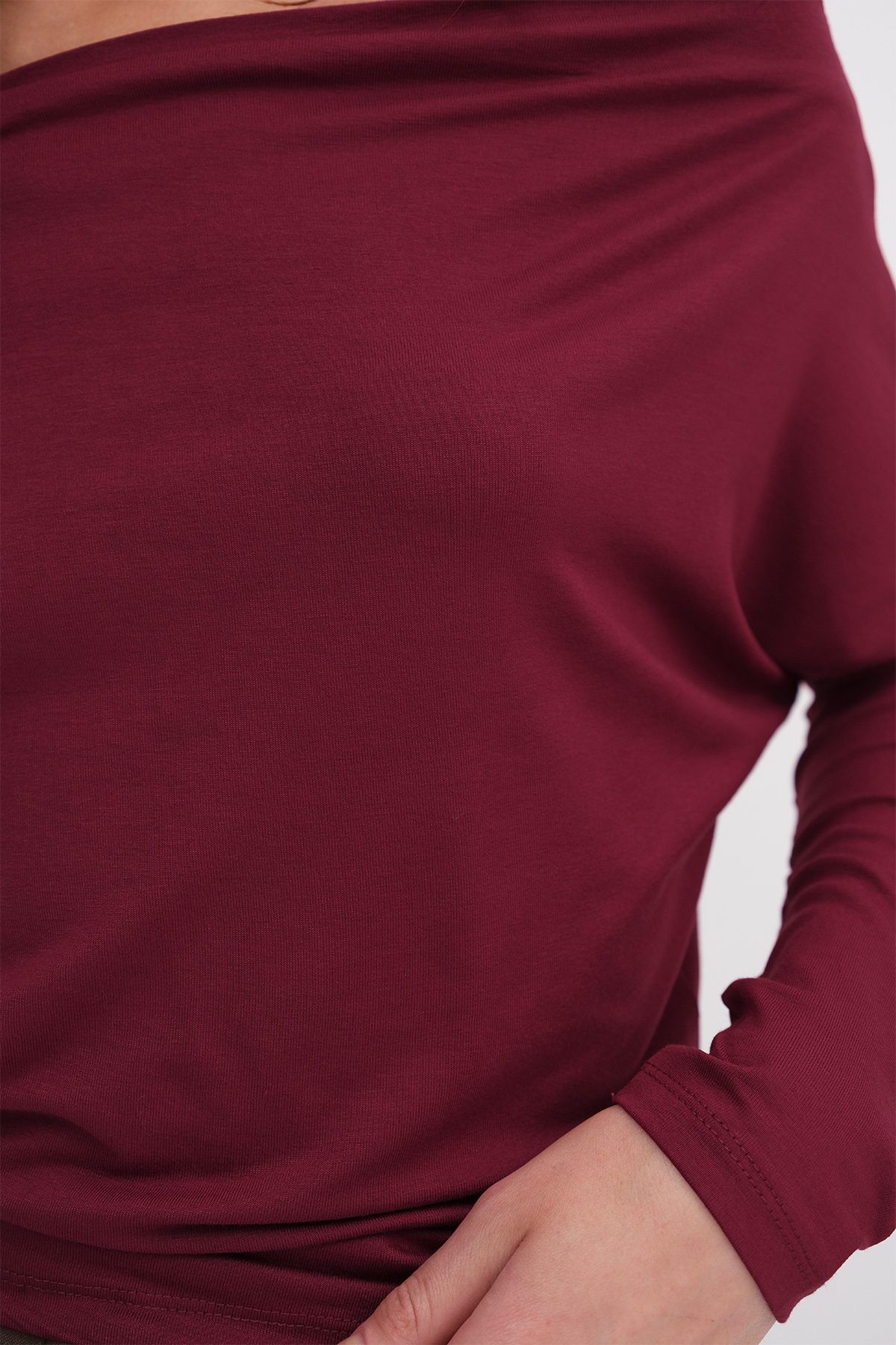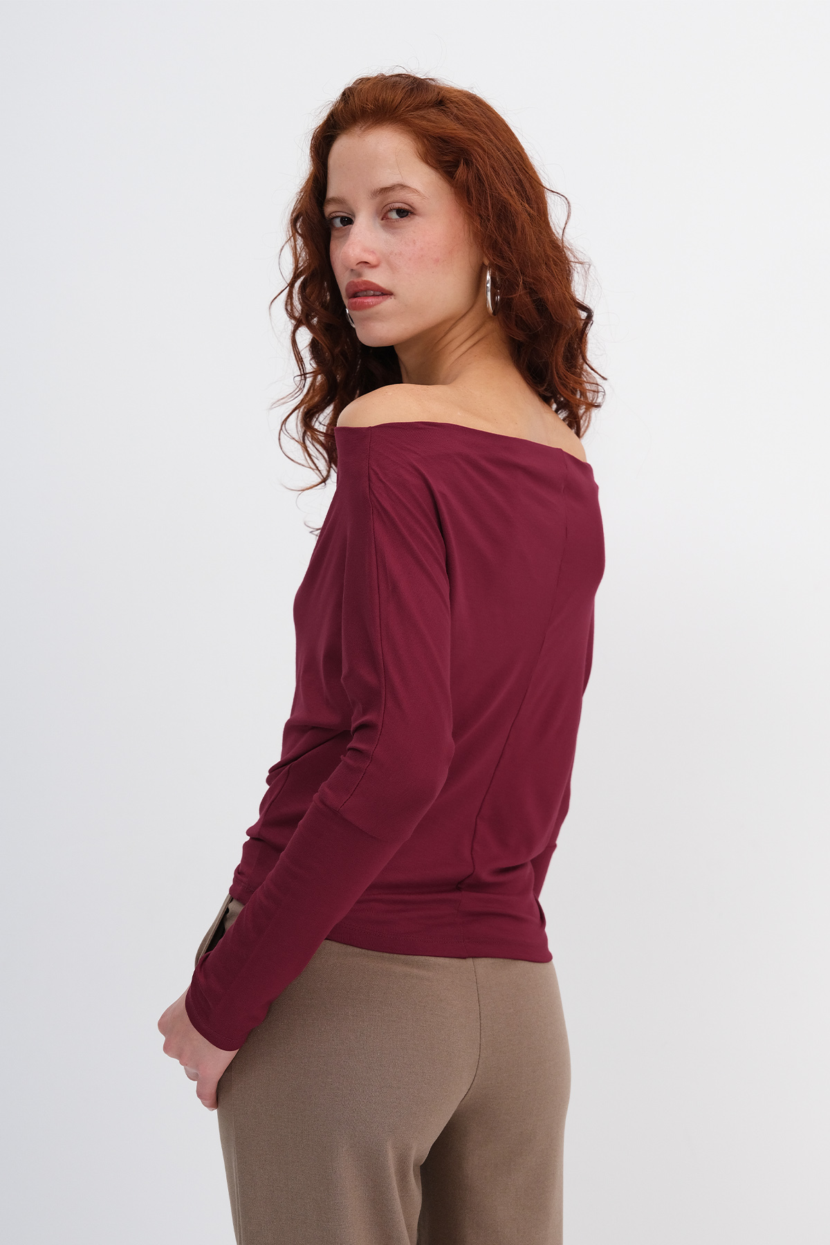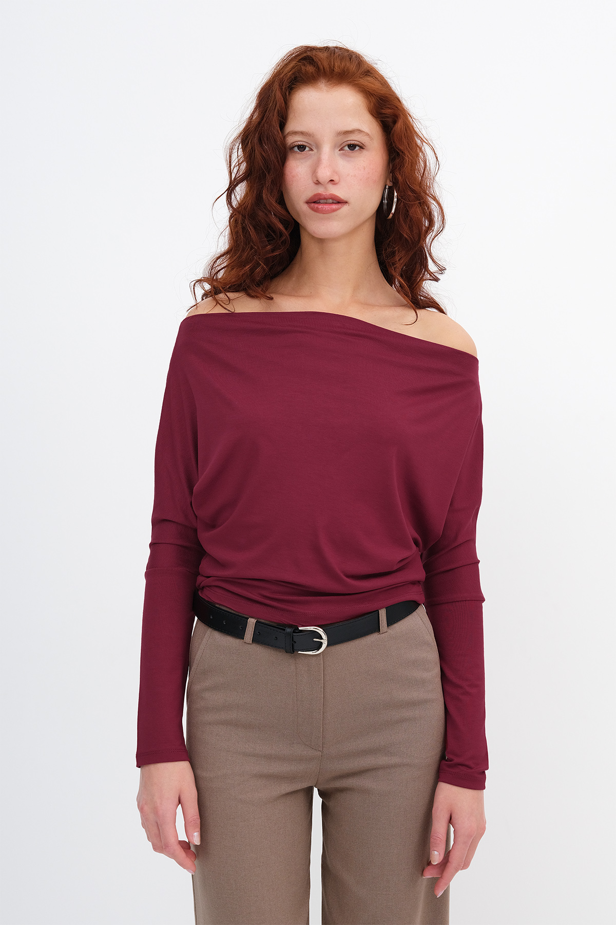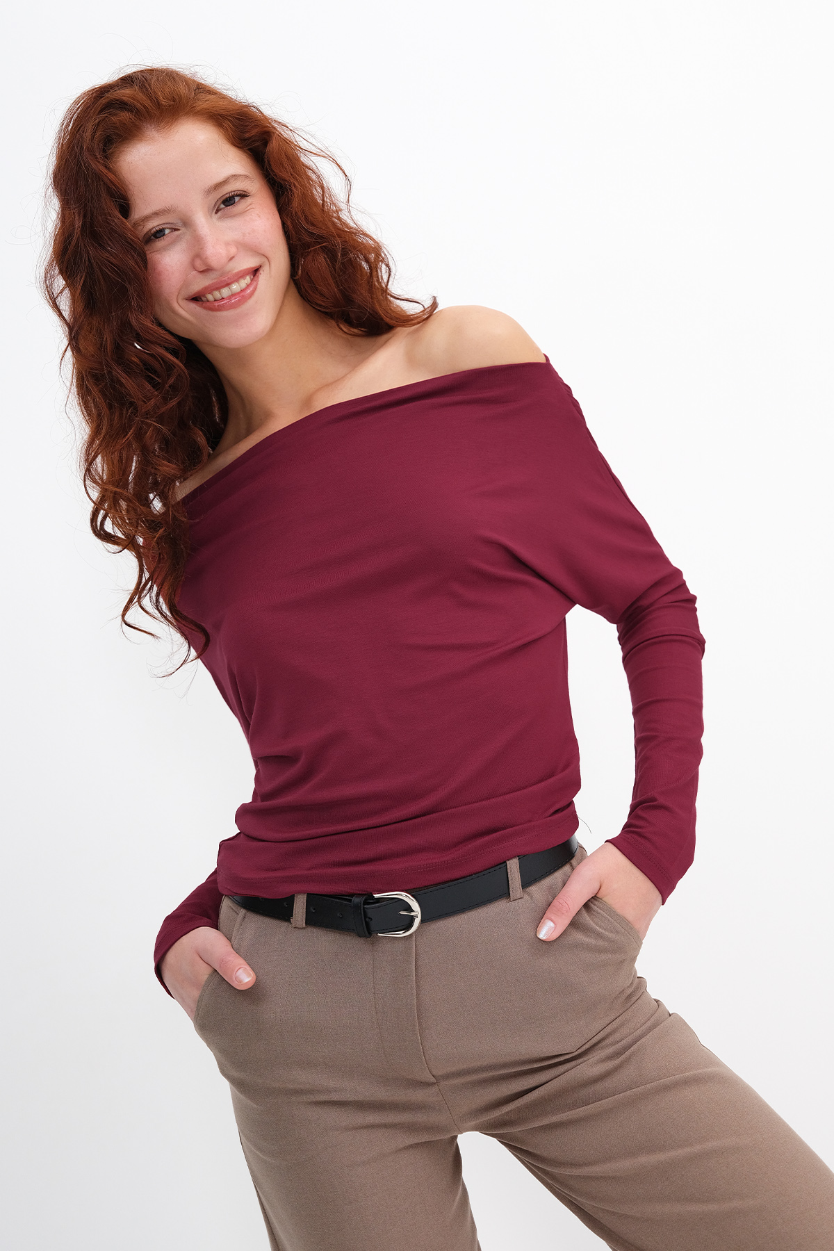 * Kayık yaka, uzun kollu, düz renk bluz,