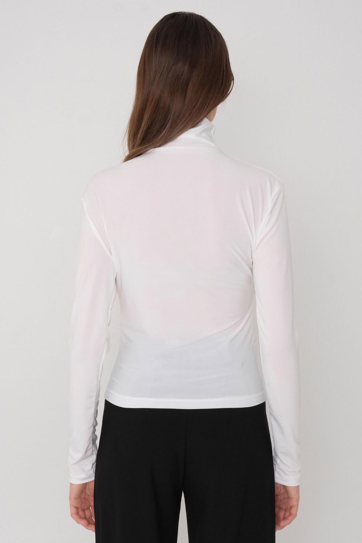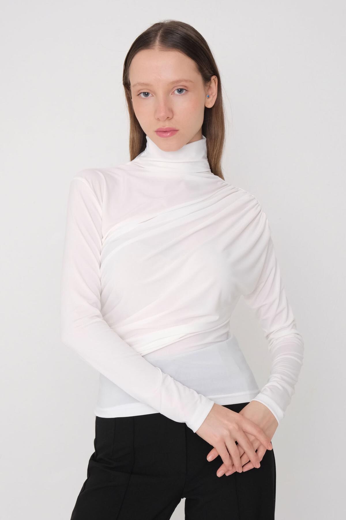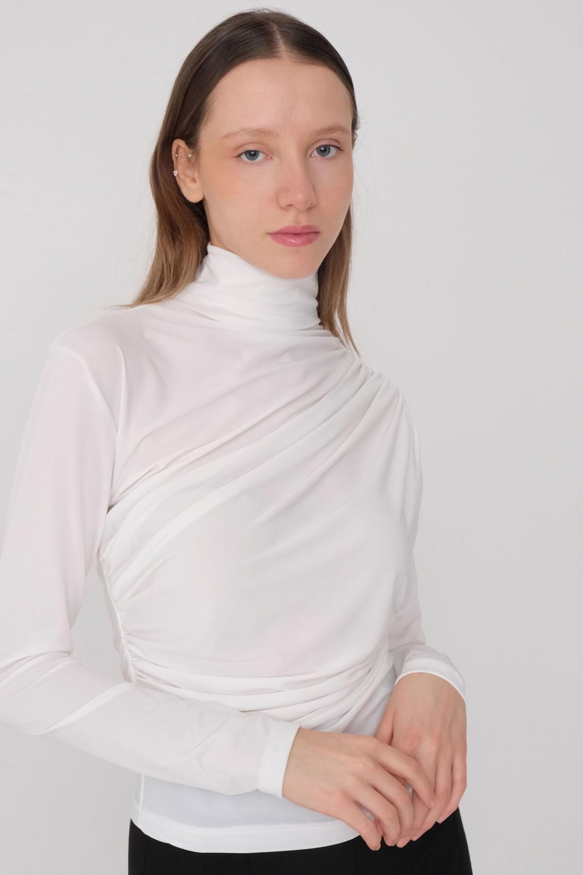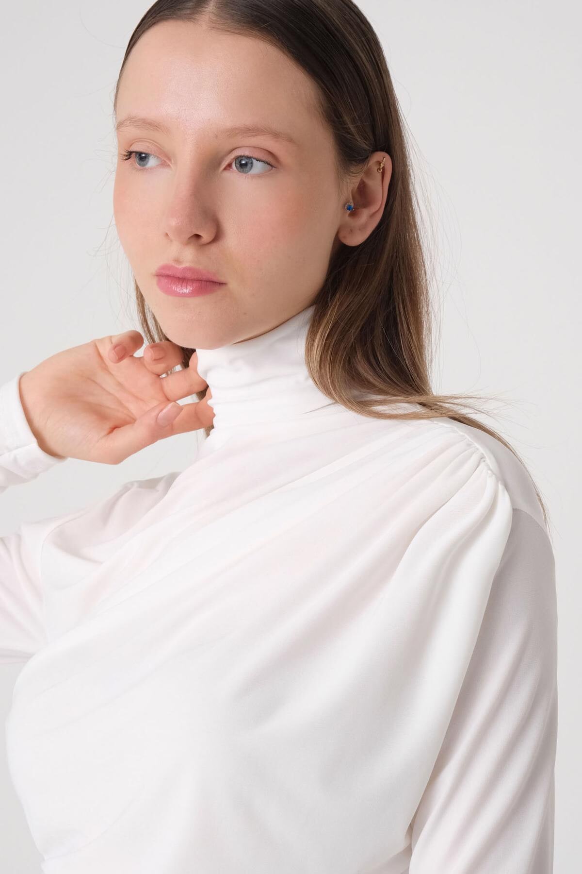 * Uzun kollu, dik yaka,* Büzgülü, vücüdu saran bluz,* Ürün içeriği:%95 Pamuk %5 Lycra* Manken üzerindeki ürün 36/S bedendir.* Numune beden ölçüleri: Boy:50 cm Göğüs:80 cm Kol boyu:55 cm (1-3 cm arası değişiklik gösterebilir)* Ürün çekimlerinde renkler, ışık farklılığından dolayı değişkenlik gösterebilir.