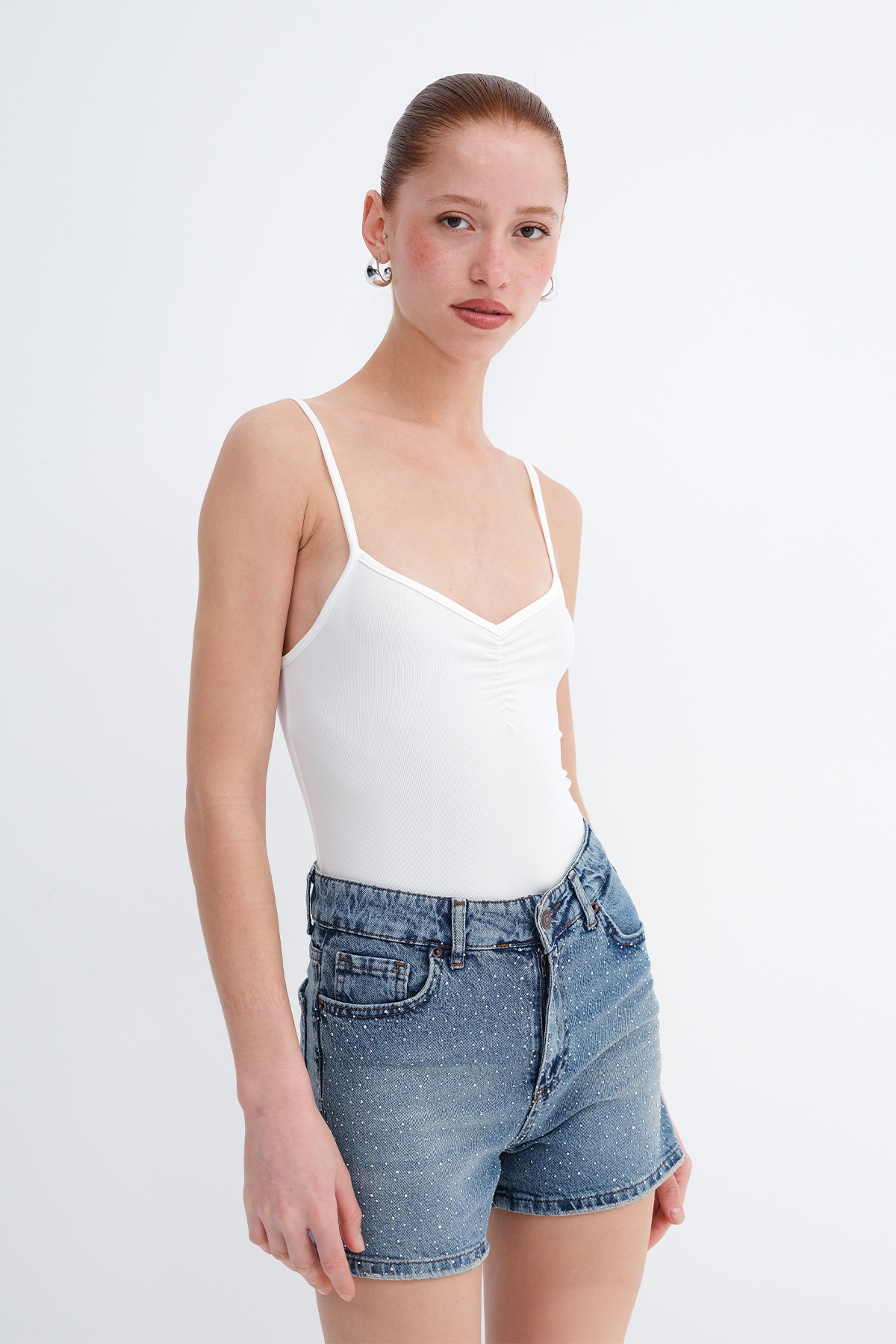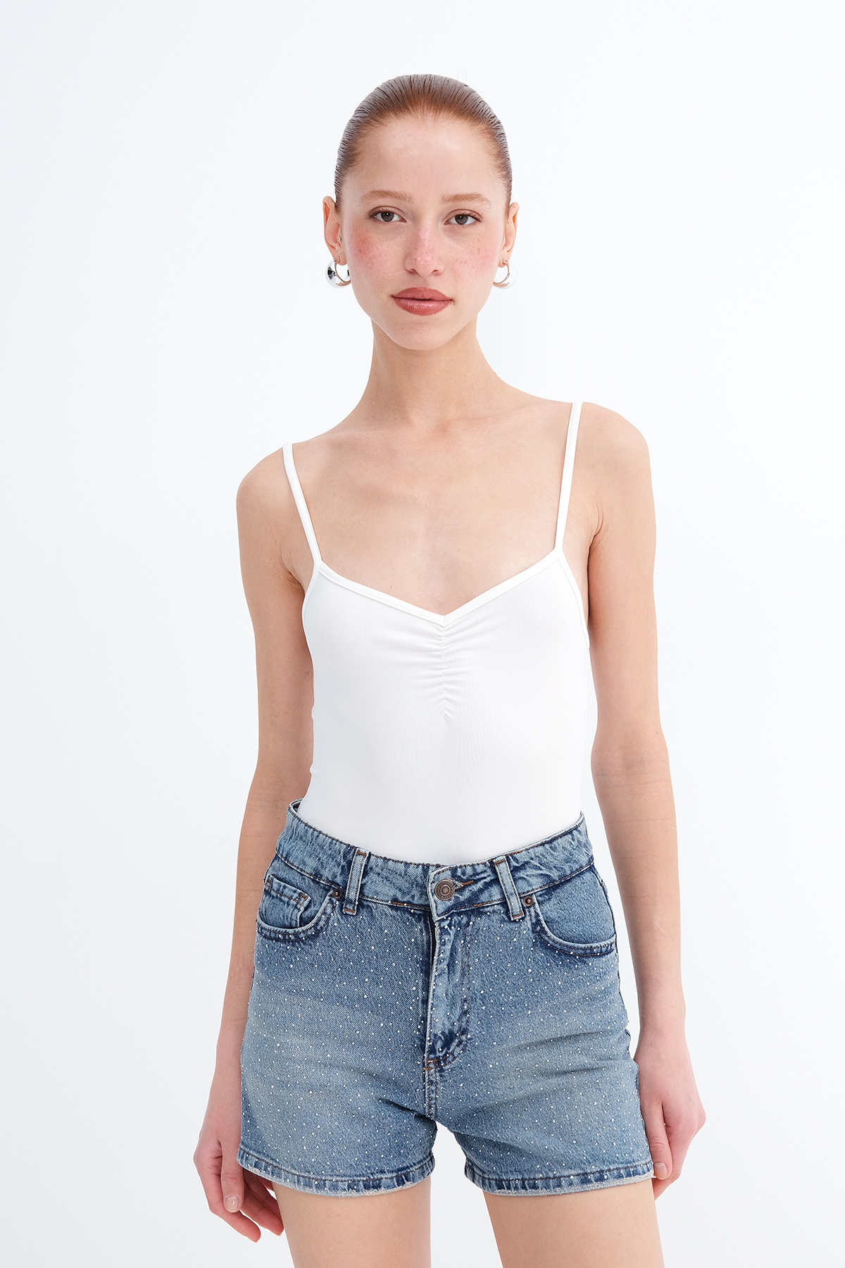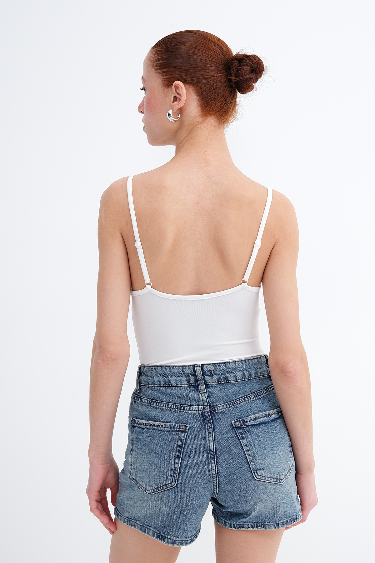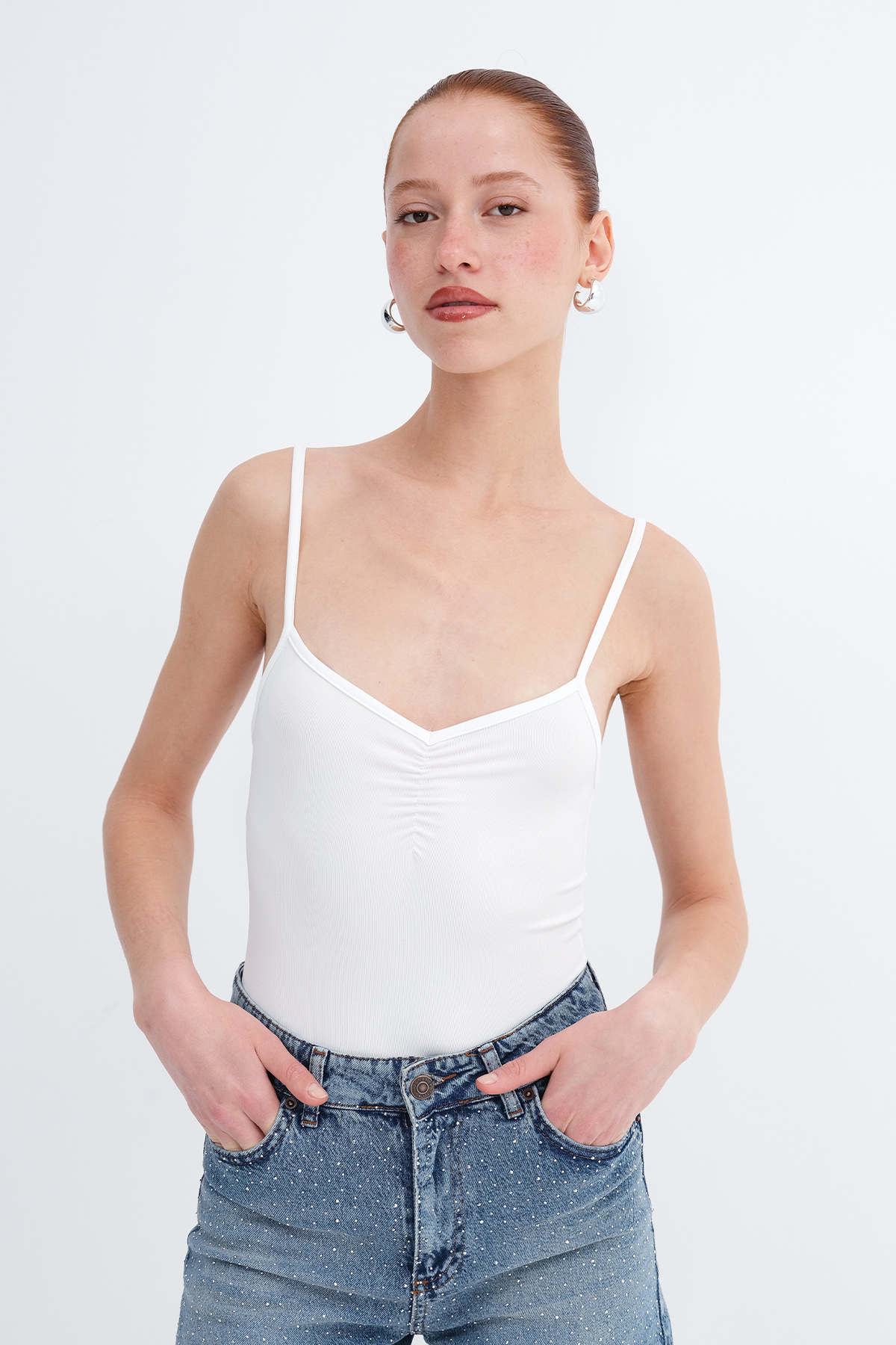 * Vücudu saran, düz renk bodysuit,