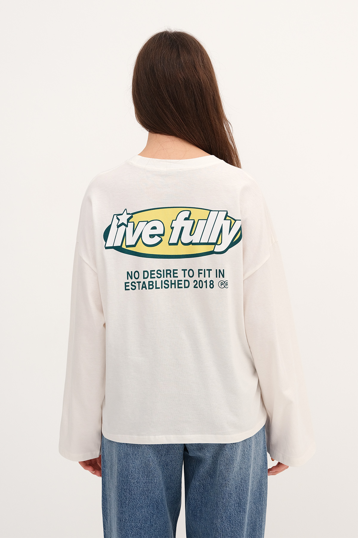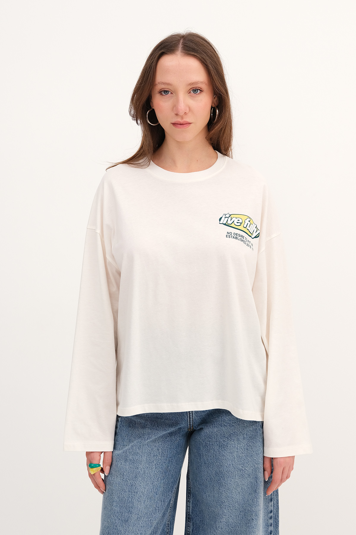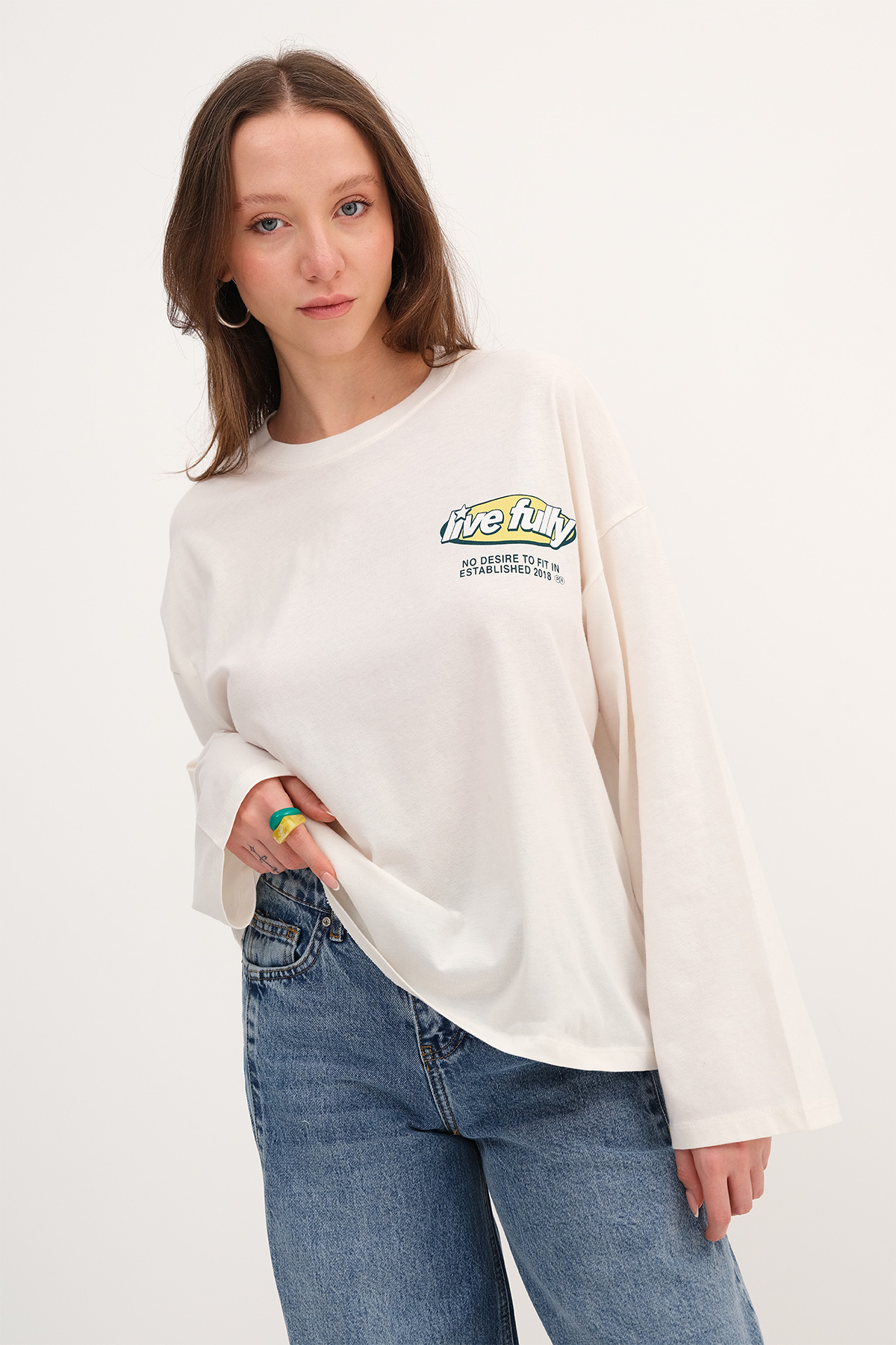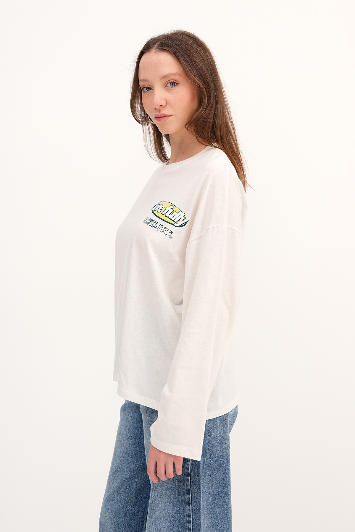 * Bisiklet yaka, uzun kollu,* Düşük omuz, rahat kalıp,* Baskılı, t-shirt,* Ürün içeriği: %100 pamuk* Manken üzerindeki ürün36/S bedendir.* Numune beden ölçüleri: Boy: 58 cm Göğüs: 110 cm kol boyu: 46 cm (1-3 cm değişiklik gösterebilir)* Ürün çekimlerinde renkler, ışık farklılığından dolayı değişkenlik gösterebilir.