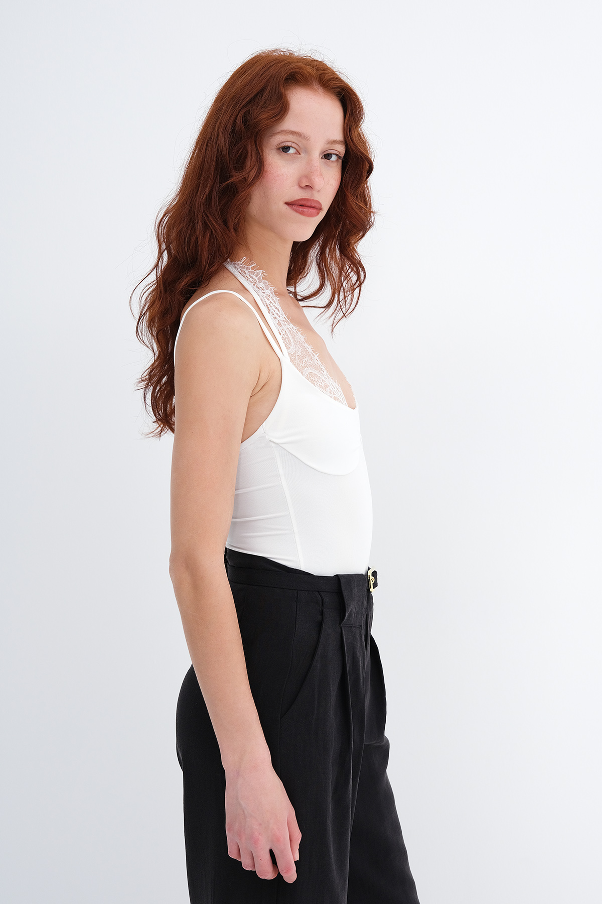* Dantel detaylı, vücudu saran bodysuit,