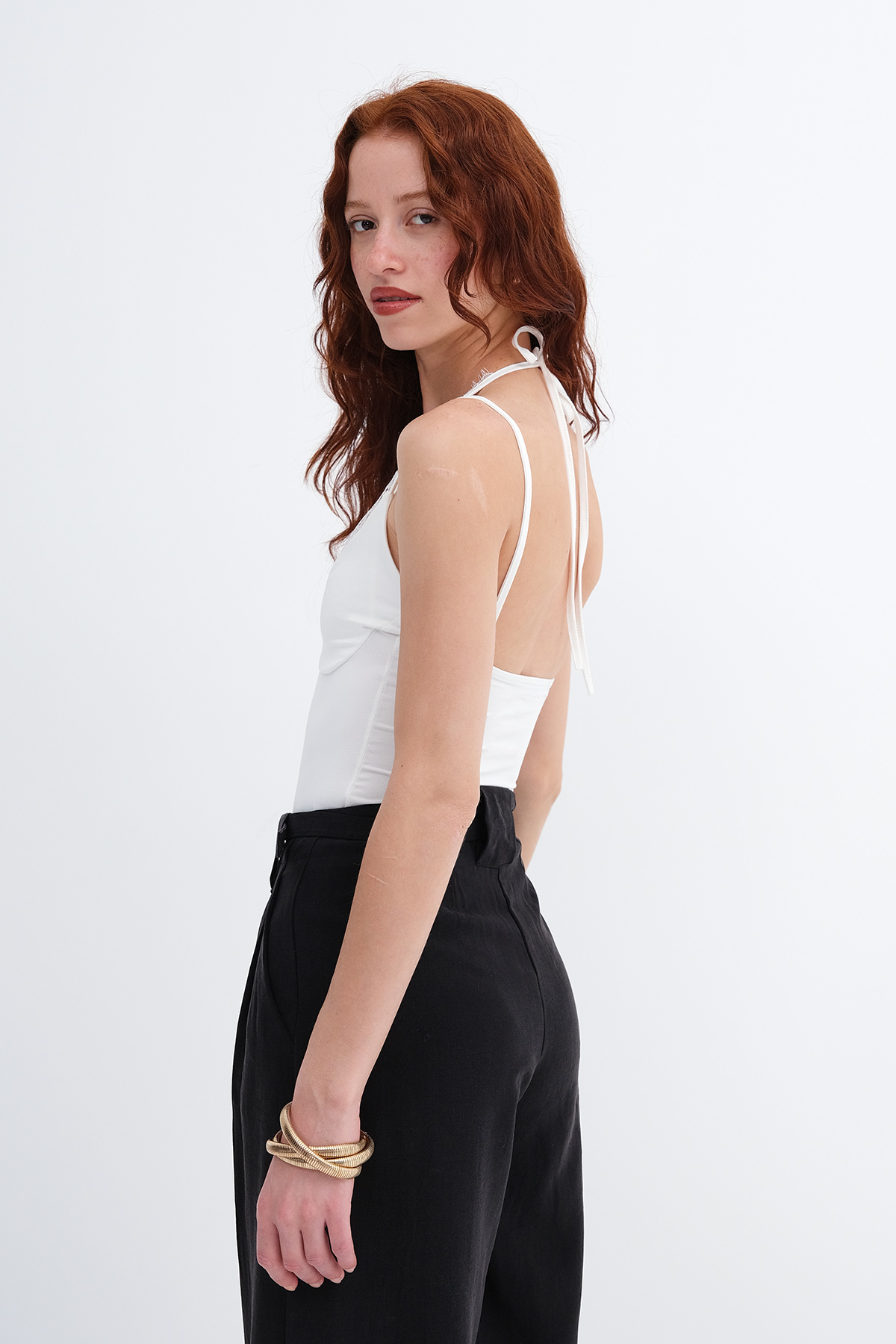 * Askılı, boyundan geçmeli, u yaka,