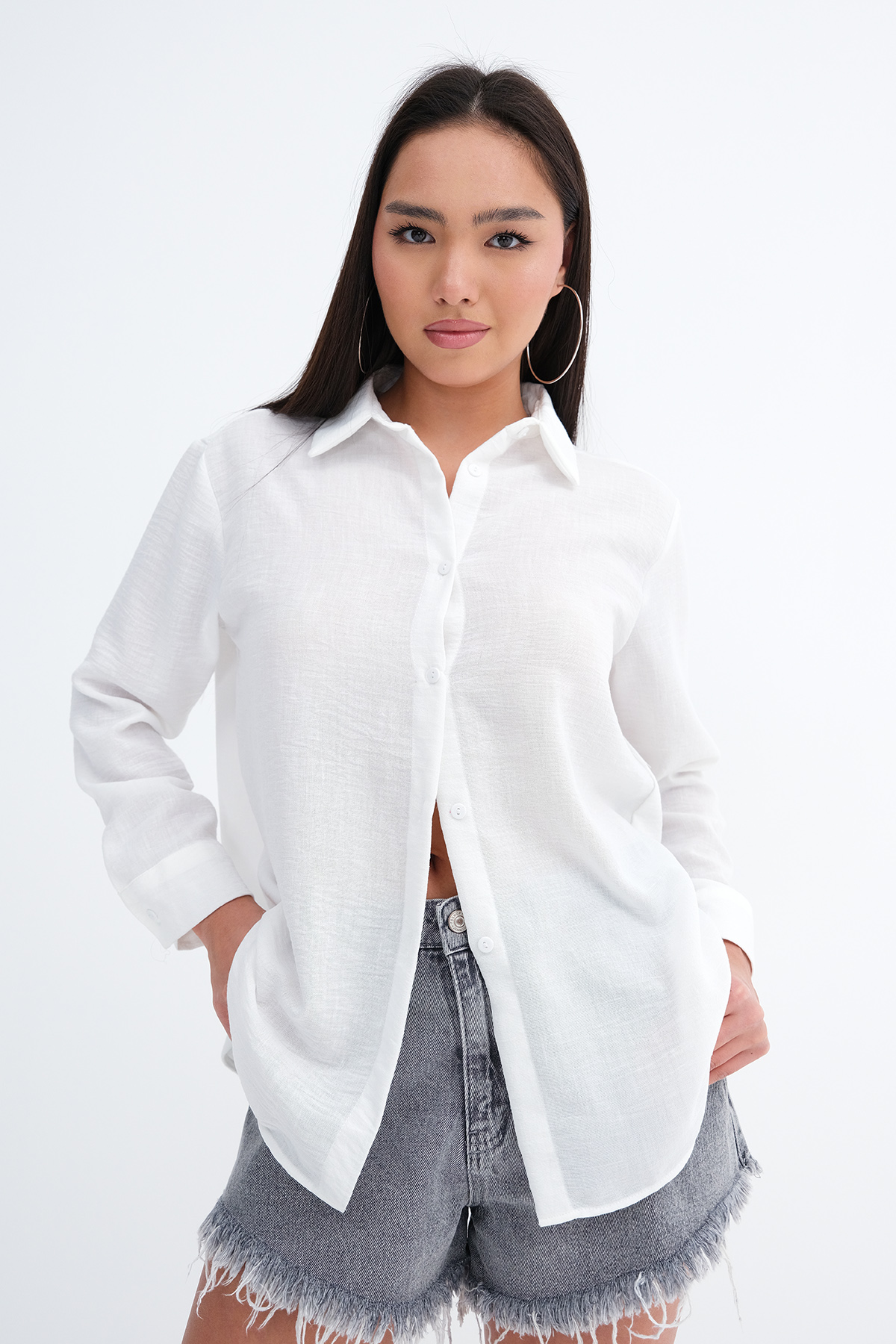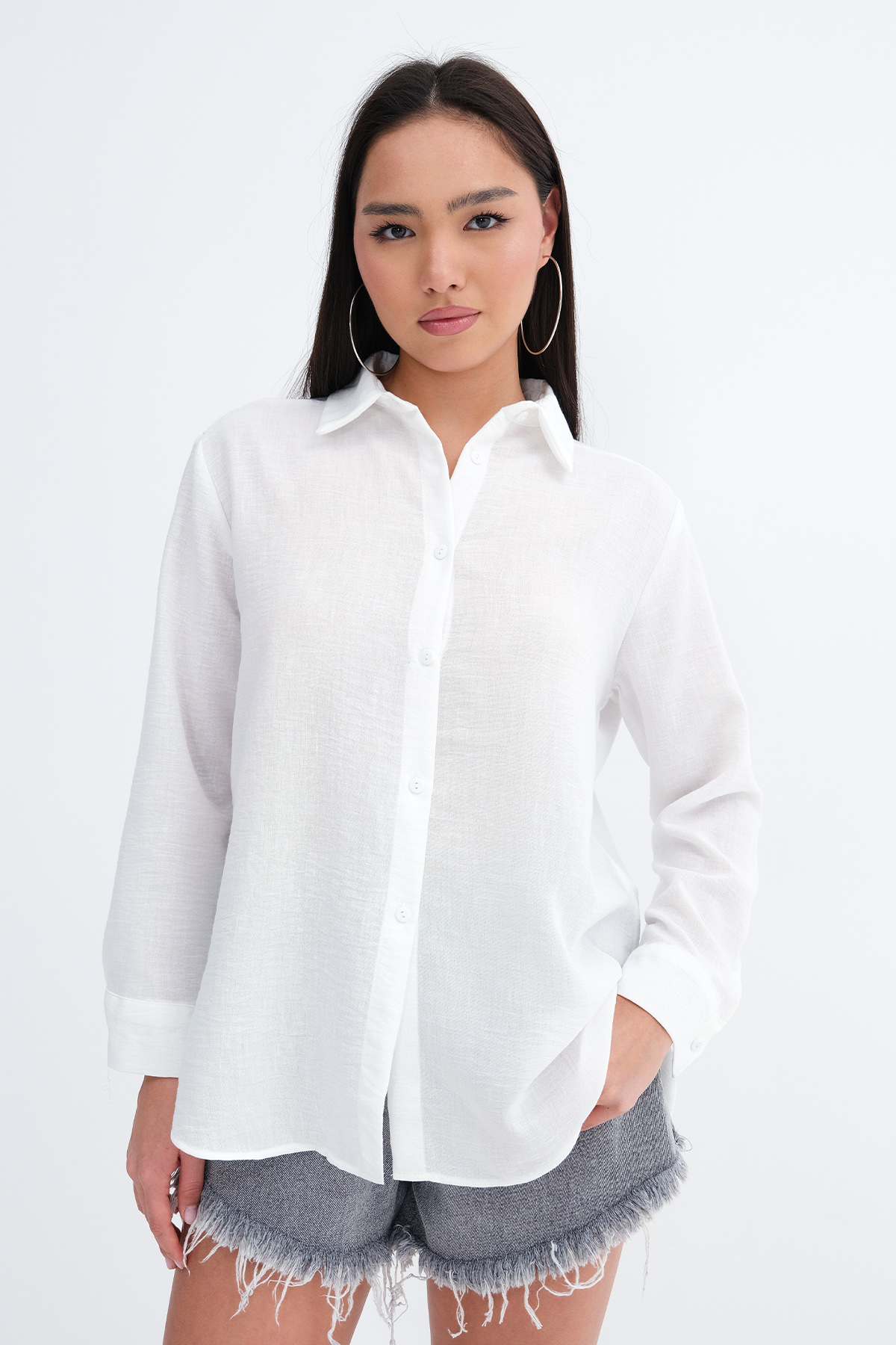 * Düğmeli, düz renk gömlek,