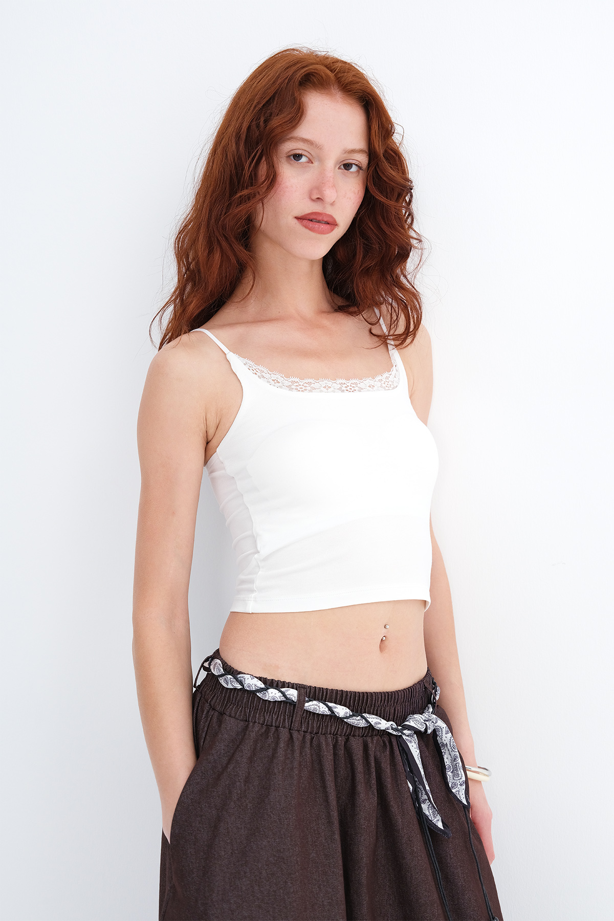 * U yaka, ince askılı, yakası dantelli,