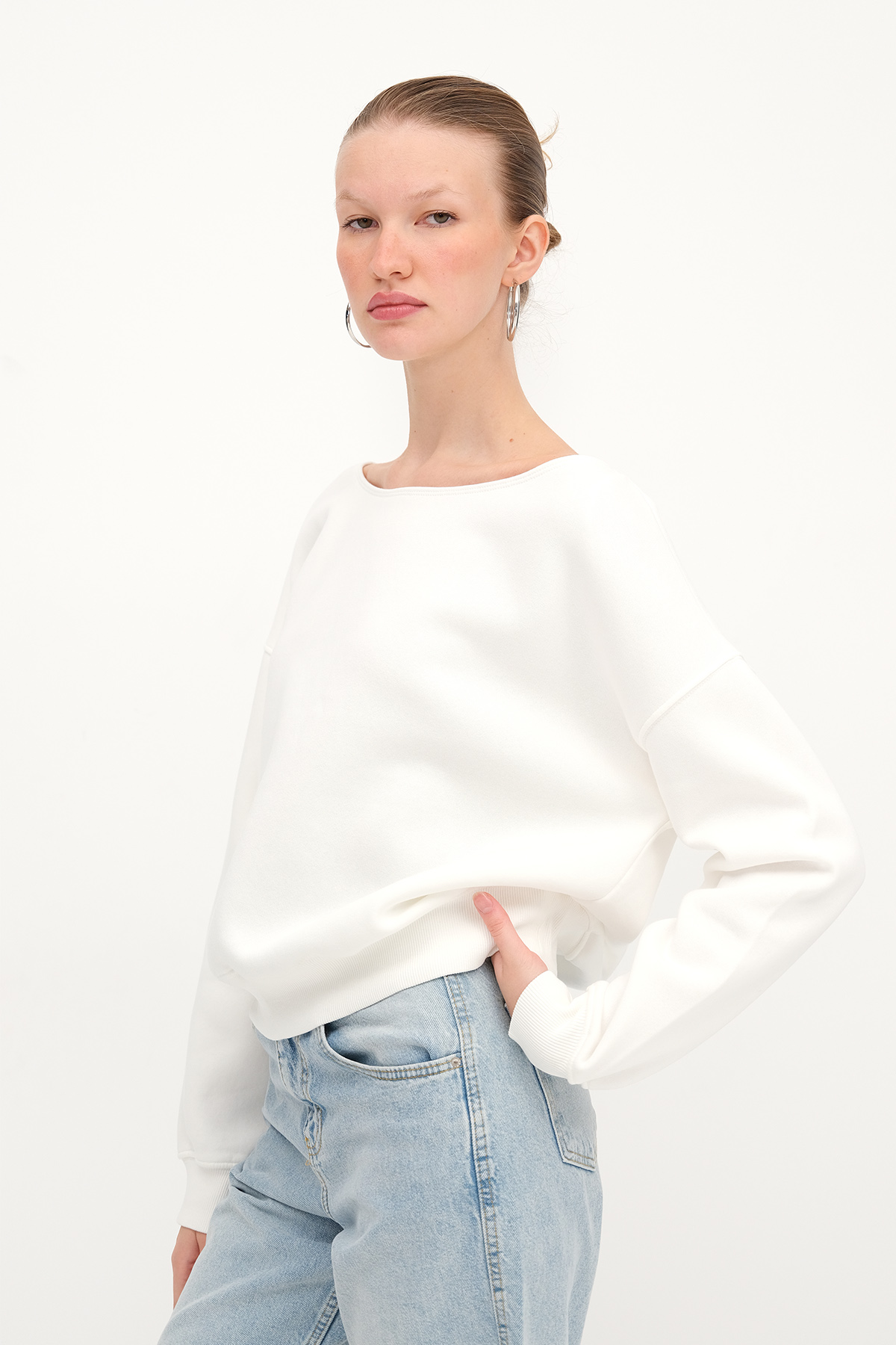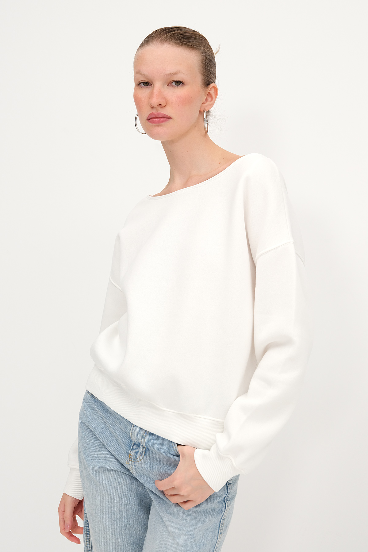 * Kayık yaka, uzun kollu, düşük omuz, düz renk,