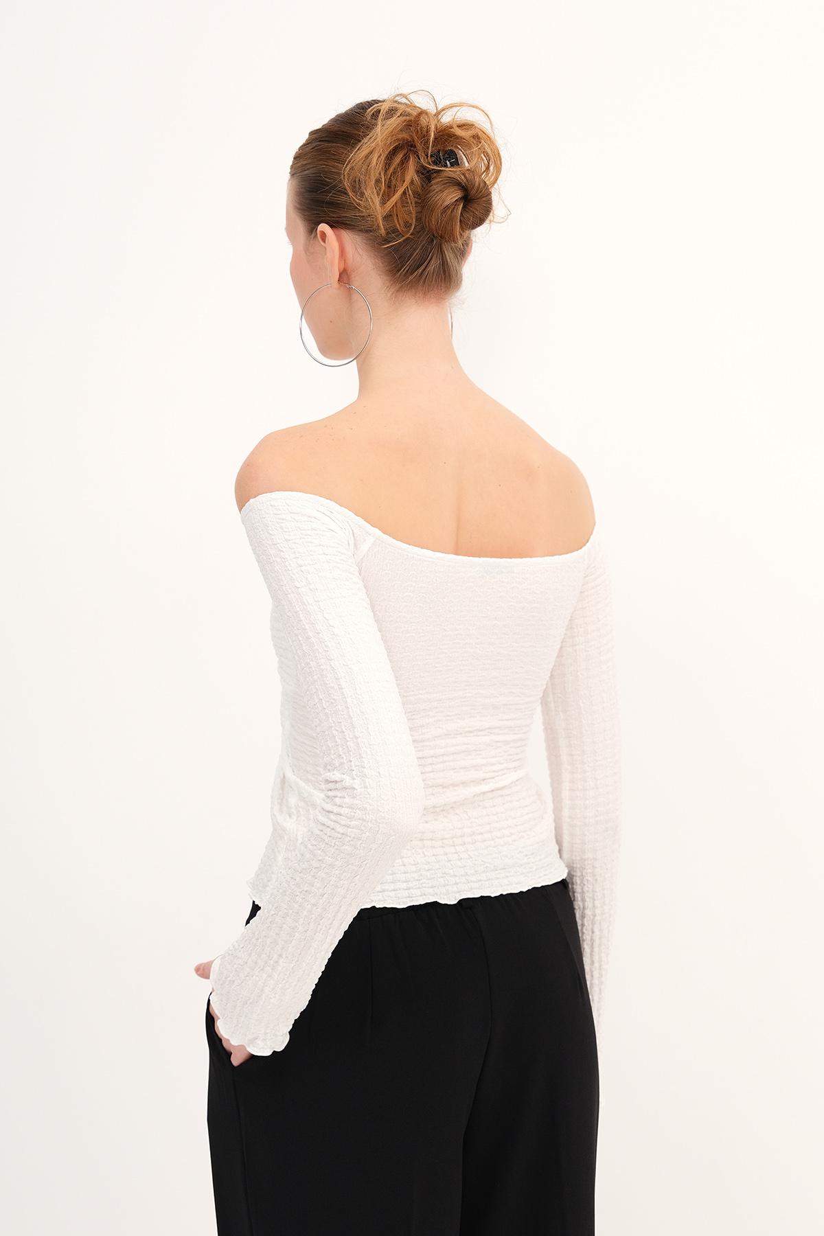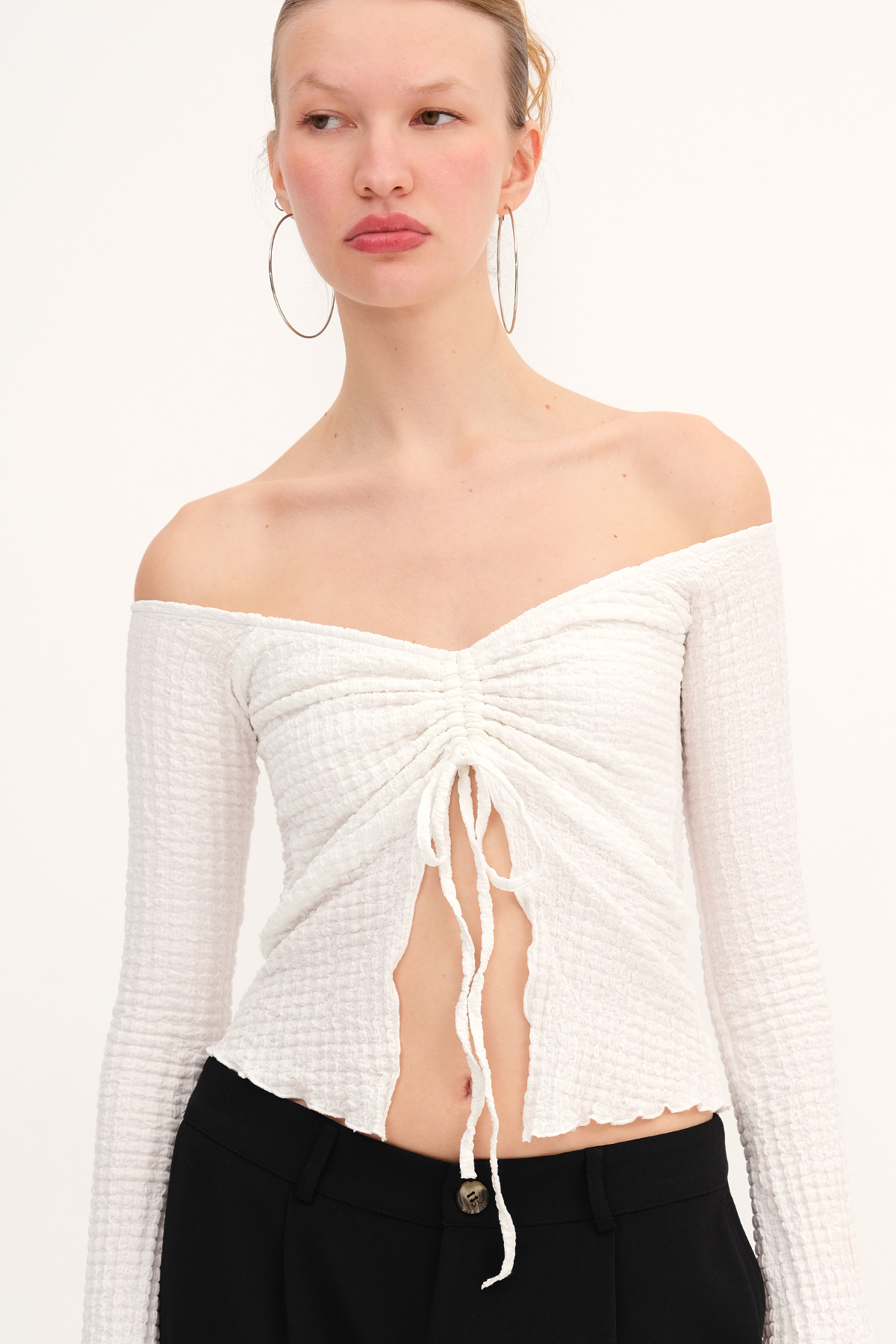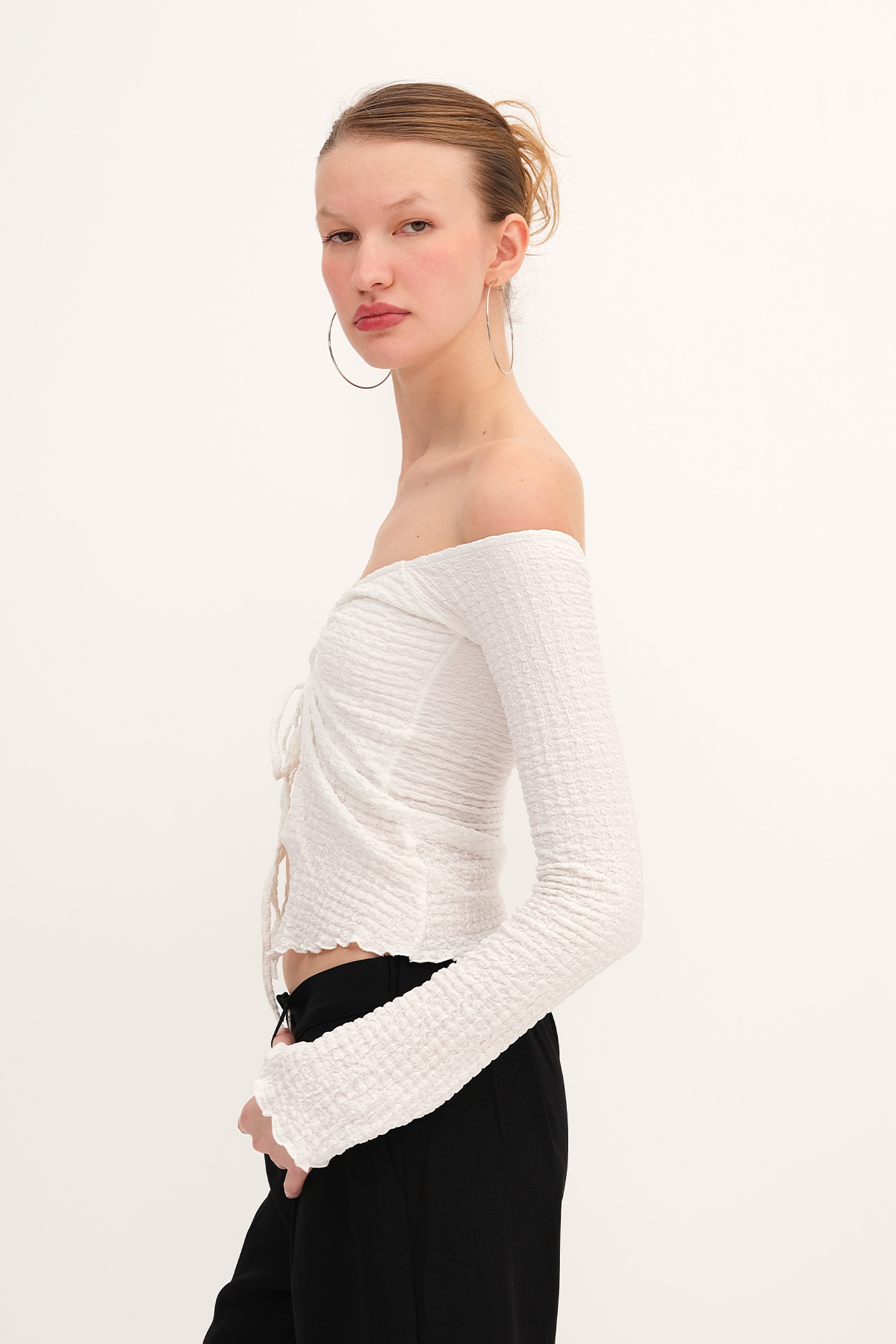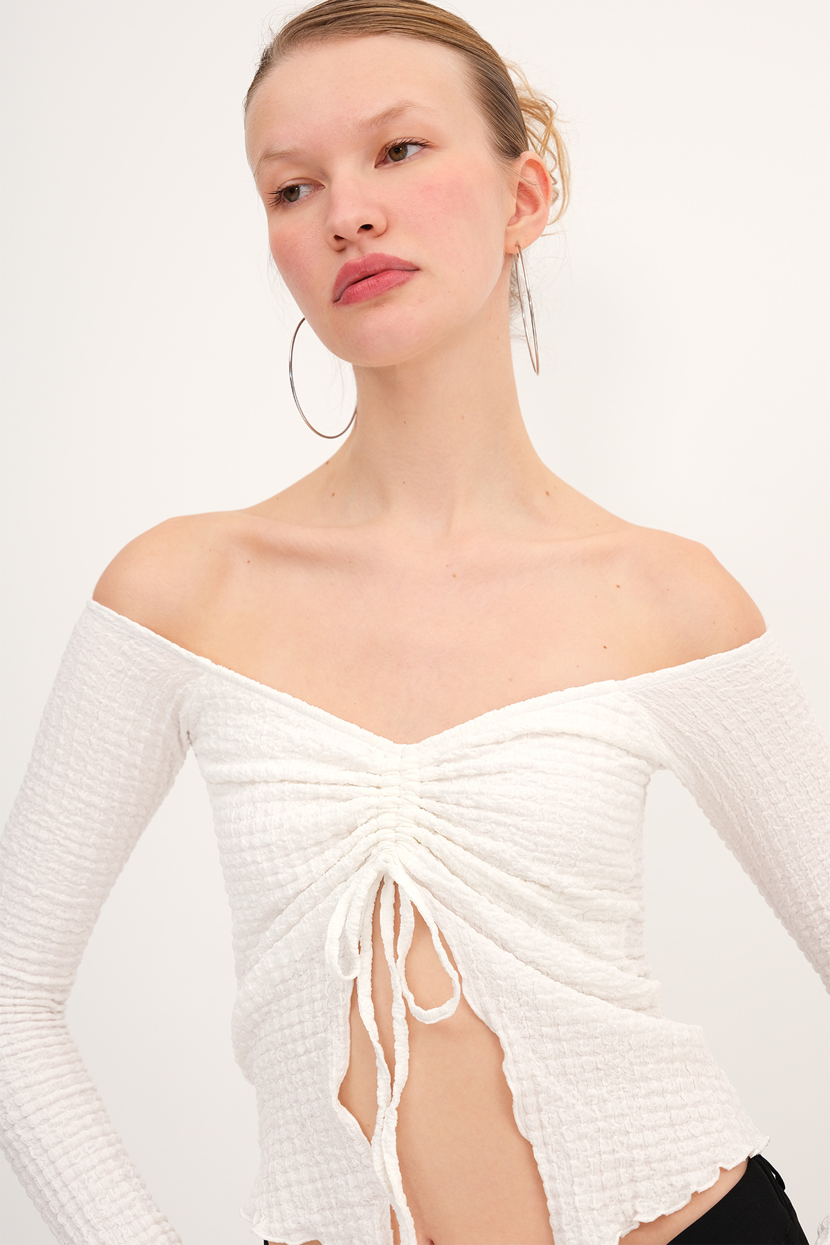 * Kayık yaka, uzun kollu,* Dokulu, önü büzgülü,* Crop bluz,* Ürün içeriği:%95 Polyester %5 Elastan,* Manken üzerindeki ürün 36/S bedendir.* Numune Beden Ölçüleri: Boy: 45 cm Göğüs: 60 cm Kol Boyu: 60 cm* Kol boyu omuzdan ölçülmüştür. (1-3 cm arasında değişiklik gösterebilir)* Ürün çekimlerinde renkler, ışık farklılığından dolayı değişkenlik gösterebilir.