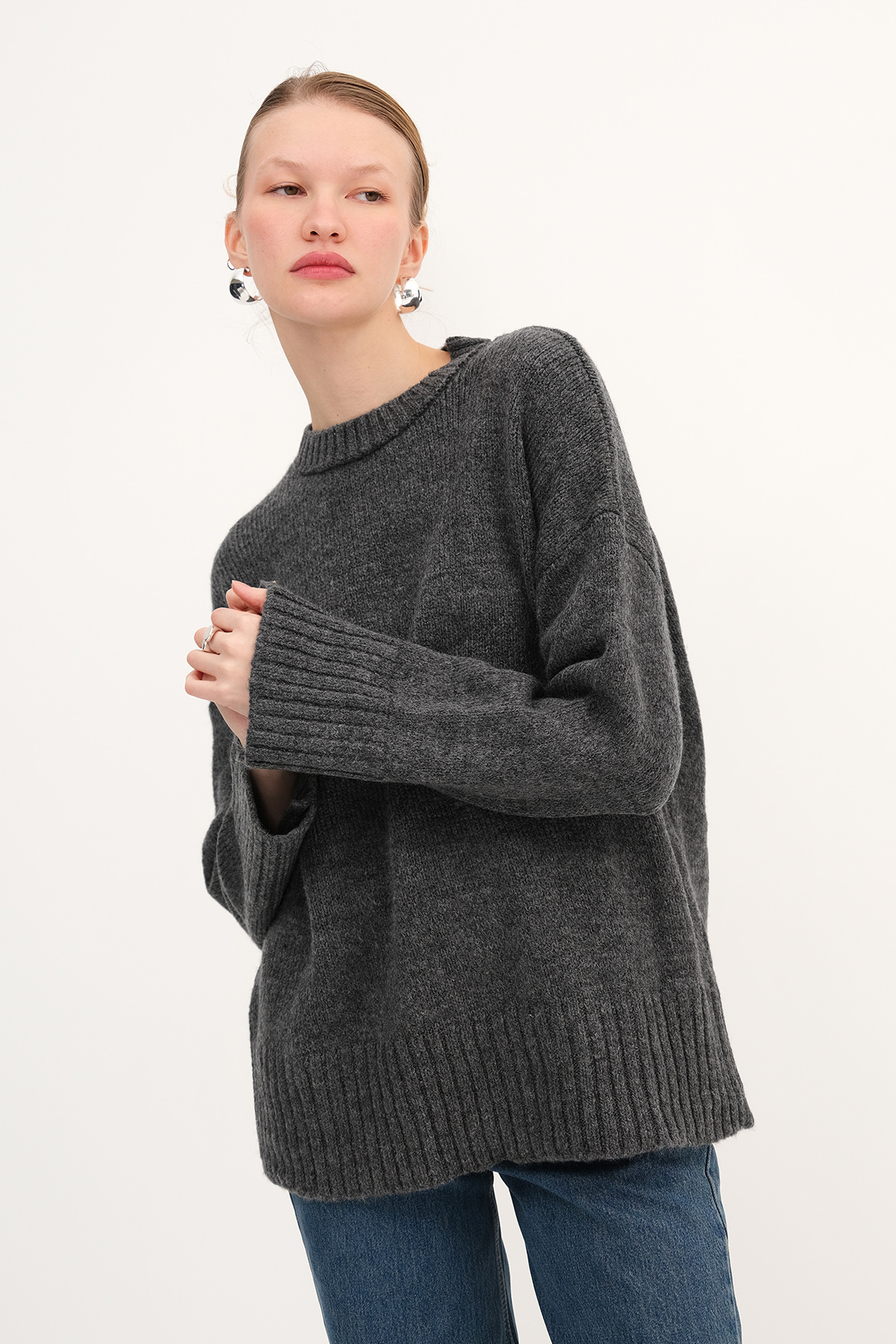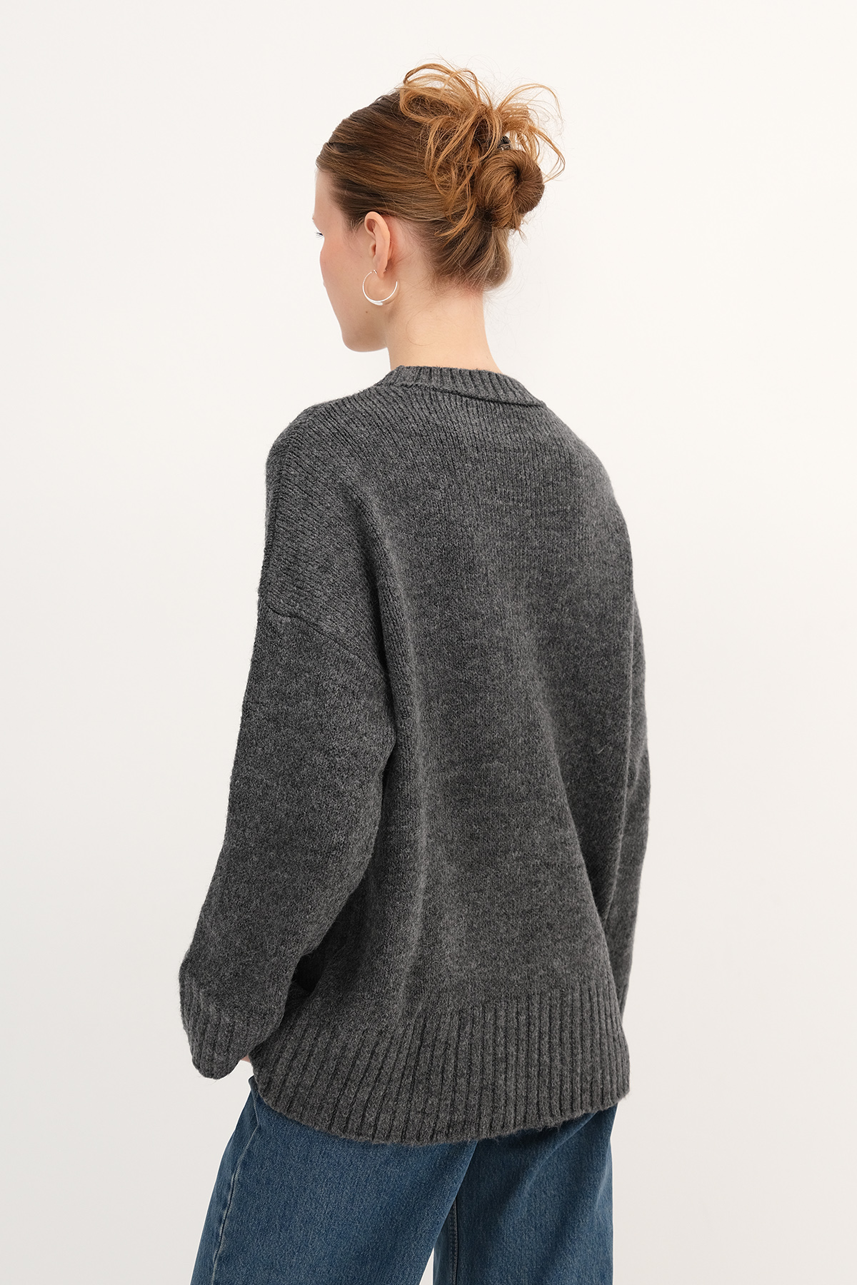 * Bisiklet yaka, uzun kollu,* Düşük omuz, basic,* Rahat kalıp, triko kazak,* Ürün içeriği: %74 Akrilik %19 Polyester %7 Elastan* Manken üzerindeki ürün standart bedendir.* Numune beden ölçüleri: Boy: 63 cm Göğüs: 120 cm Kol boyu: 41 cm (1-3 cm değişiklik gösterebilir)* Ürün çekimlerinde renkler, ışık farklılığından dolayı değişkenlik gösterebilir.