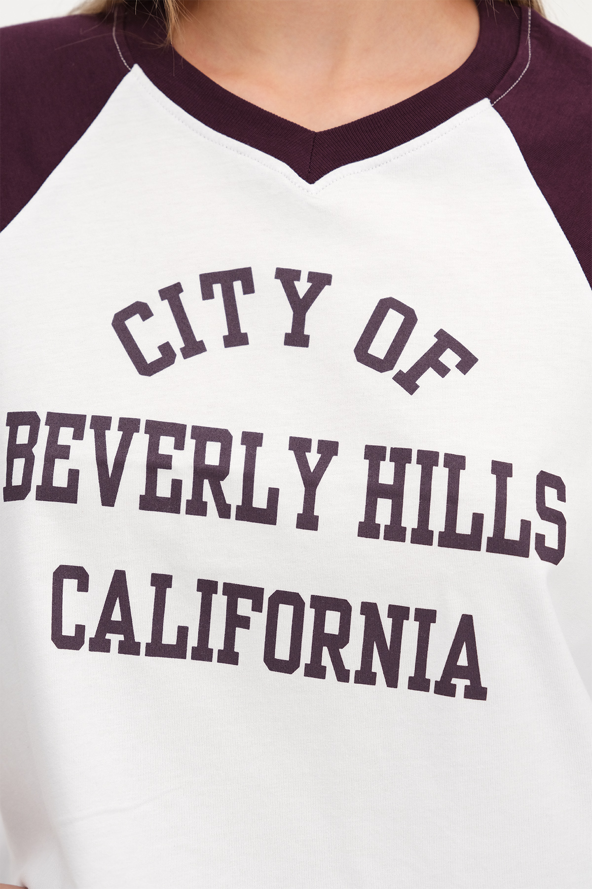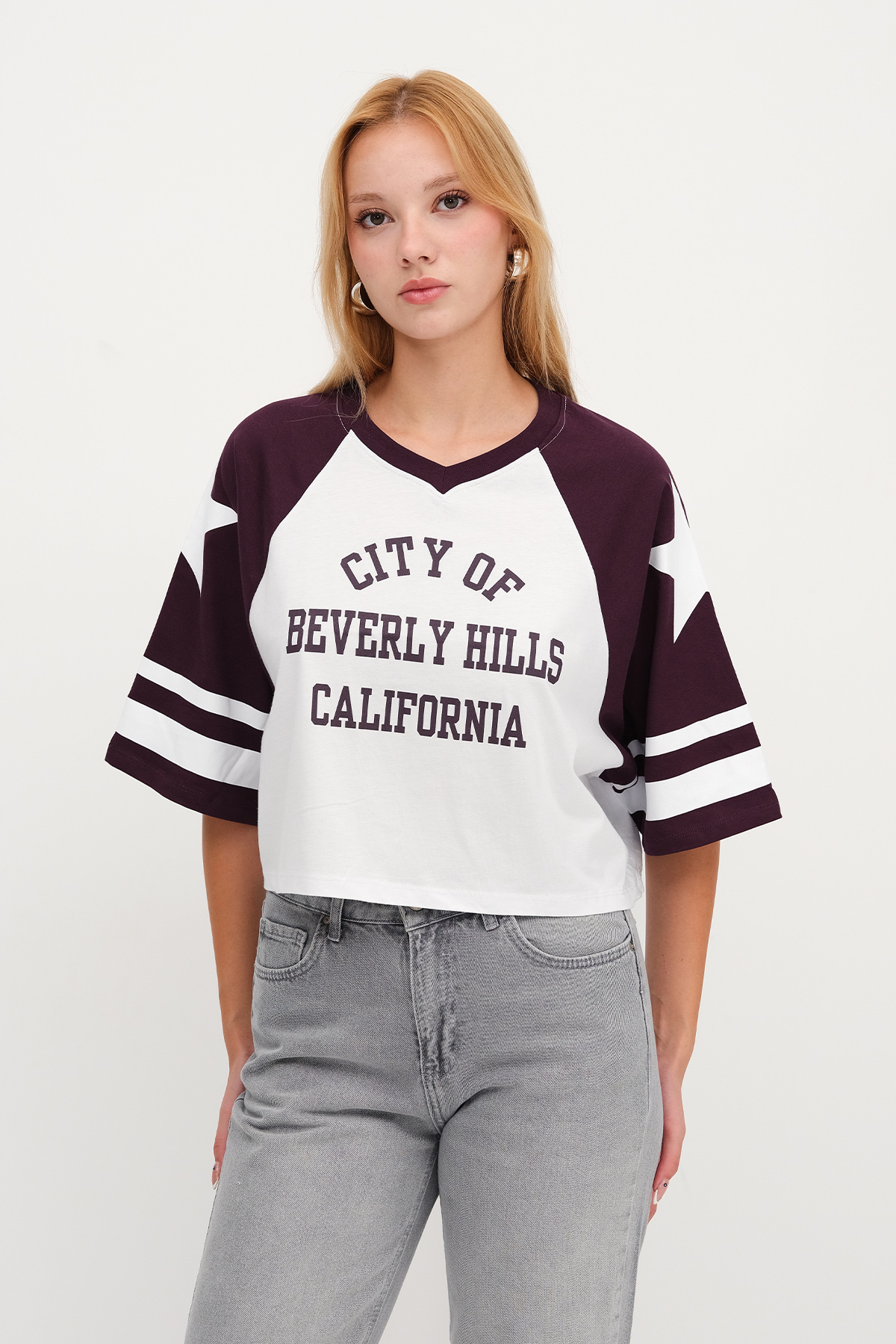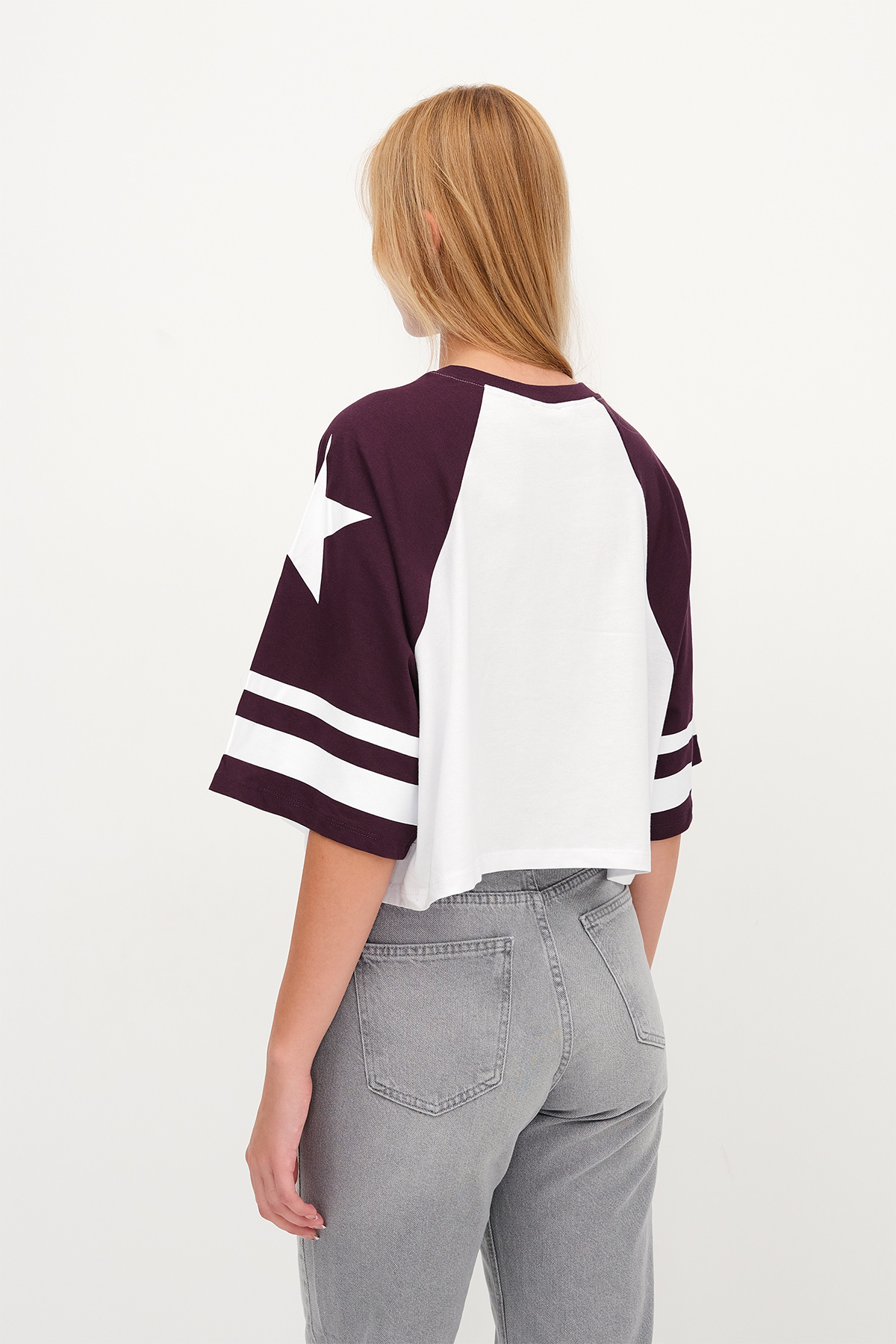 * Yazı baskılı, kolları şeritli, crop t-shirt,