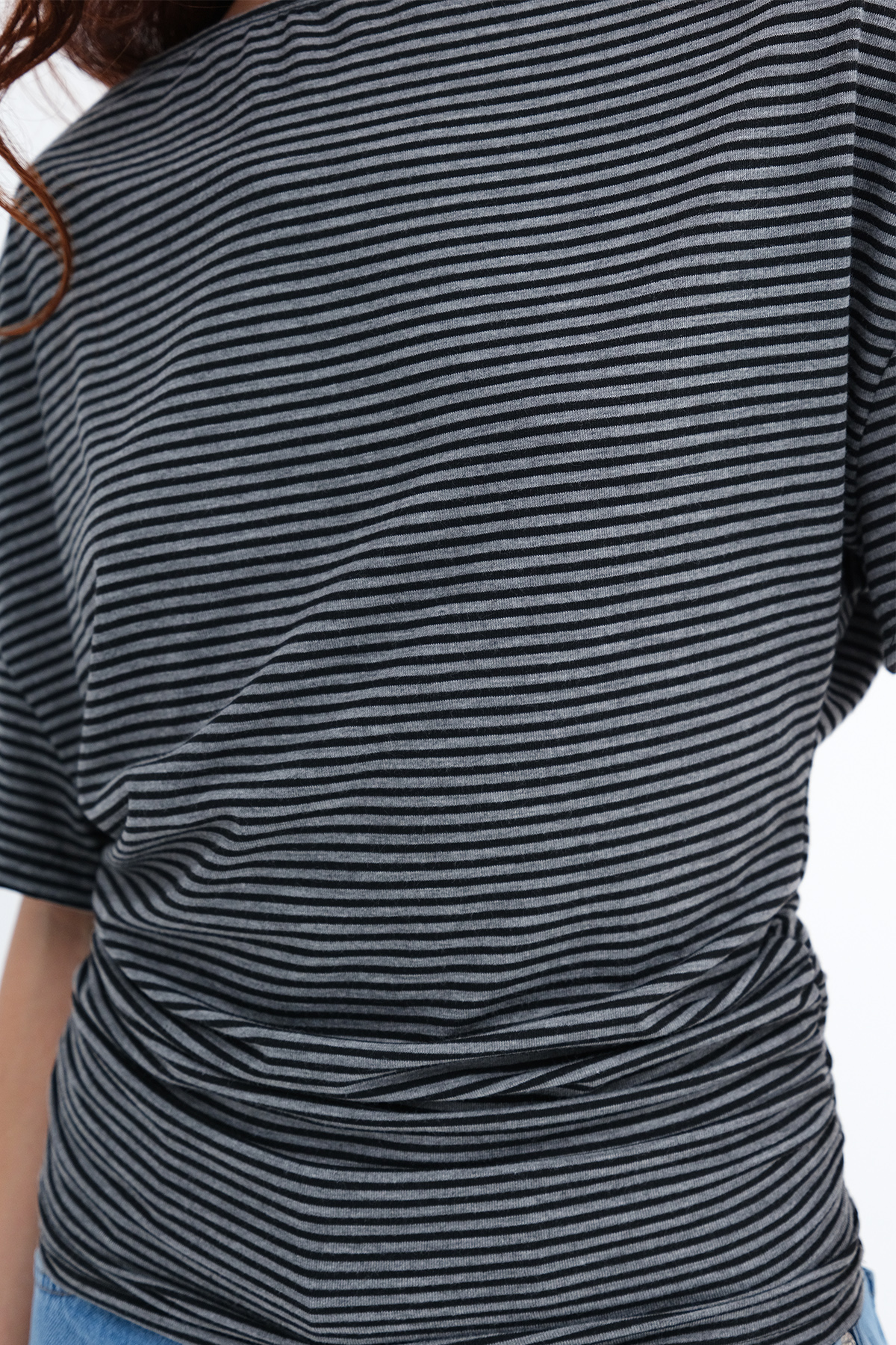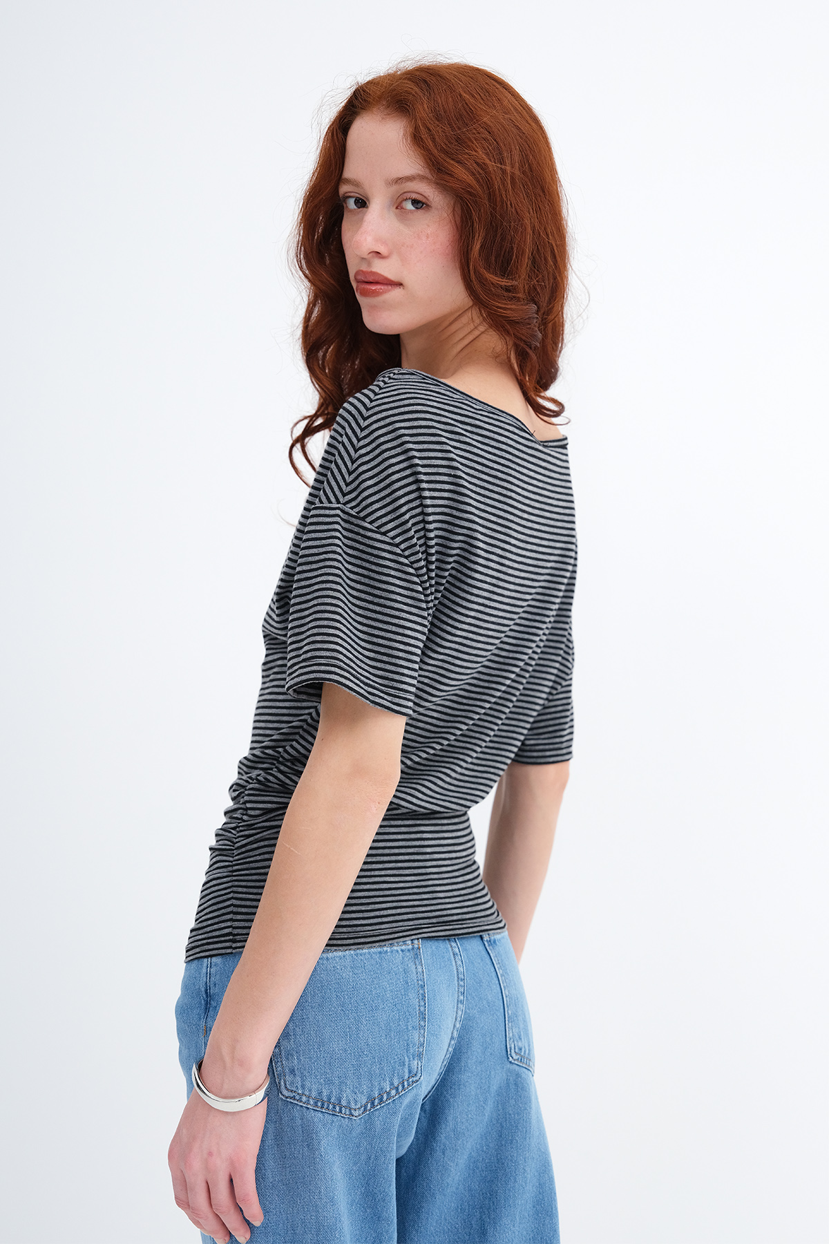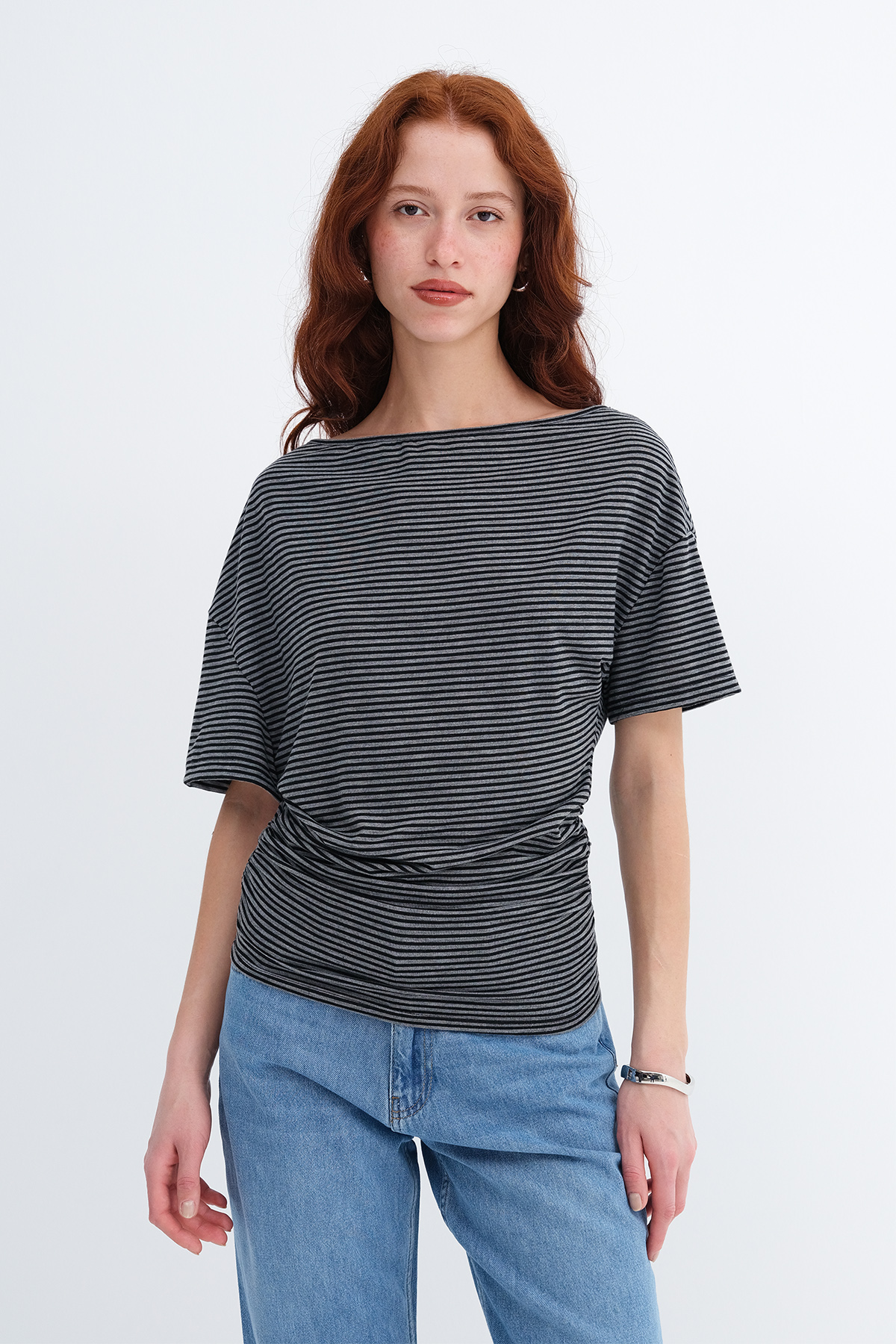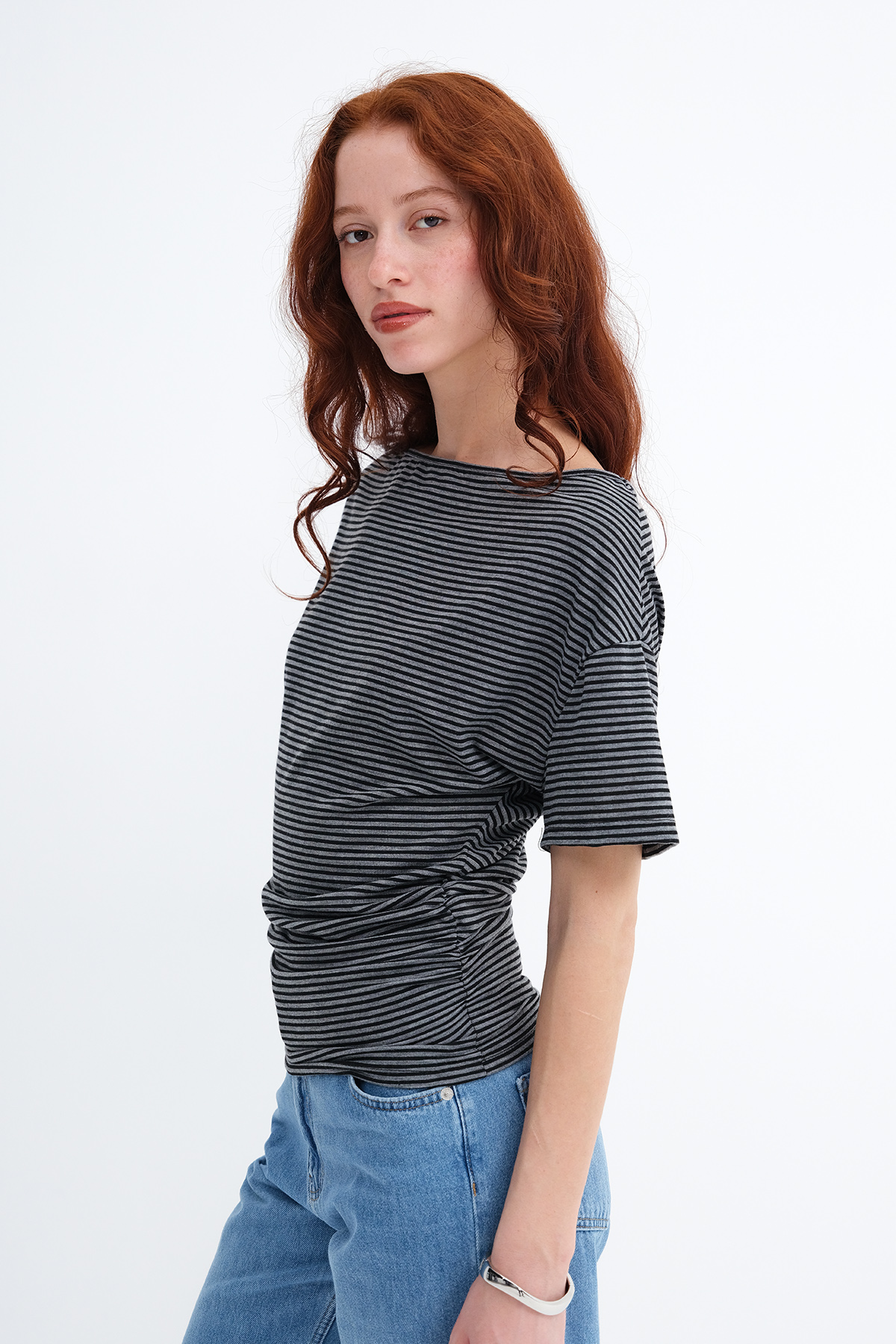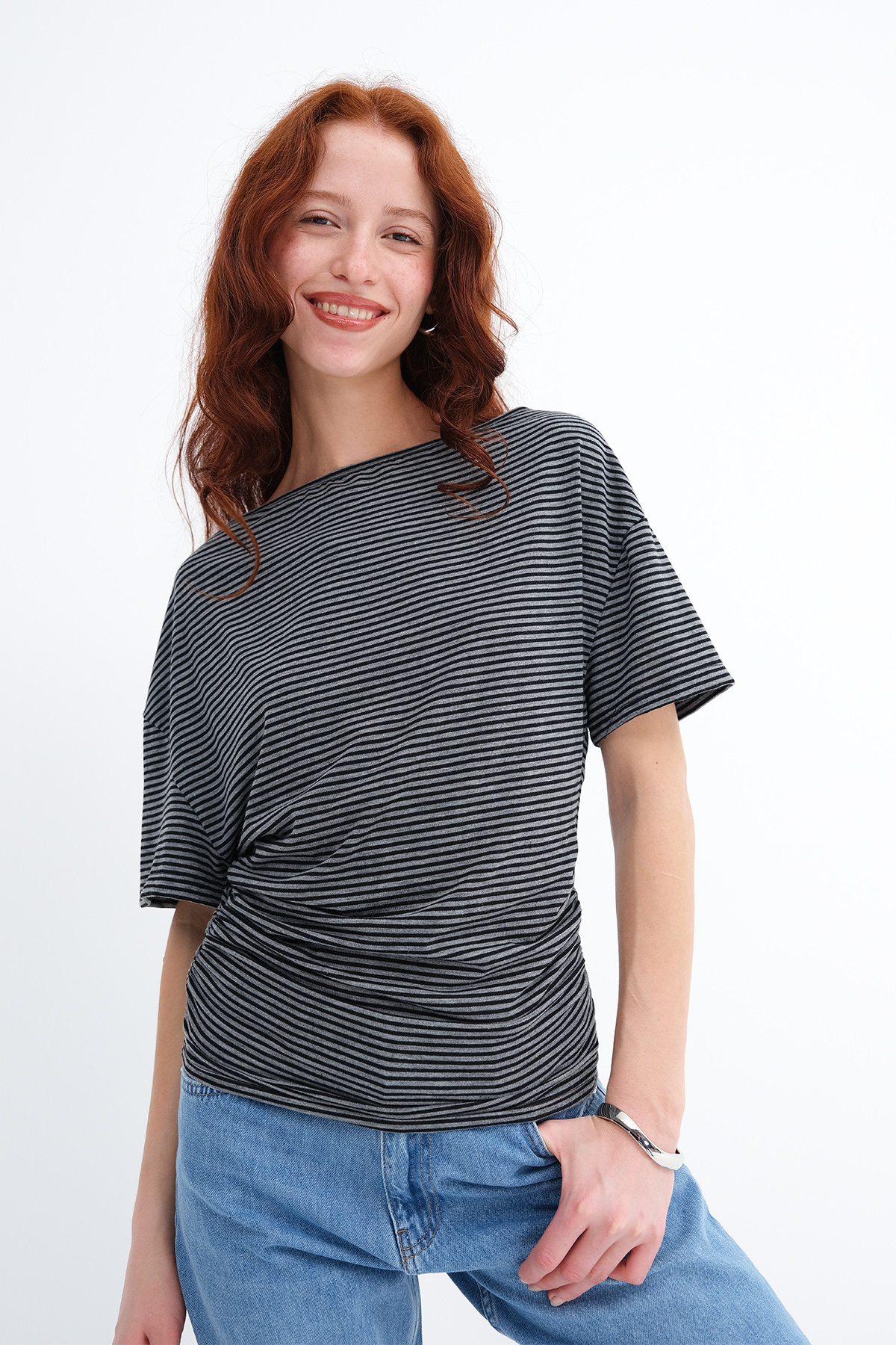 * Çizgili, yanı büzgülü t-shirt,