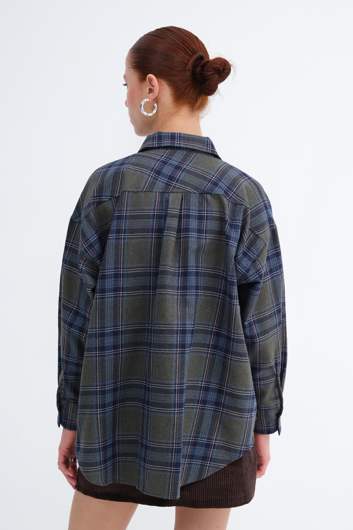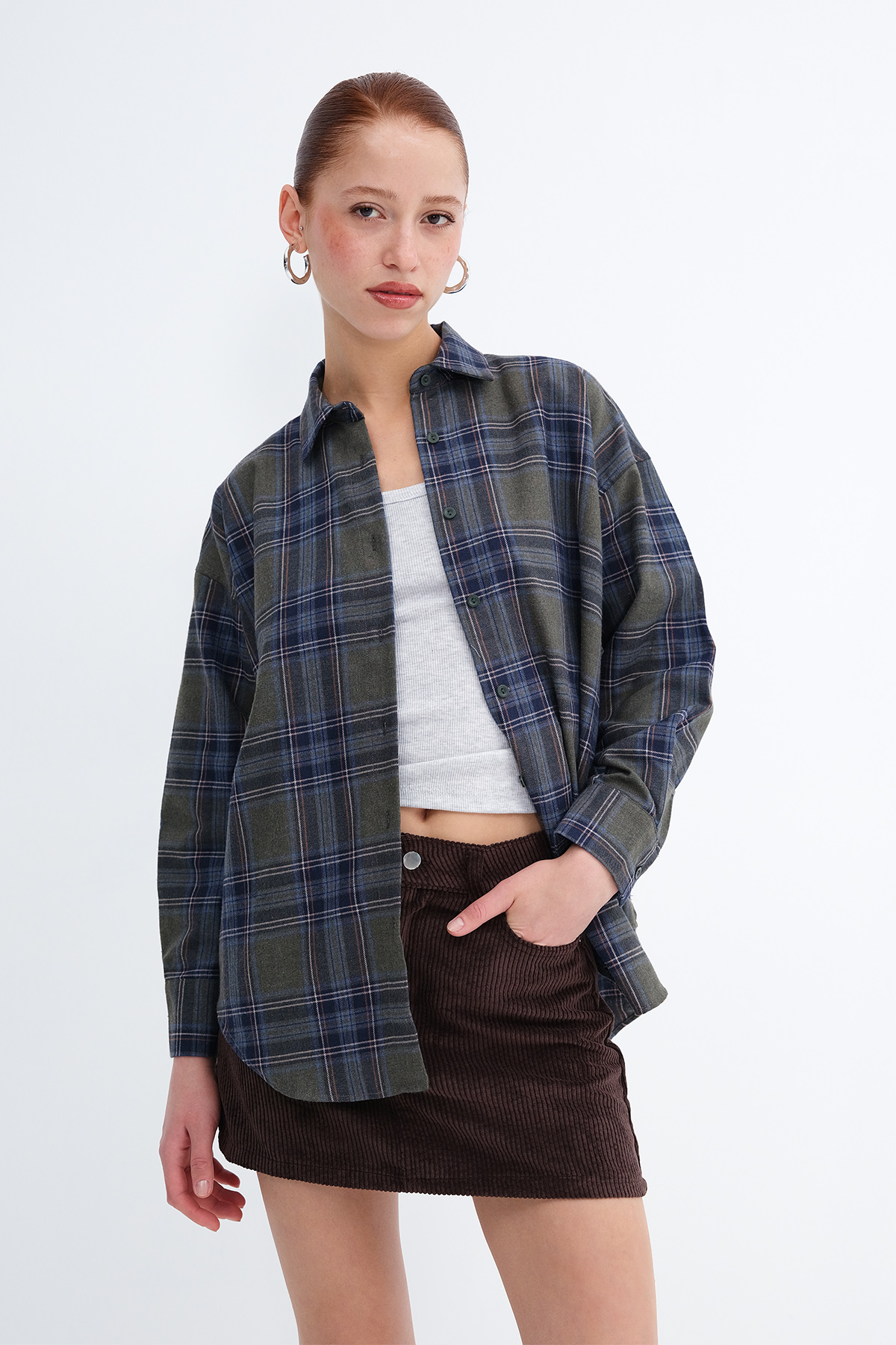 * Düğmeli, ekoseli, rahat kalıp gömlek,