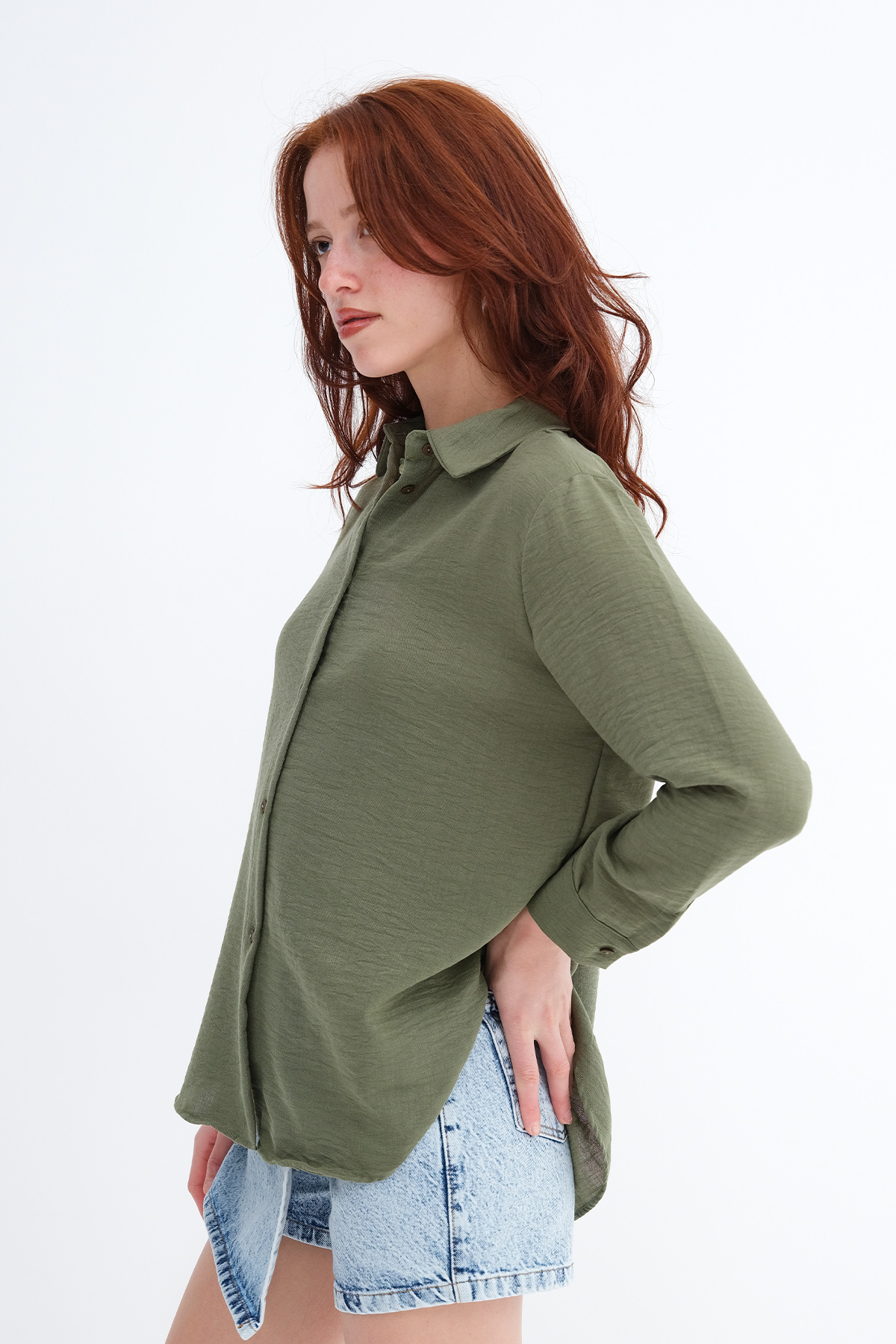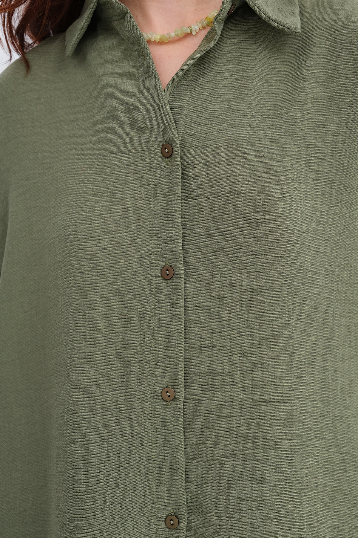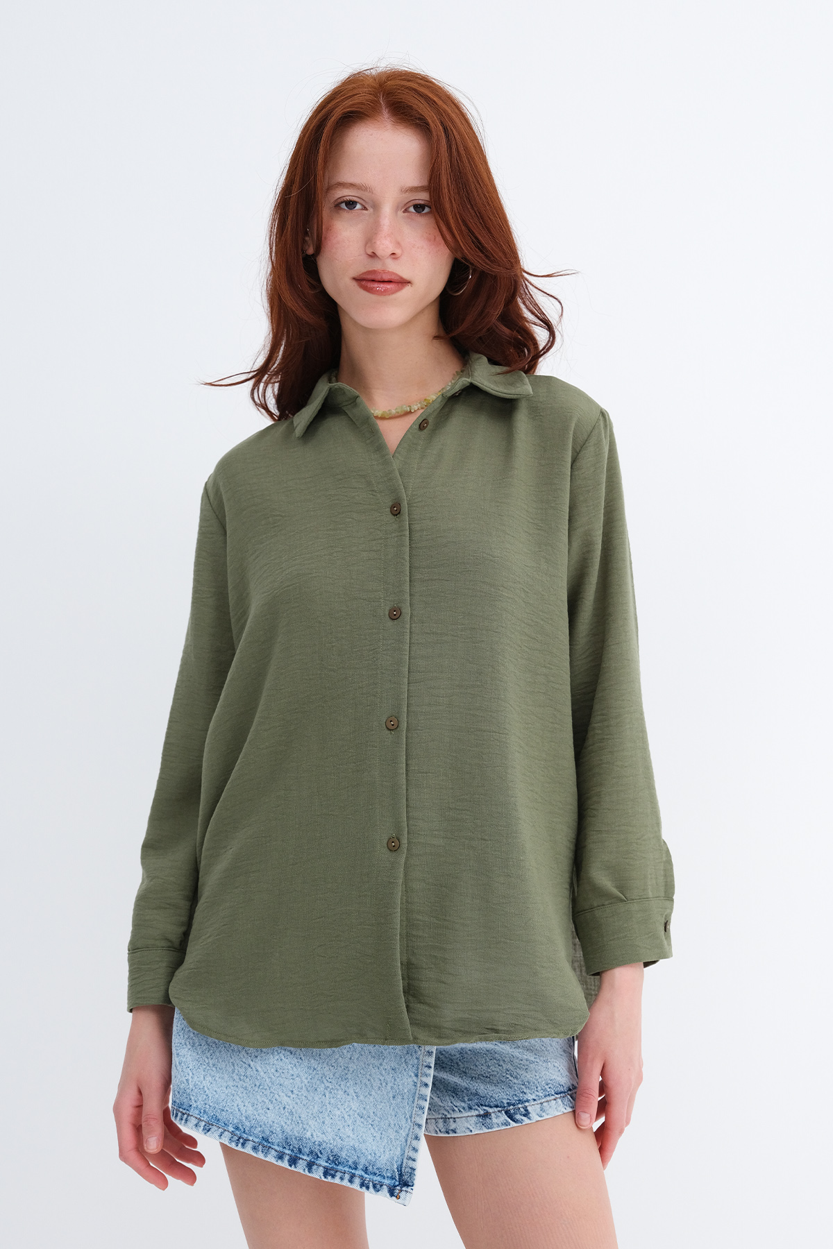 * Düğmeli, düz renk gömlek,