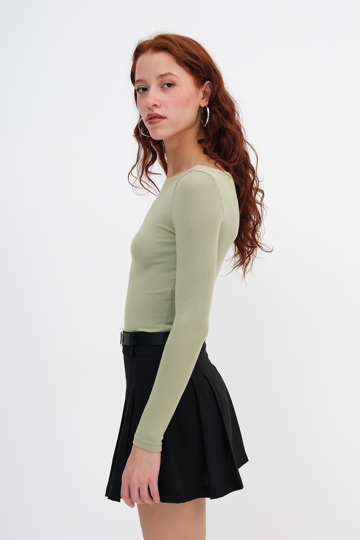 * Kayık yaka, uzun kollu, vücuda oturan basic bluz,