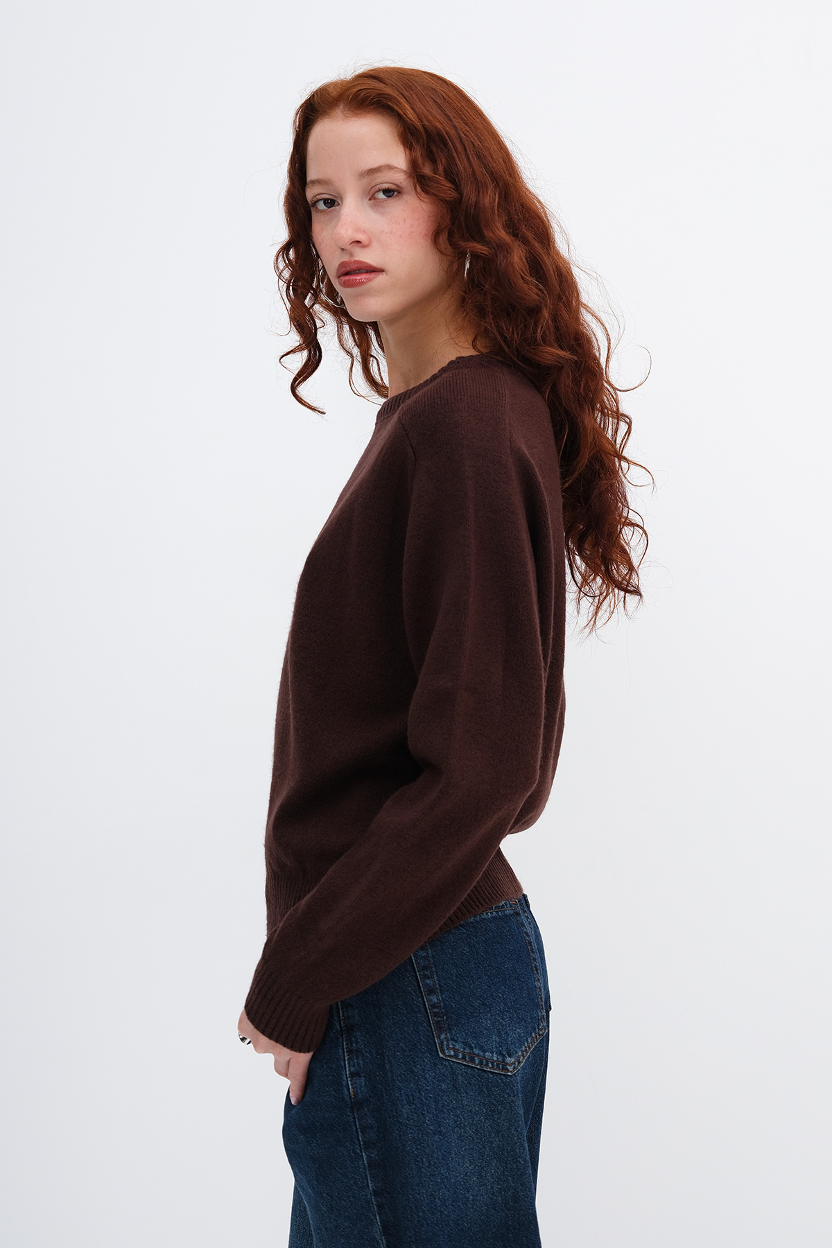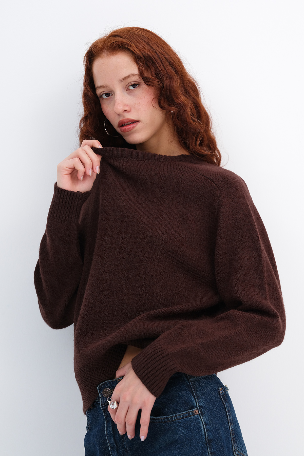 * Yakası, manşetleri ve etek ucu lastik örgülü, triko kazak,