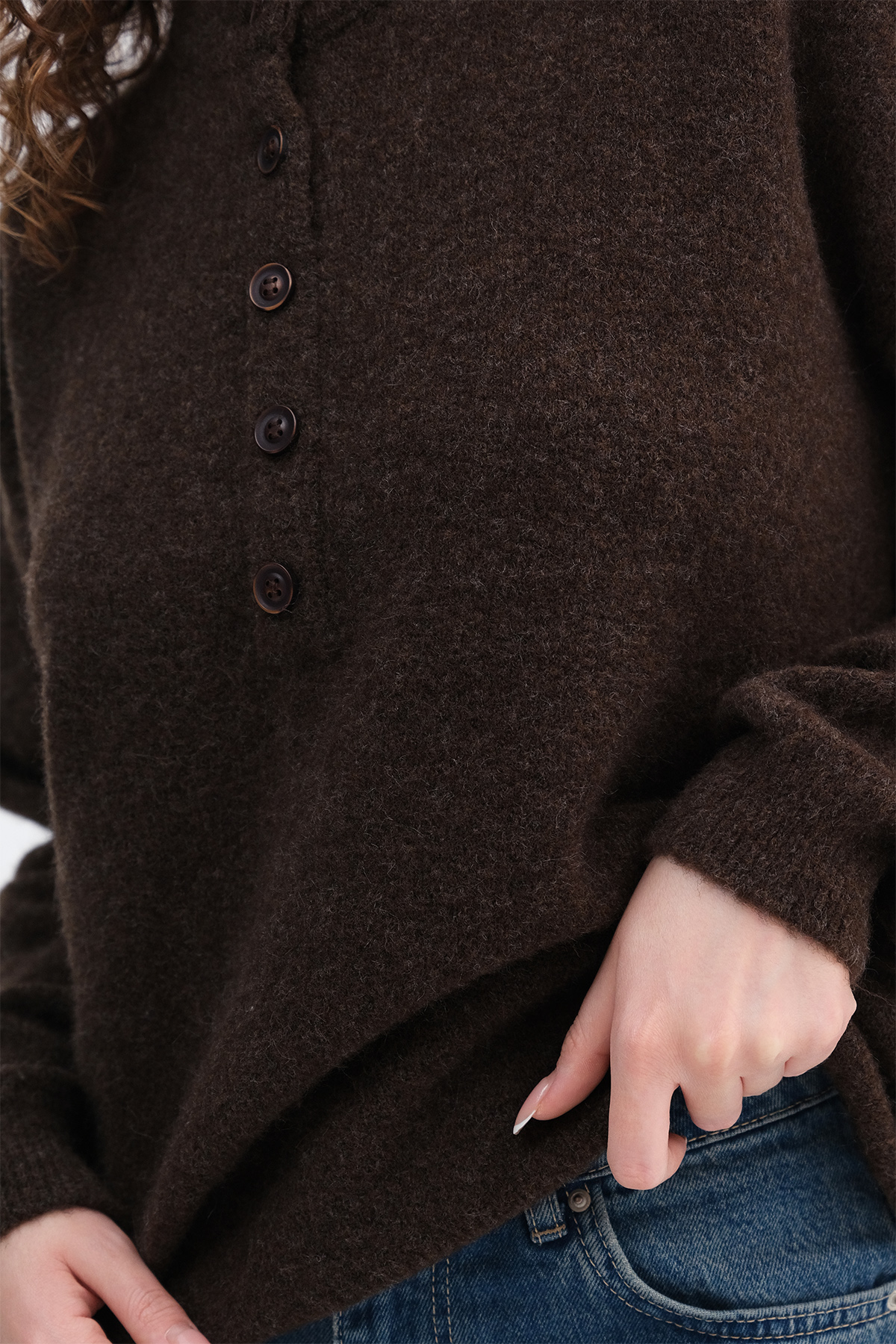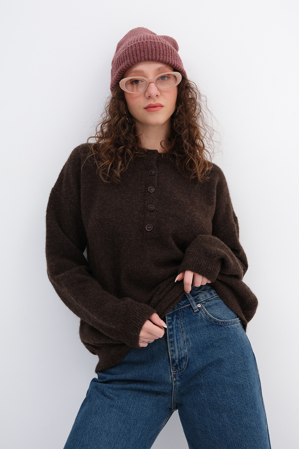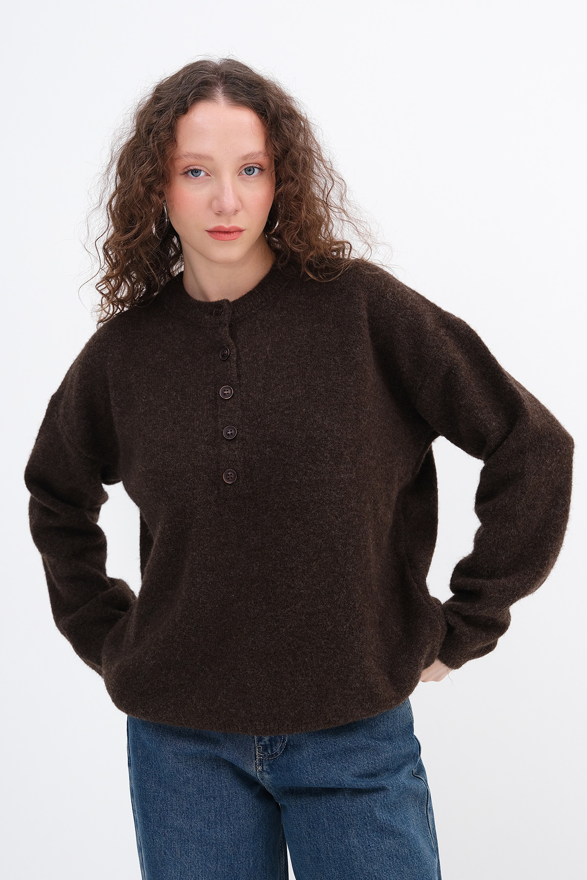 * Düşük omuz, düğmeli, triko kazak,