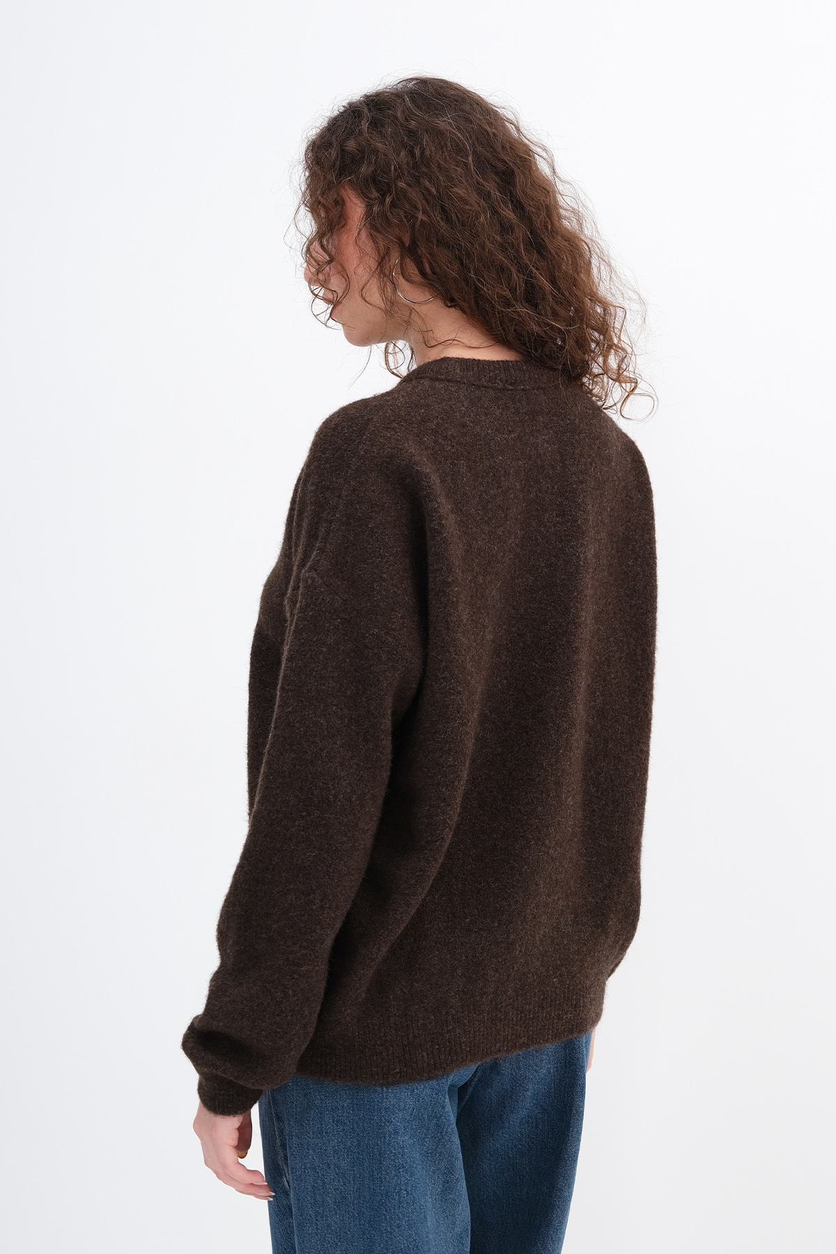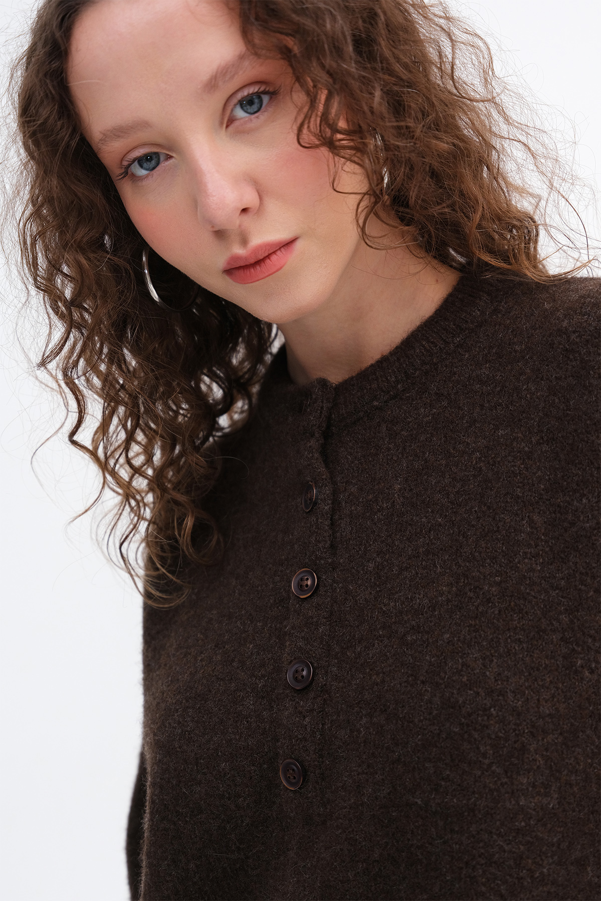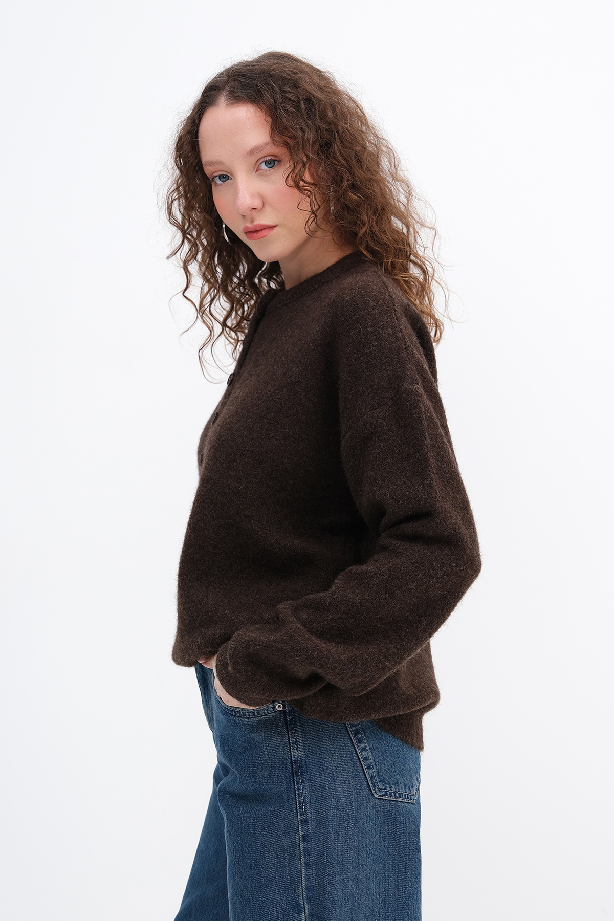 * Düşük omuz, düğmeli, triko kazak,