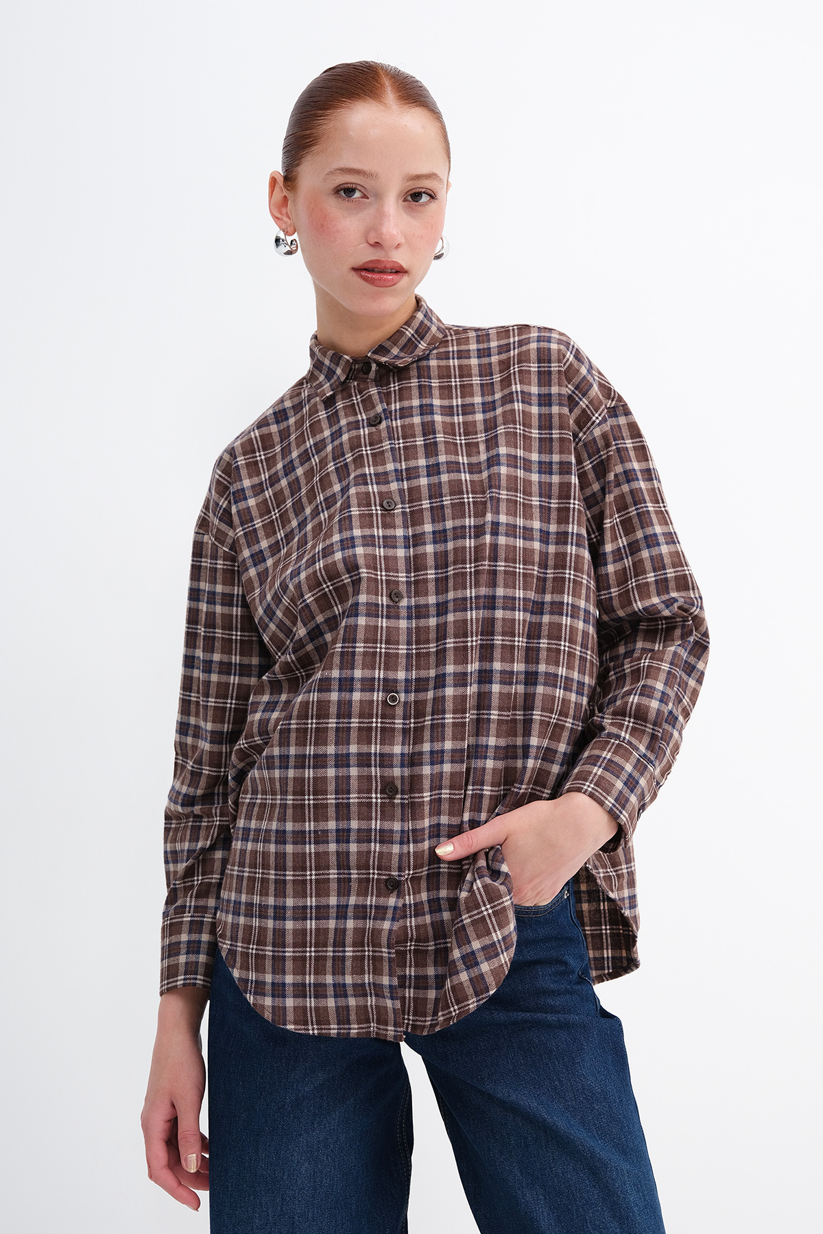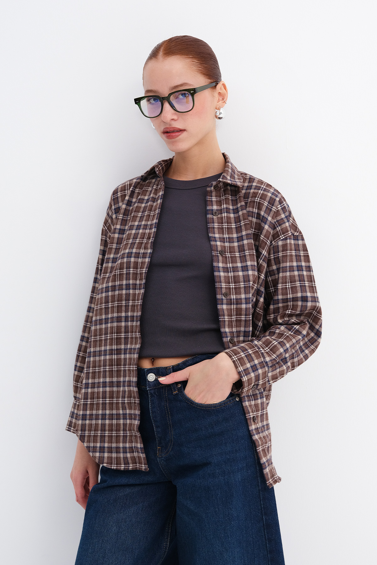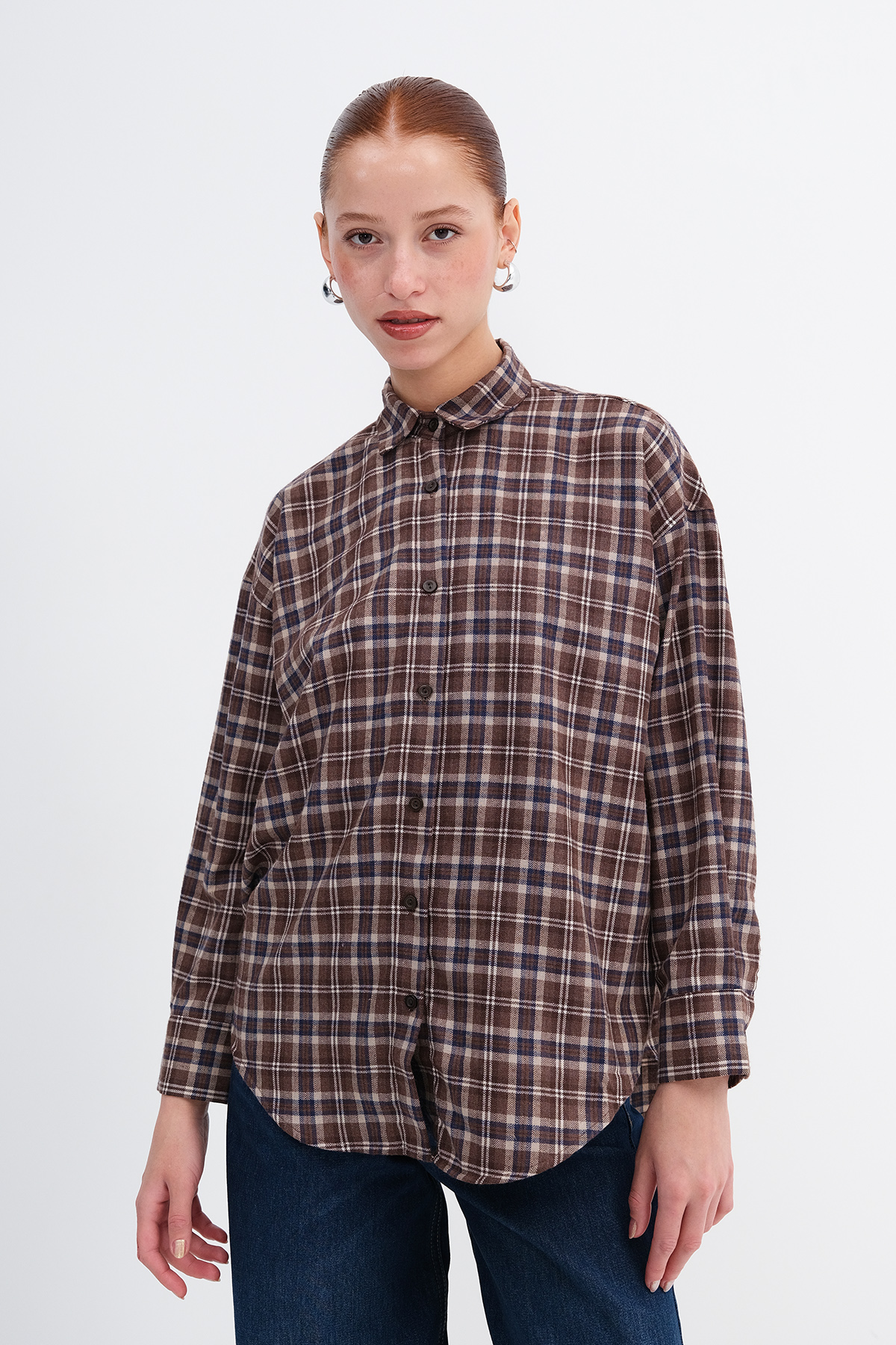 * Düğmeli, ekoseli, rahat kalıp gömlek,