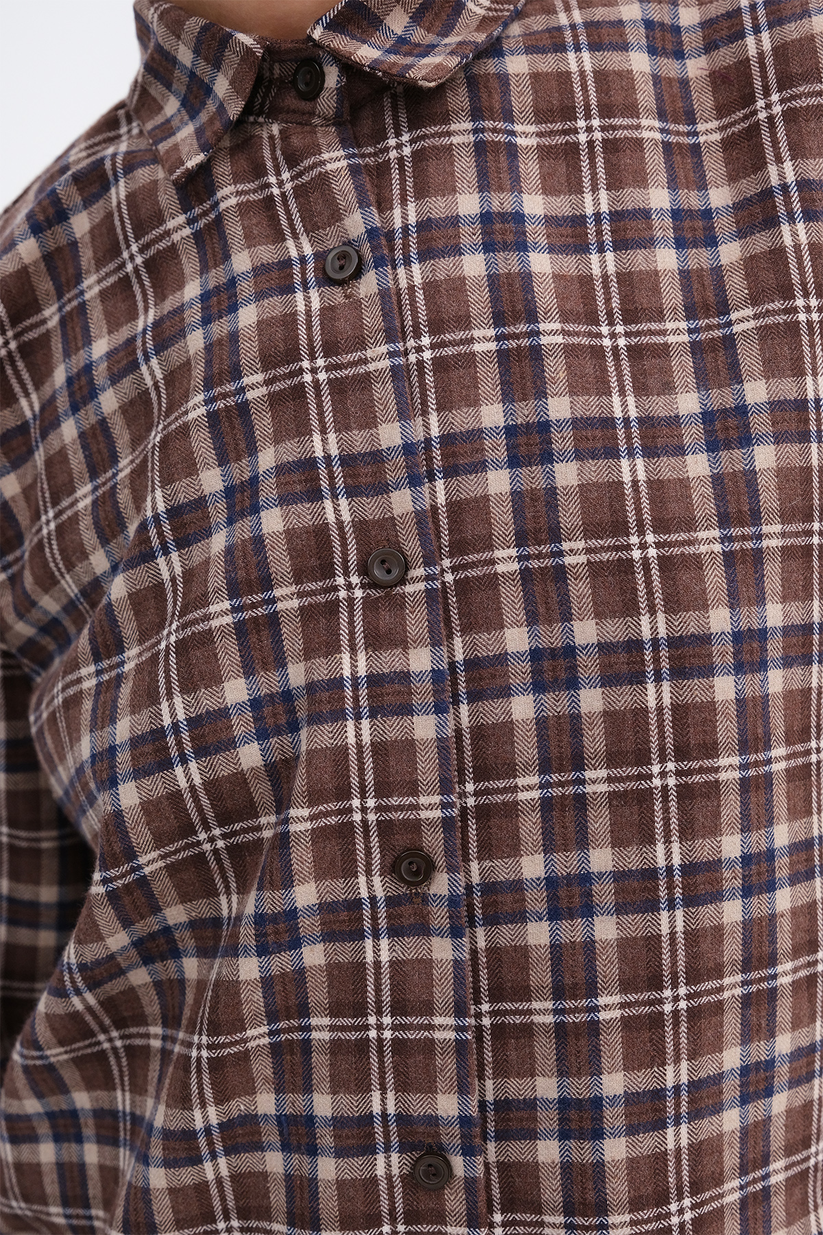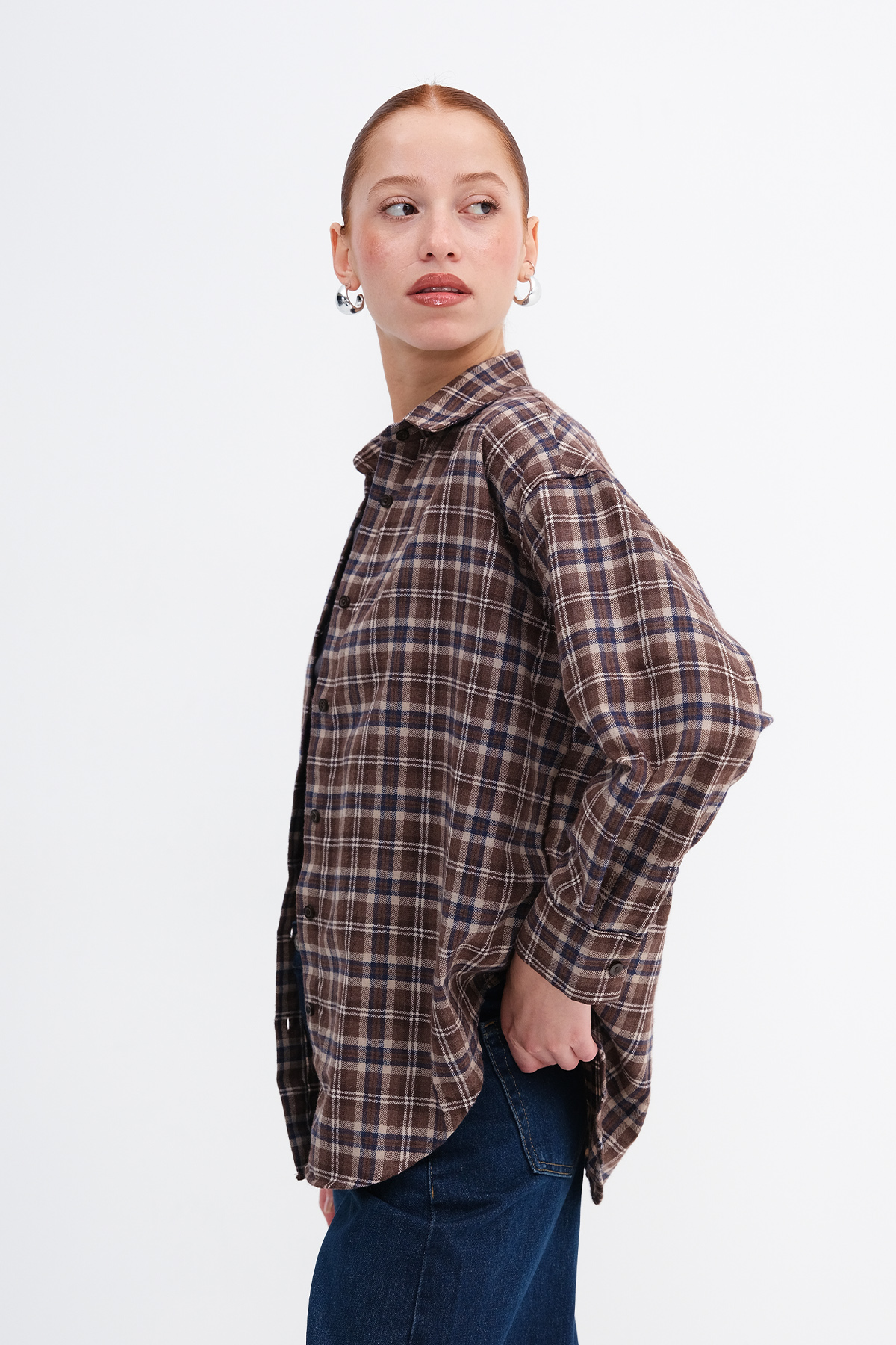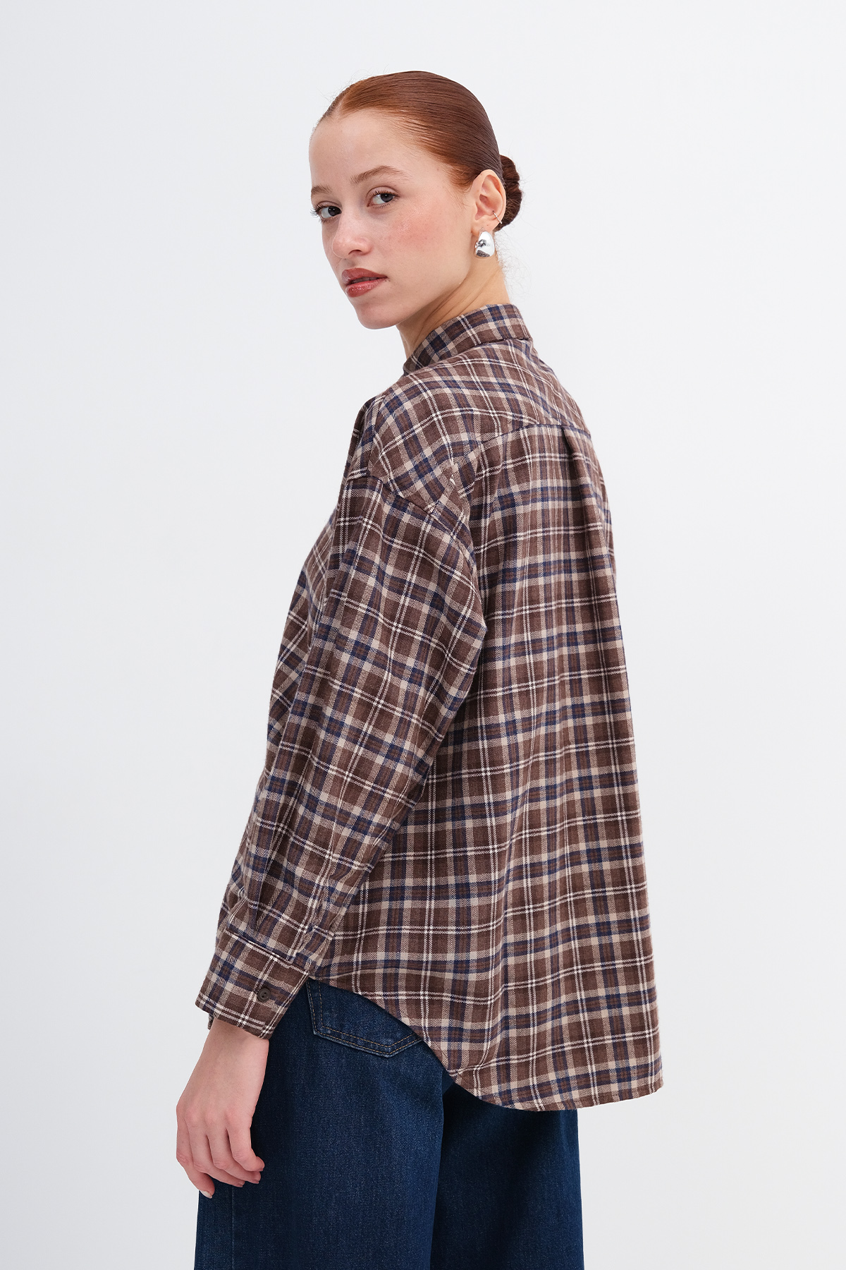 * Düğmeli, ekoseli, rahat kalıp gömlek,