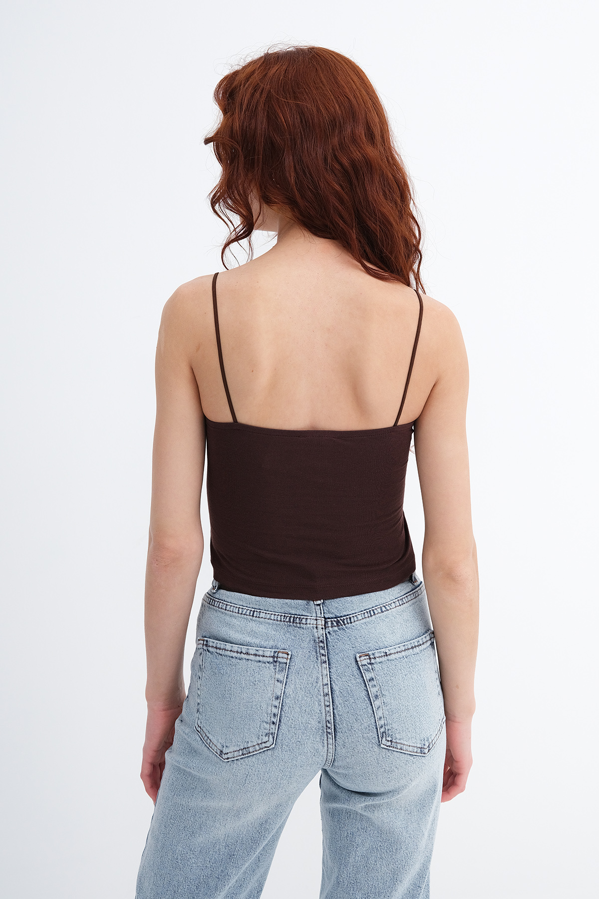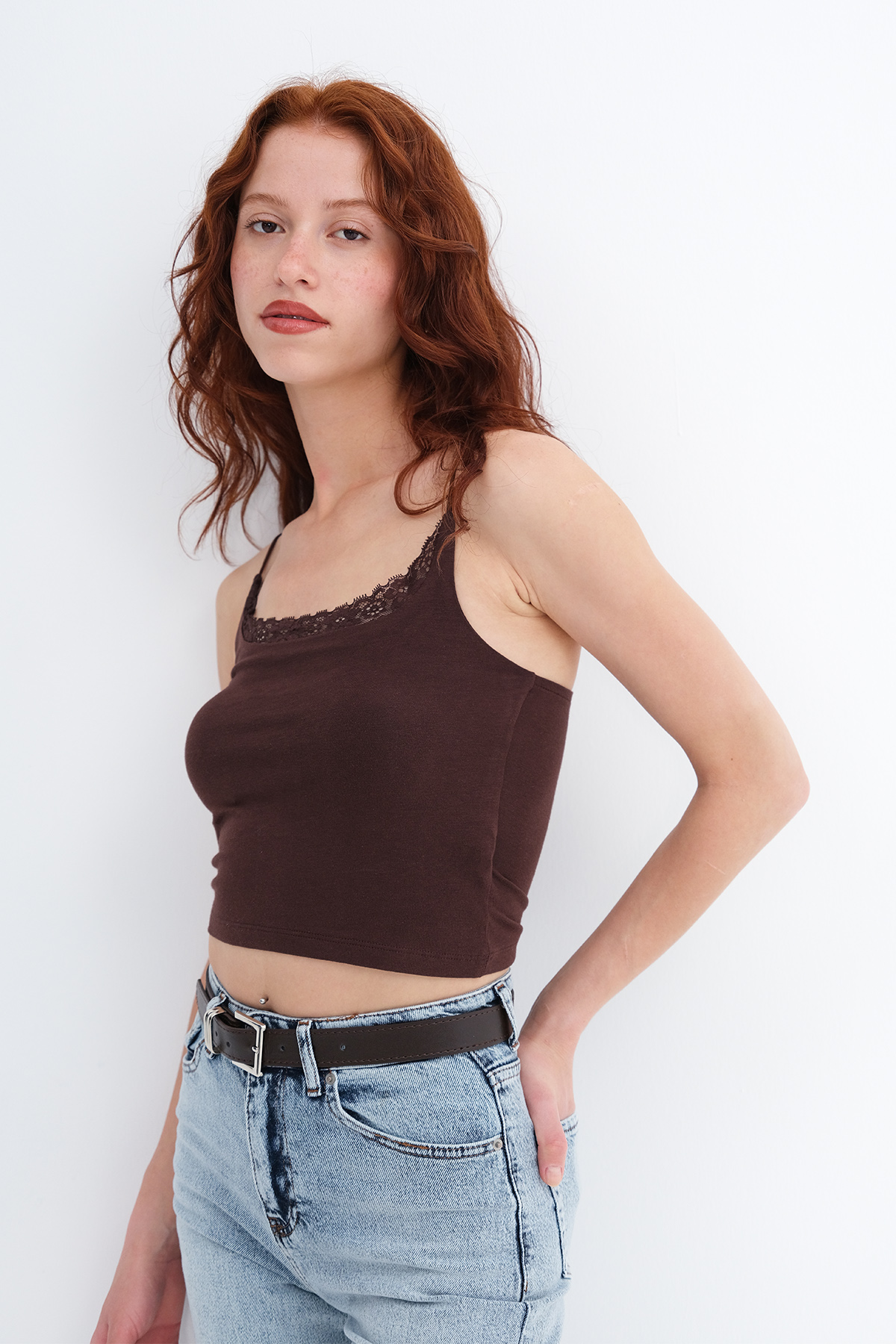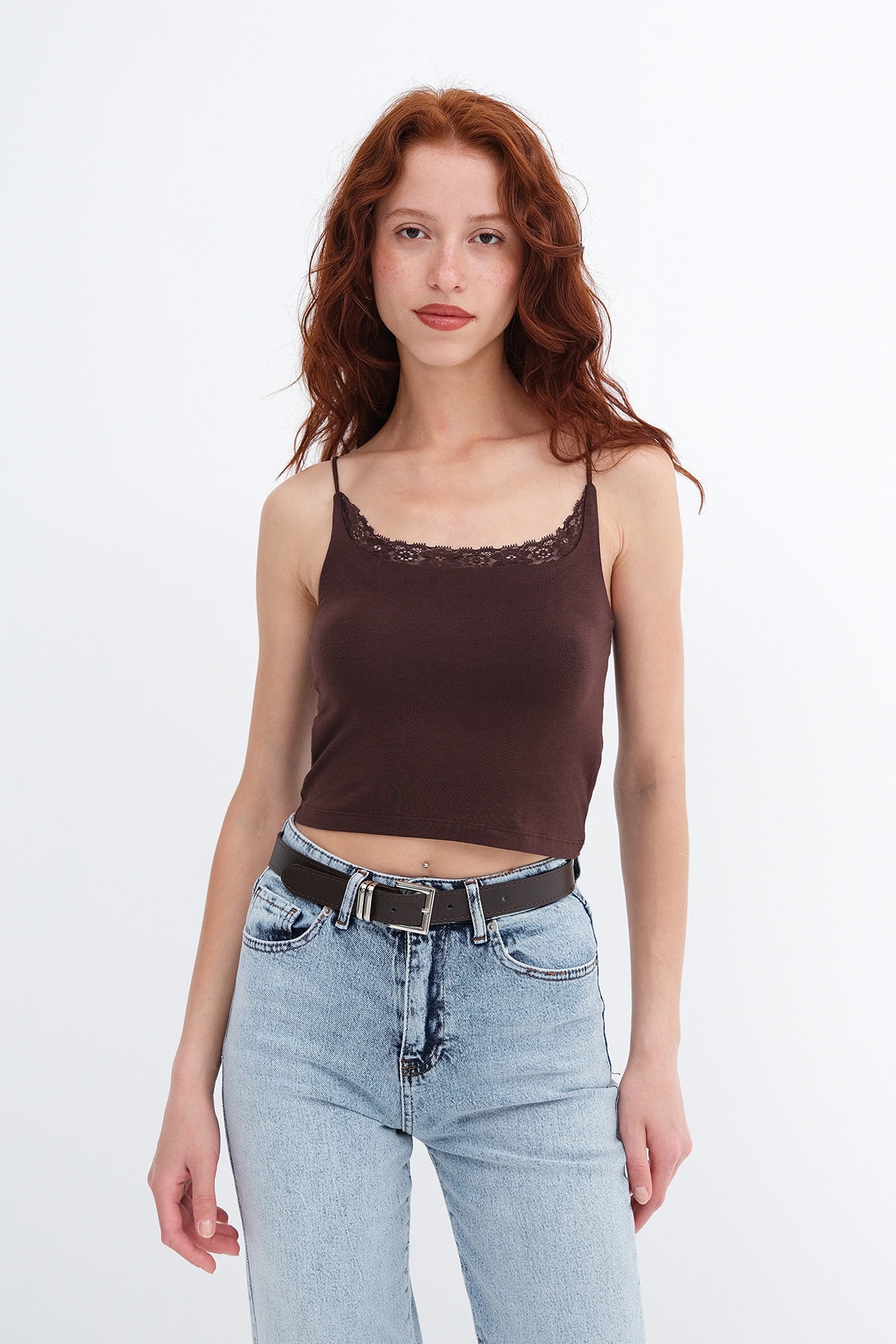 * U yaka, ince askılı, yakası dantelli,