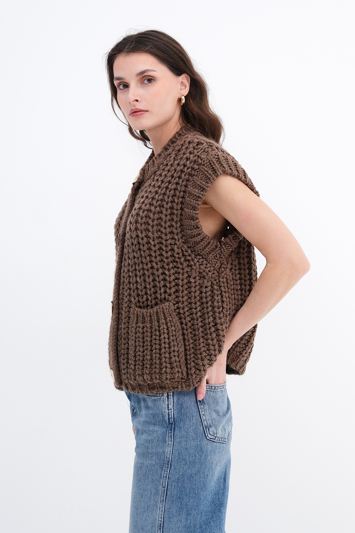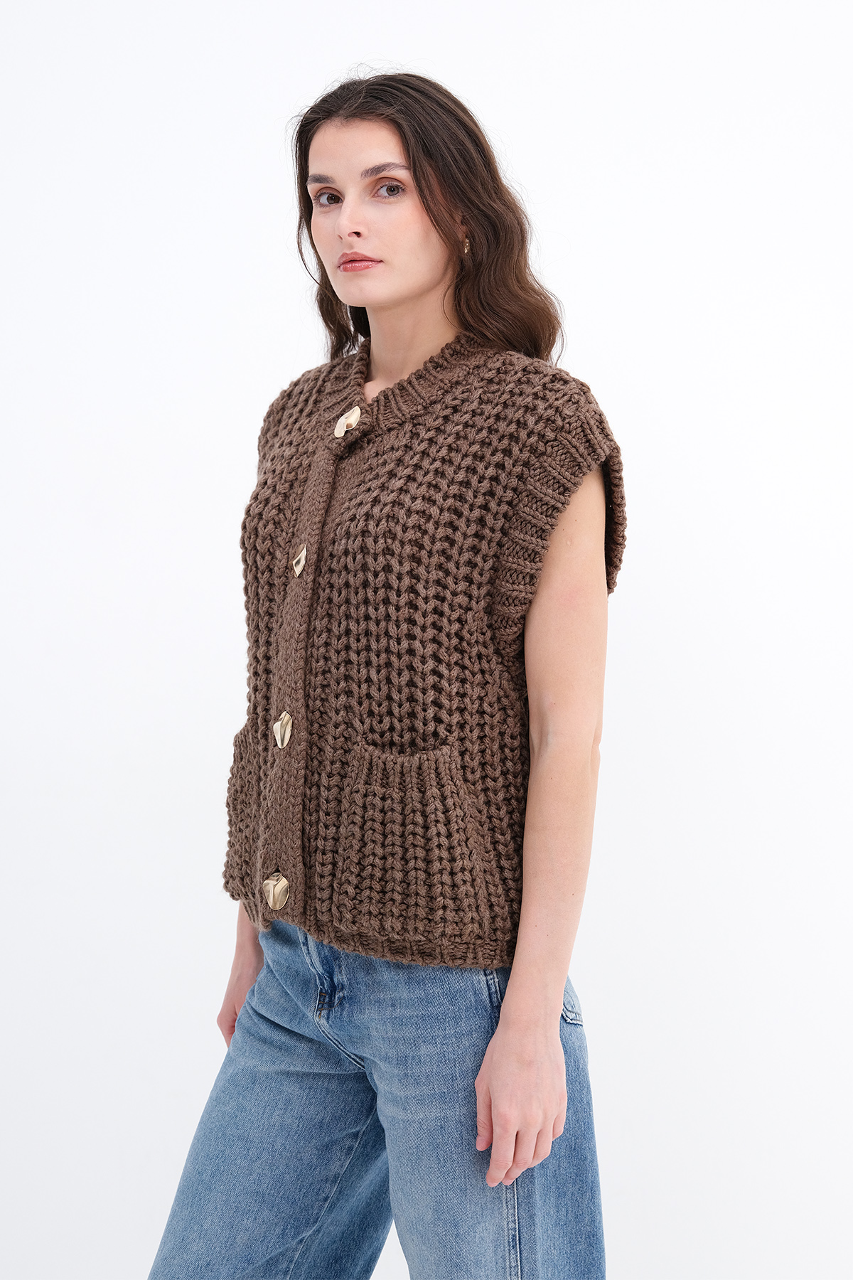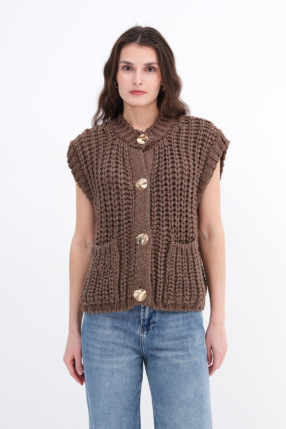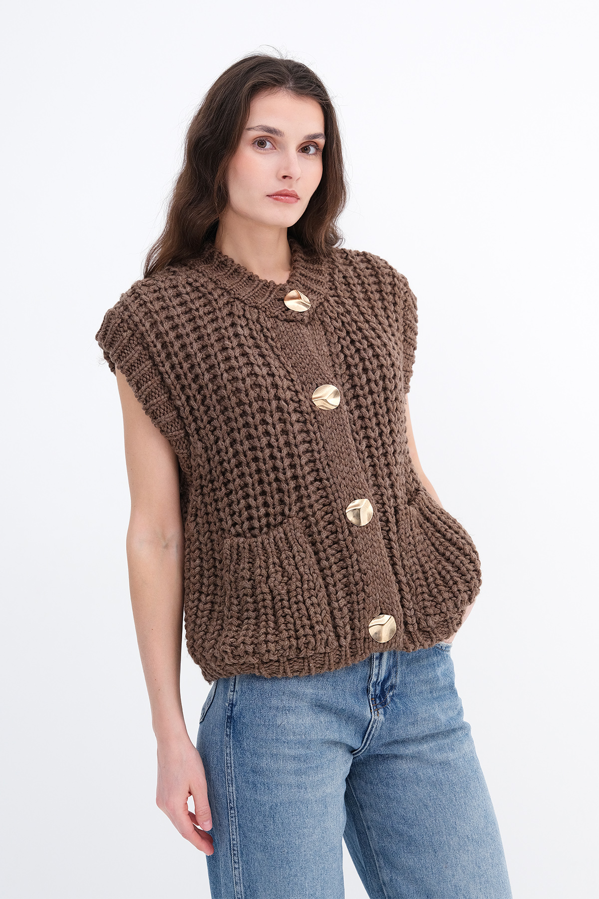 * Gold düğmeli, kalın örgü, cepli yelek,