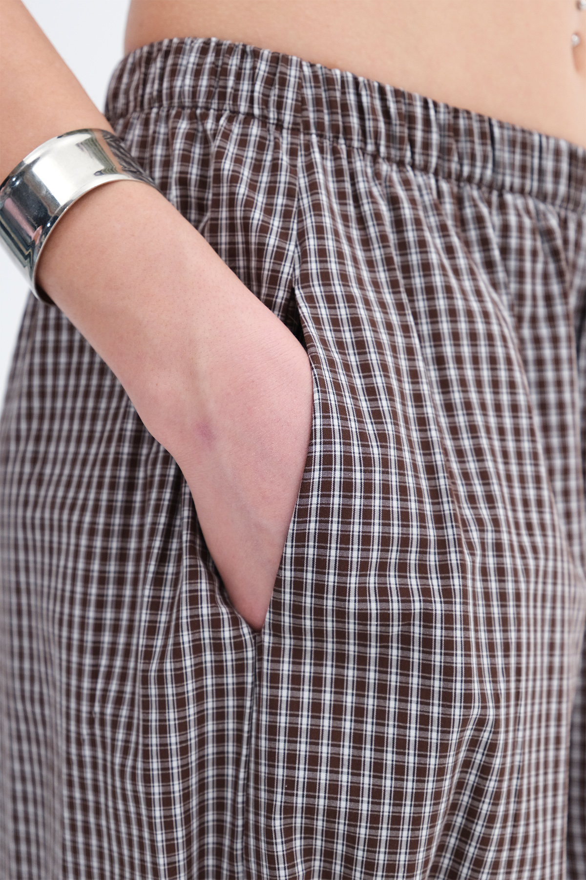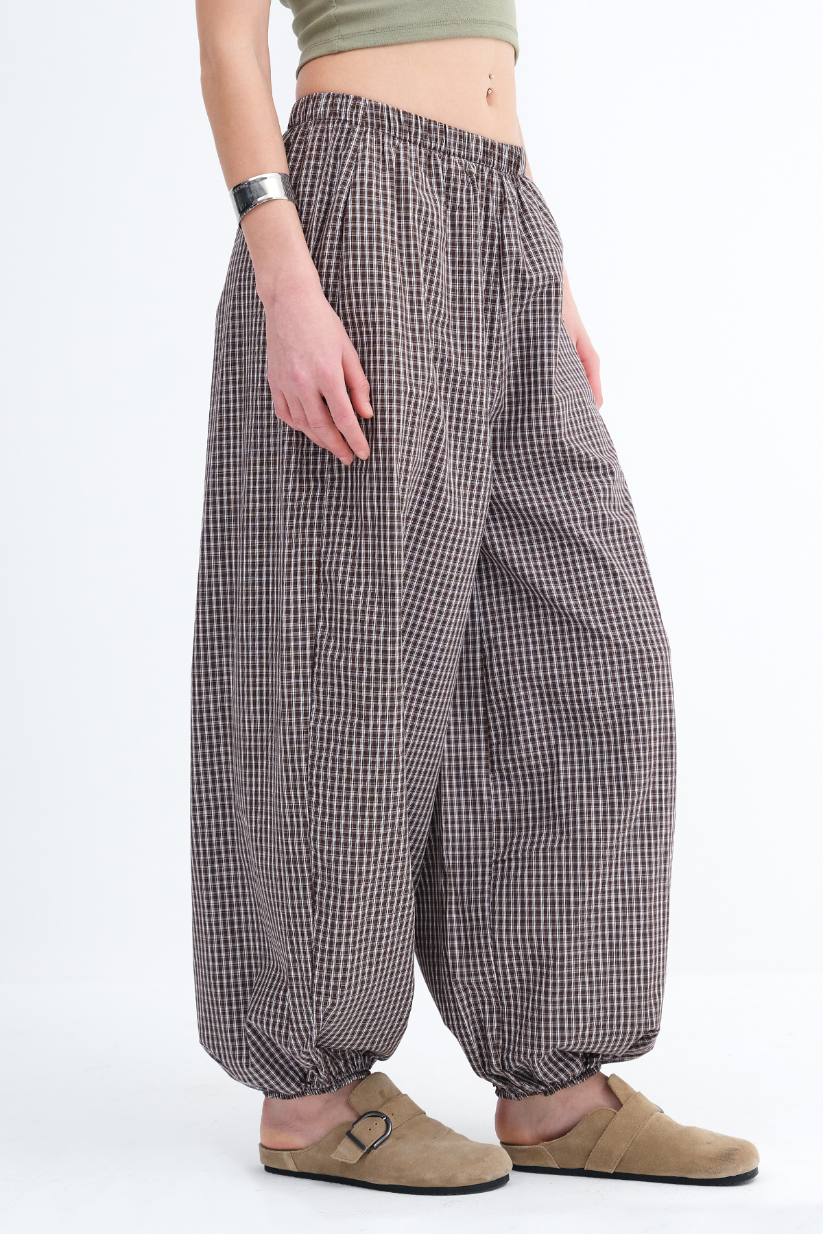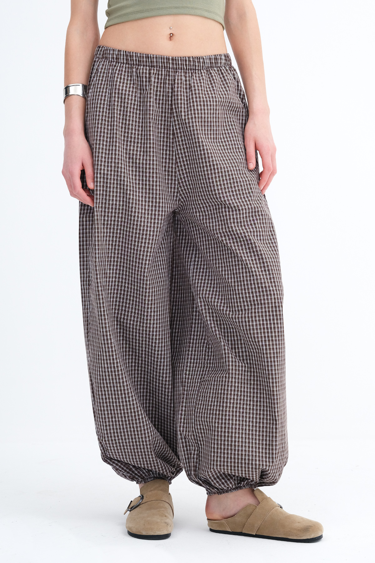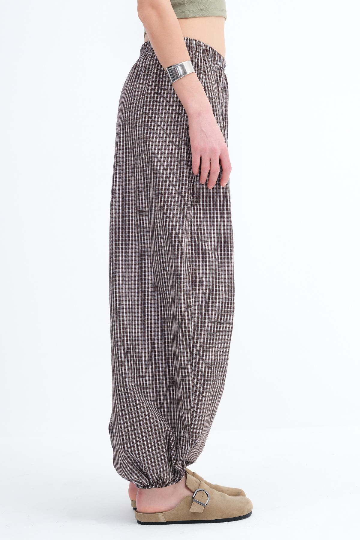 * Kareli, paçası lastikli pantolon,