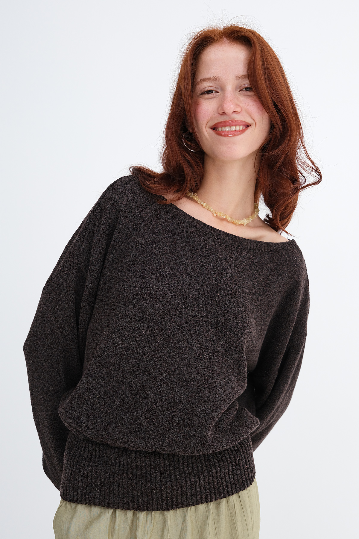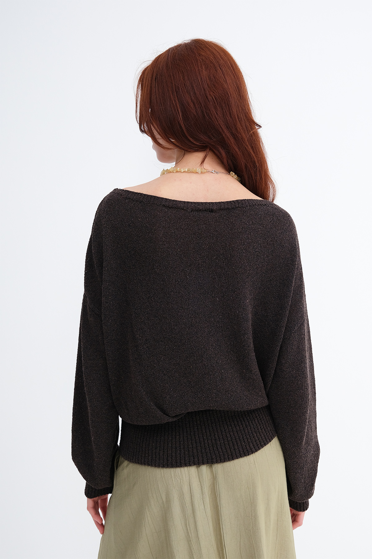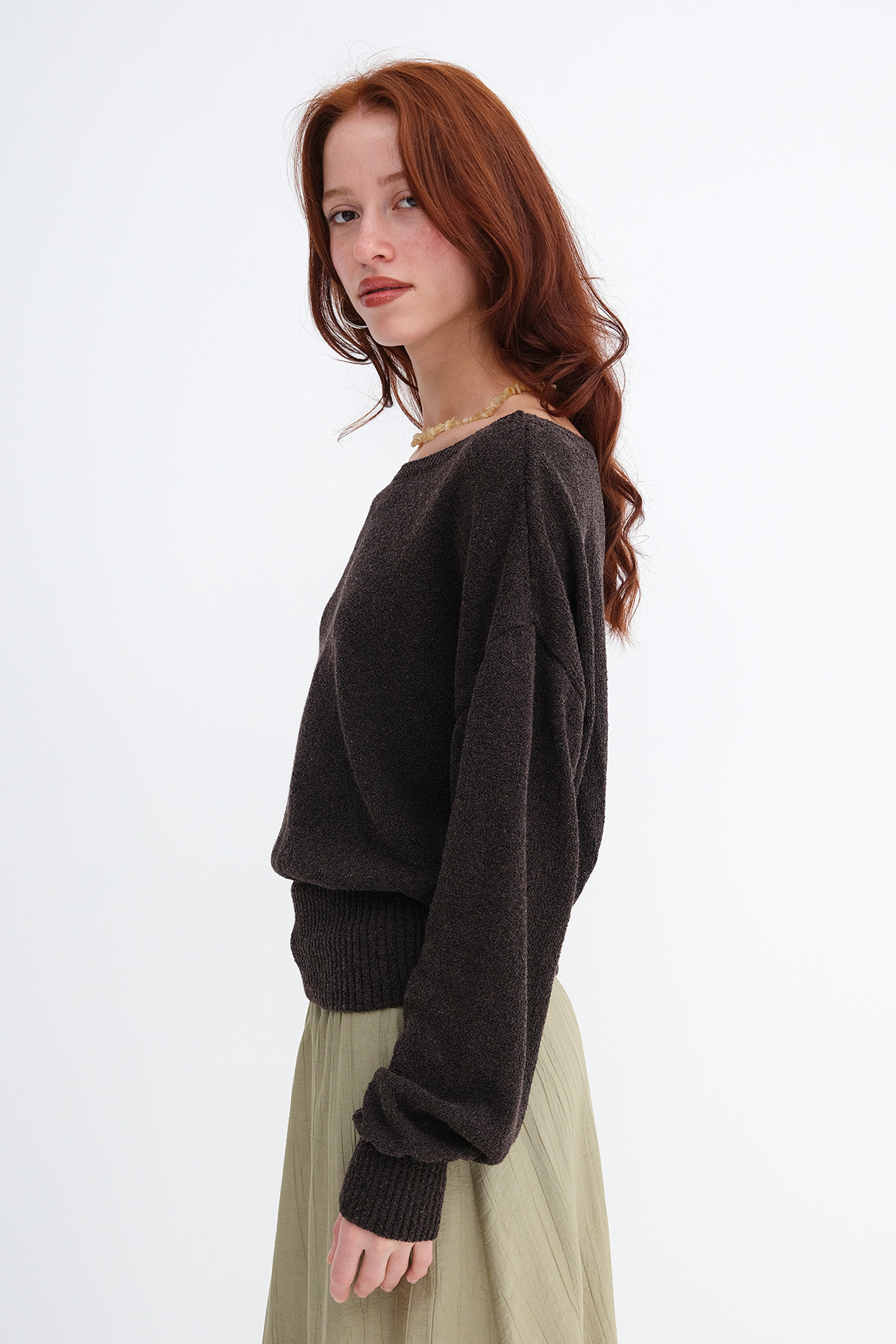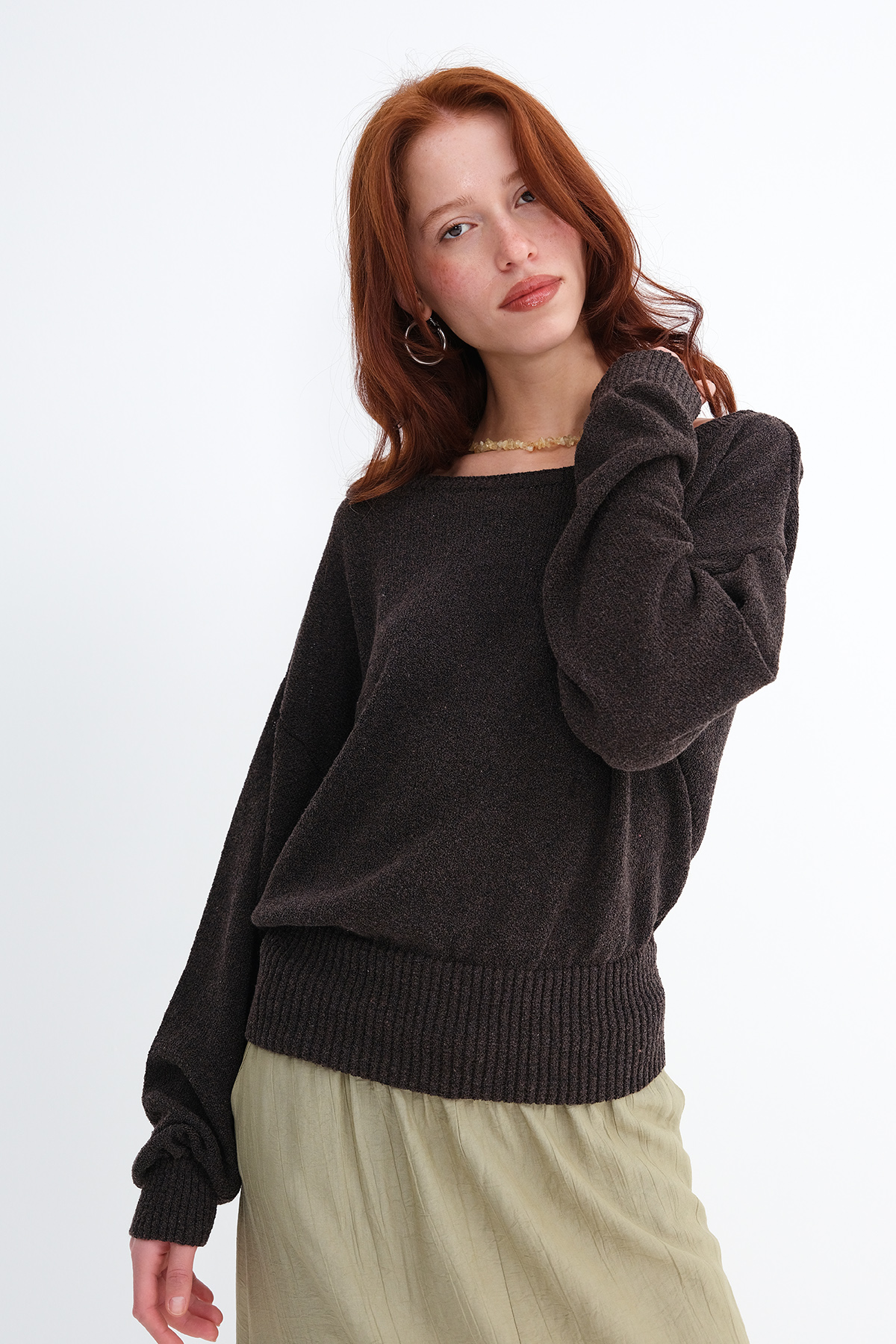 * Kayık yaka, uzun kollu, düşük omuz,