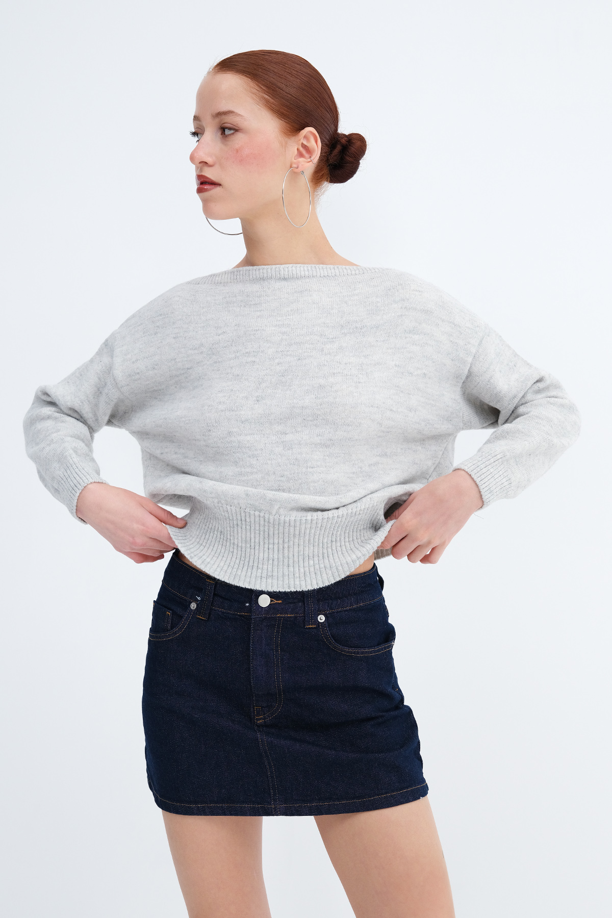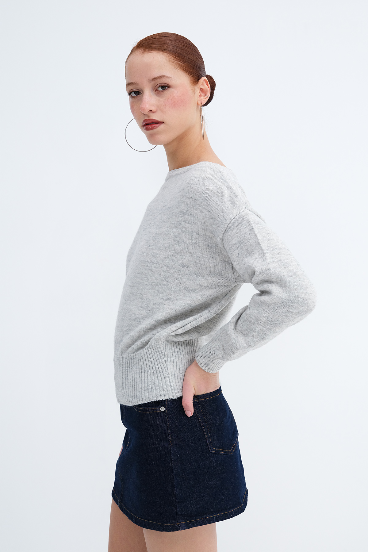* Düz renk, beli lastikli triko kazak,