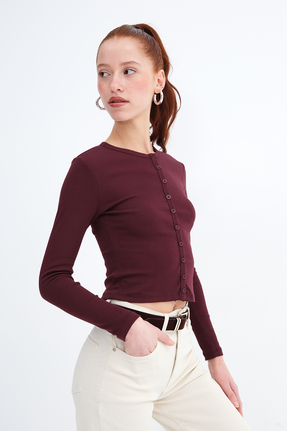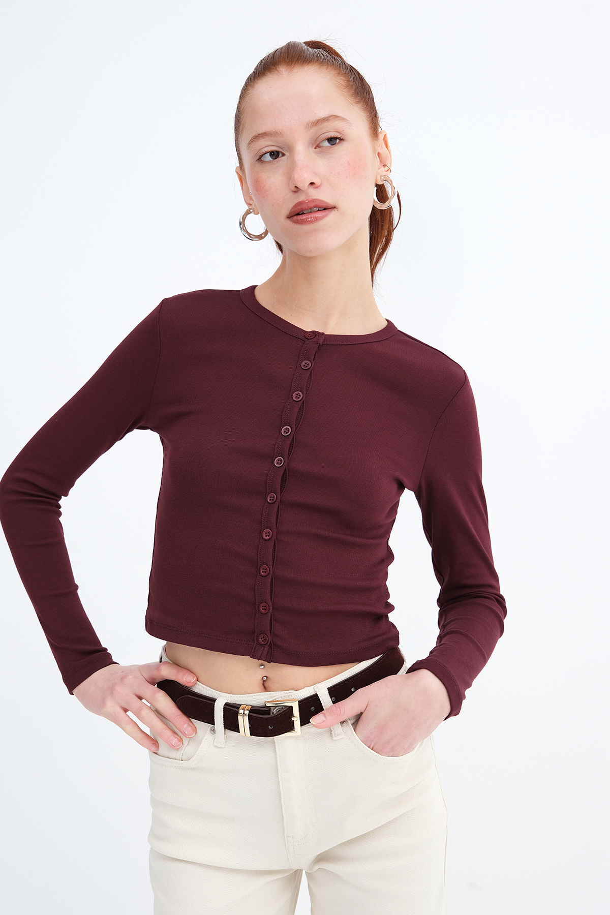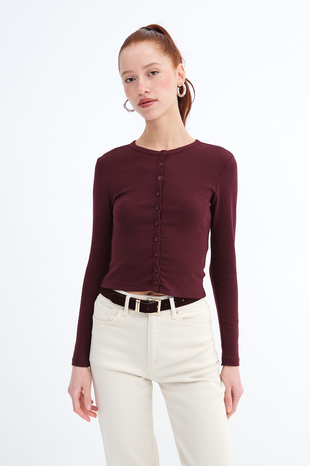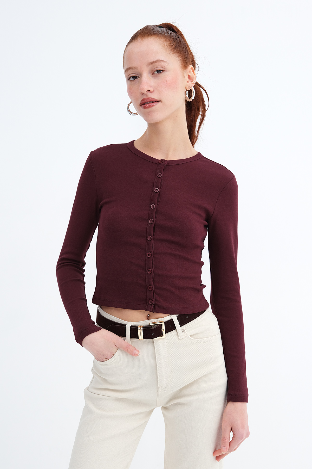 * Düğmeli, düz renk hırka,